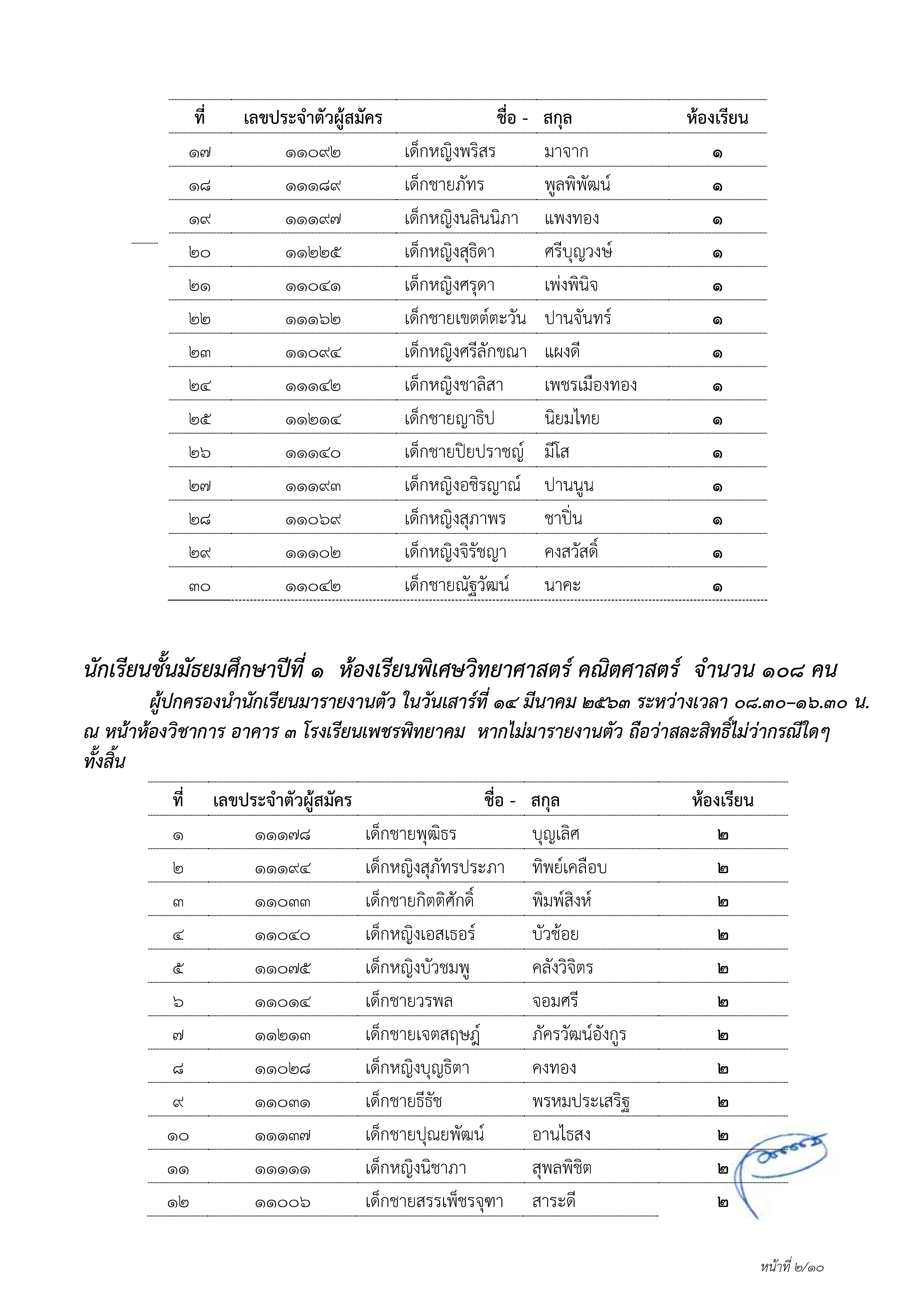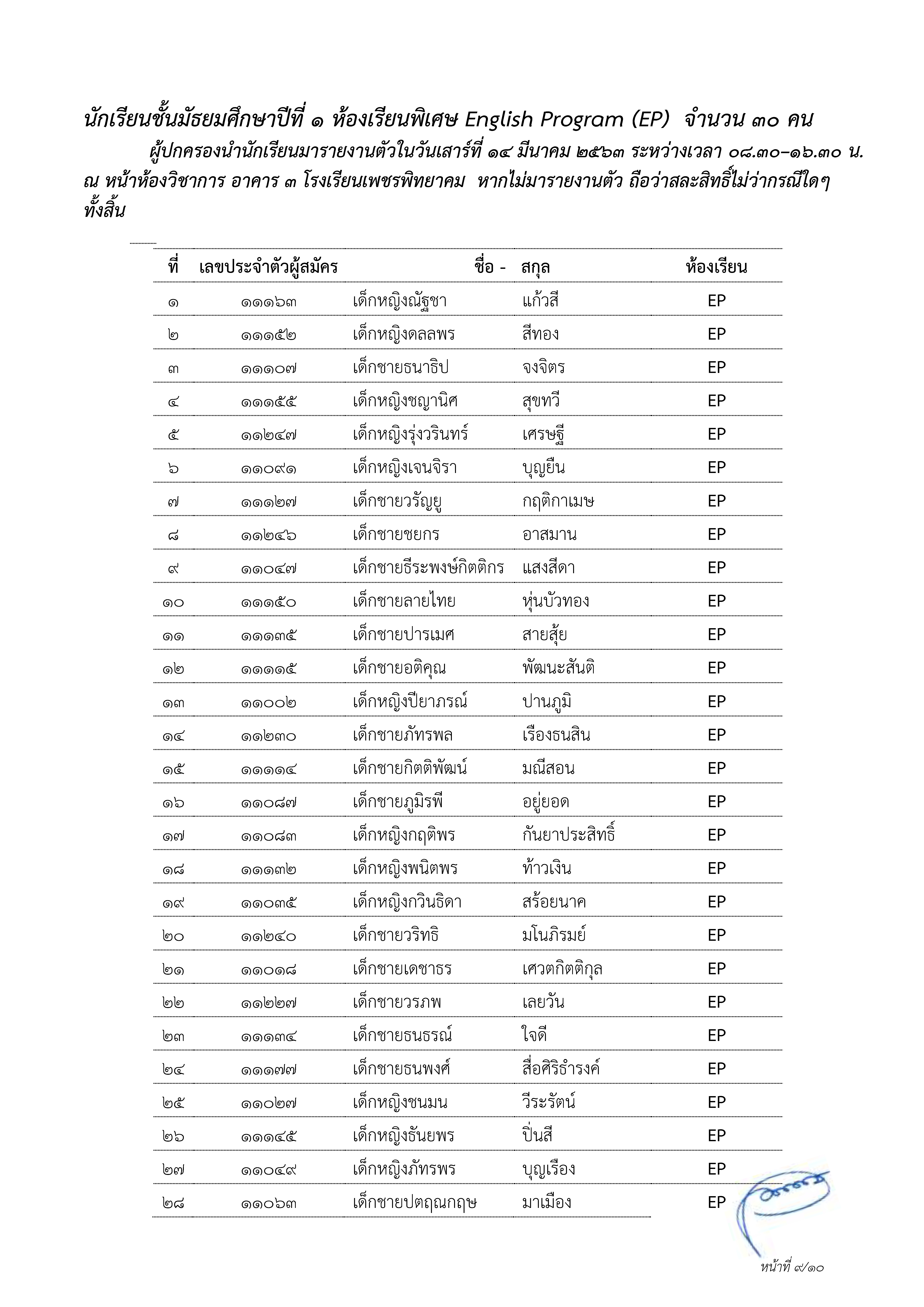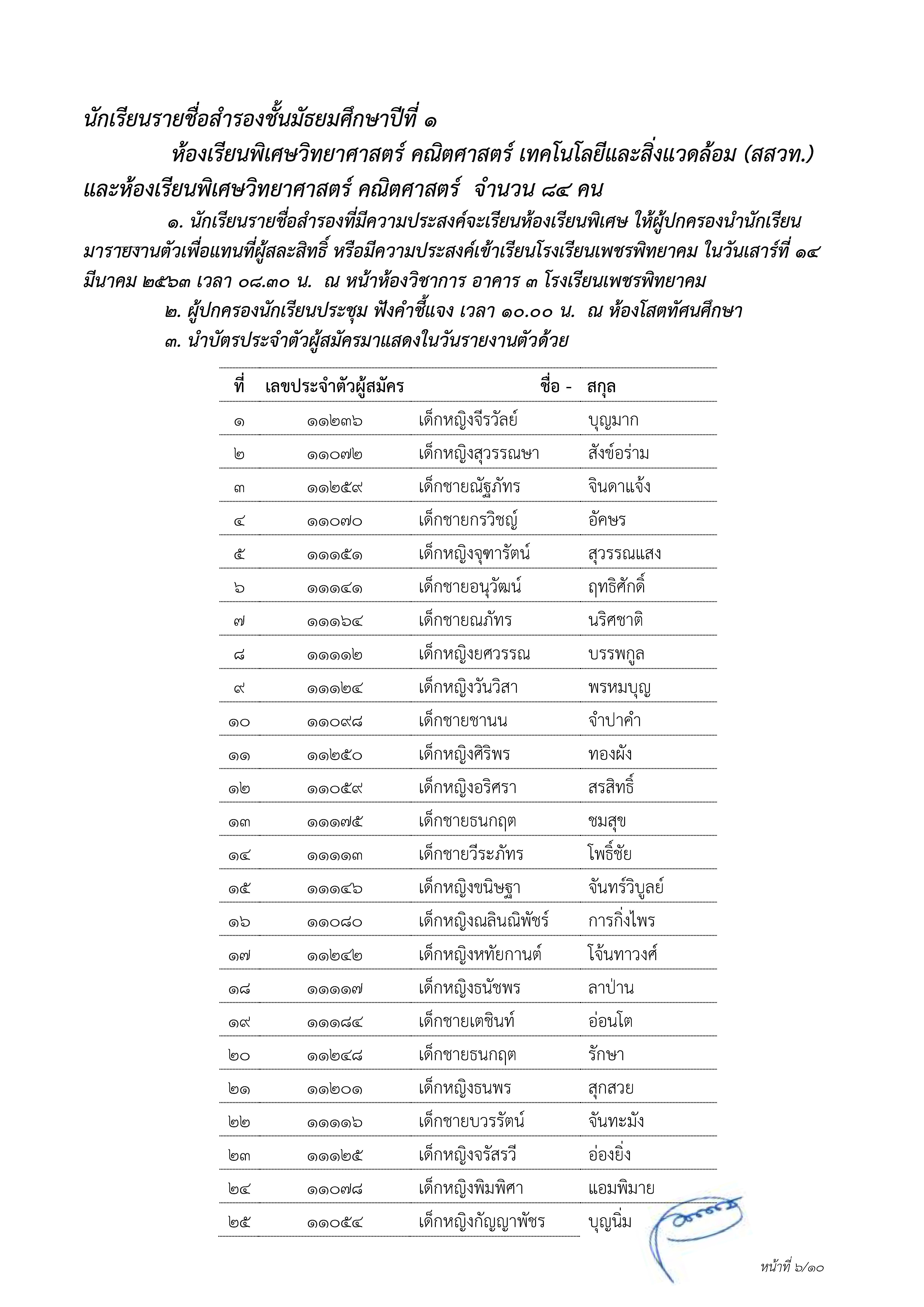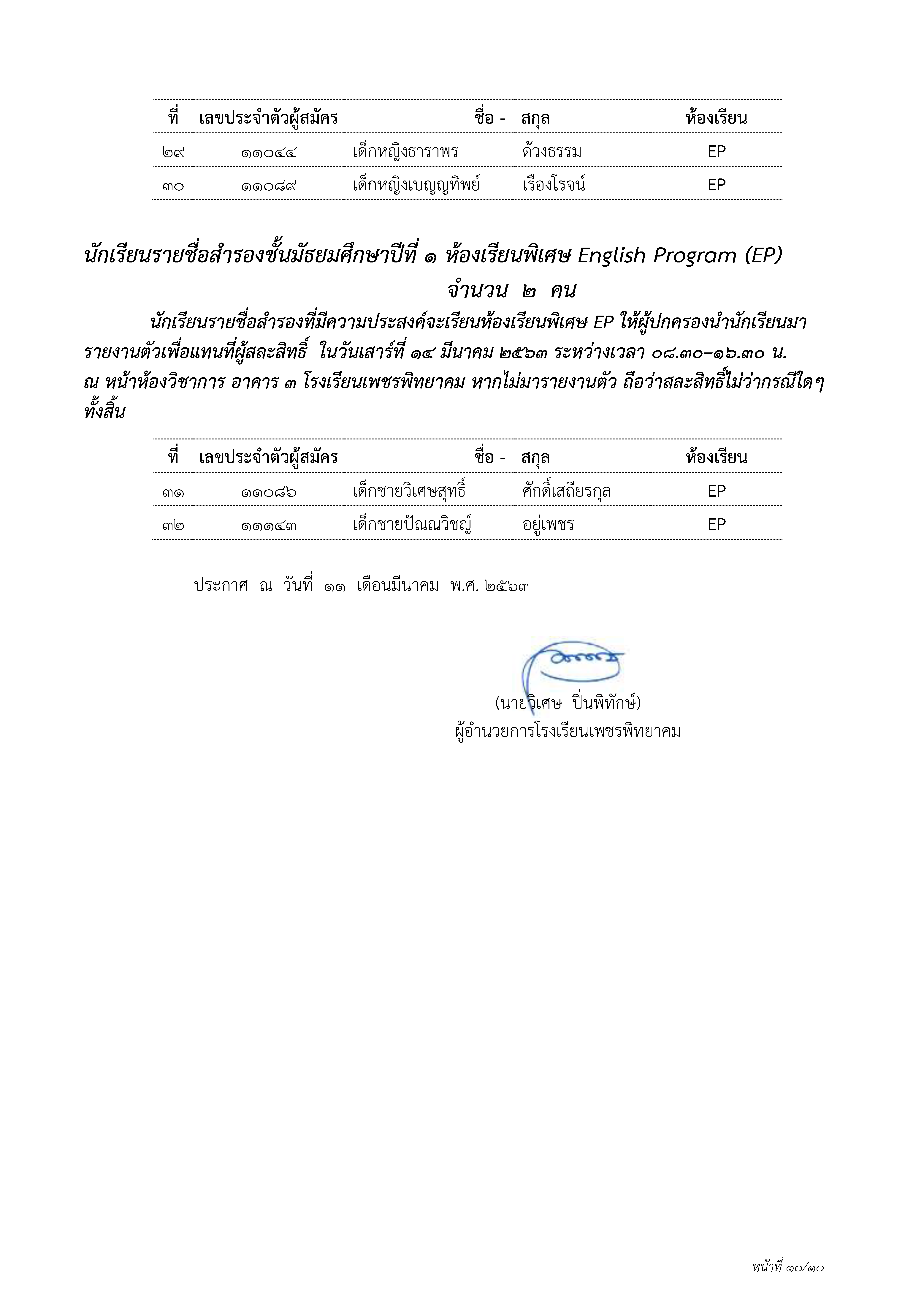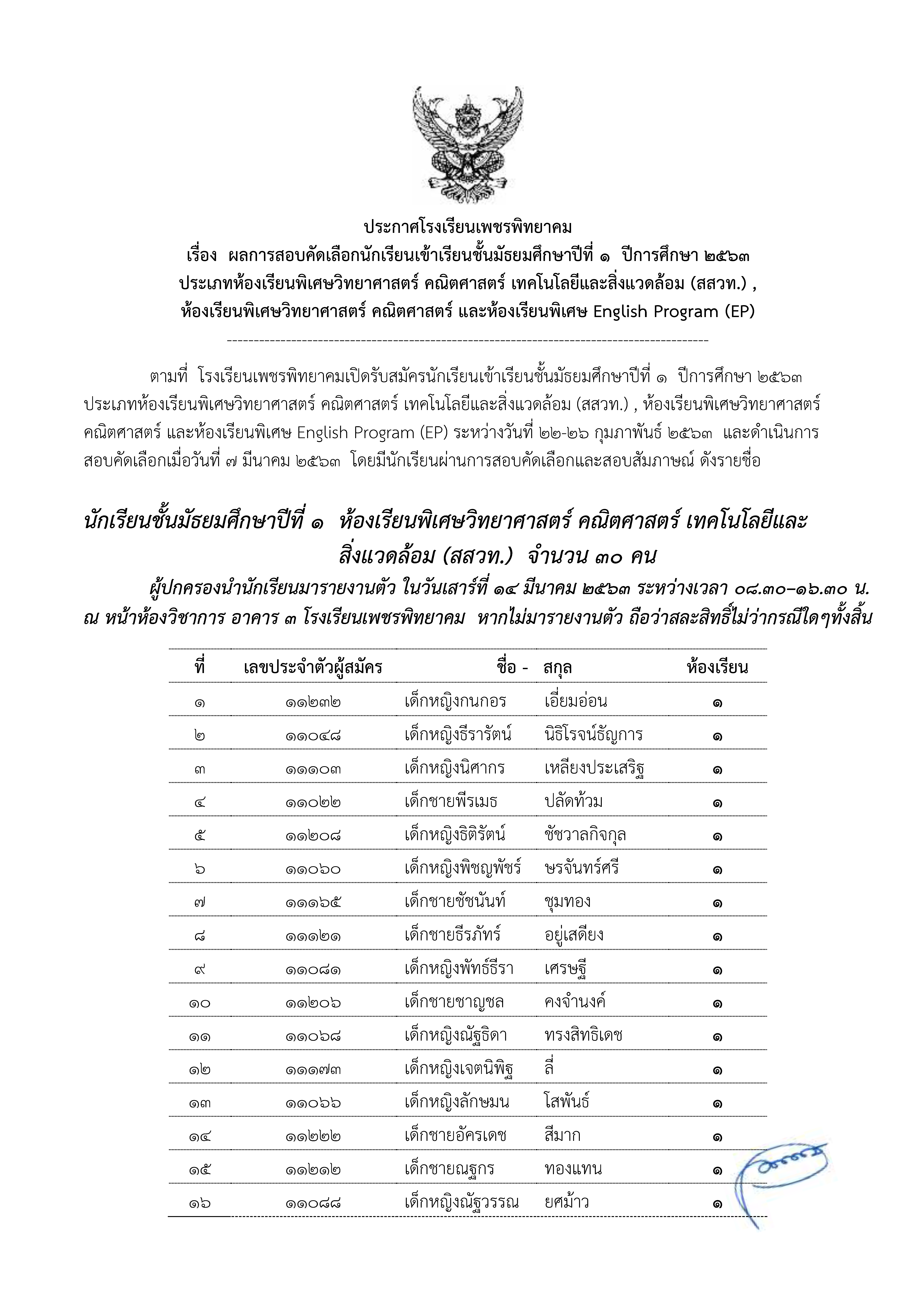 ประกาศโรงเรียนเพชรพิทยาคม เรื่อง ผลการสอบคัดเลือกนักเรียนเข้าเรียนชั้นมัธยมศึกษาปีที่ 1 ปีการศึกษา 2563 ประเภทห้องเรียนพิเศษ วิทย์-คณิต (สสวท.) , ห้องเรียนพิเศษ วิทย์-คณิต และห้องเรียนพิเศษ English Program (EP)
