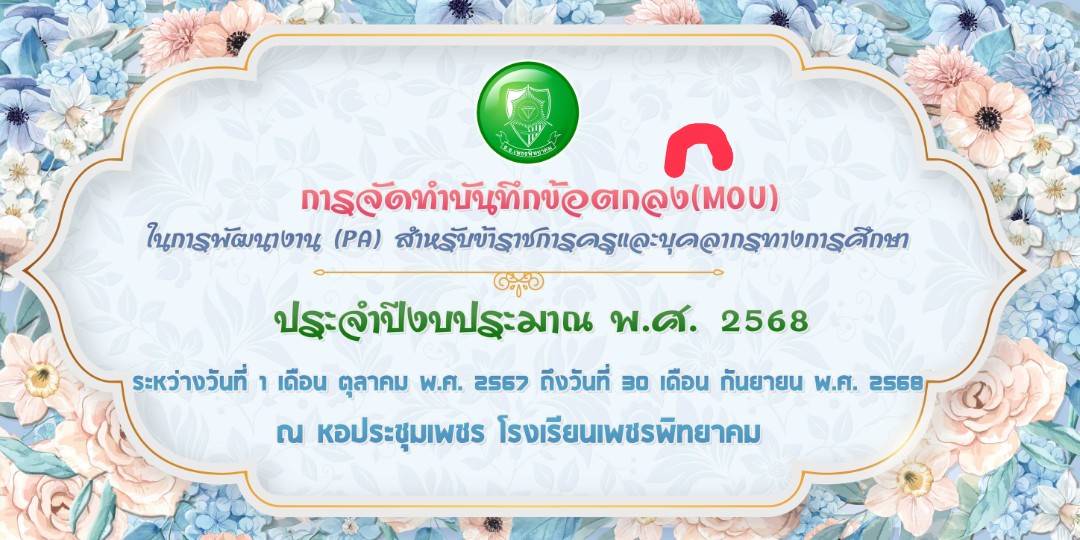 วันที่ 11 มีนาคม 2568 โรงเรียนเพชรพิทยาคม จัดประชุมข้าราชการครูและบุคลากรทางการศึกษา พร้อมดำเนินการลงนามบันทึกข้อตกลง (MOU) ในการพัฒนางาน (PA) ประจำปีงบประมาณ 2568 ครอบคลุมระยะเวลาตั้งแต่วันที่ 1 ตุลาคม 2567 ถึง 30 กันยายน 2568