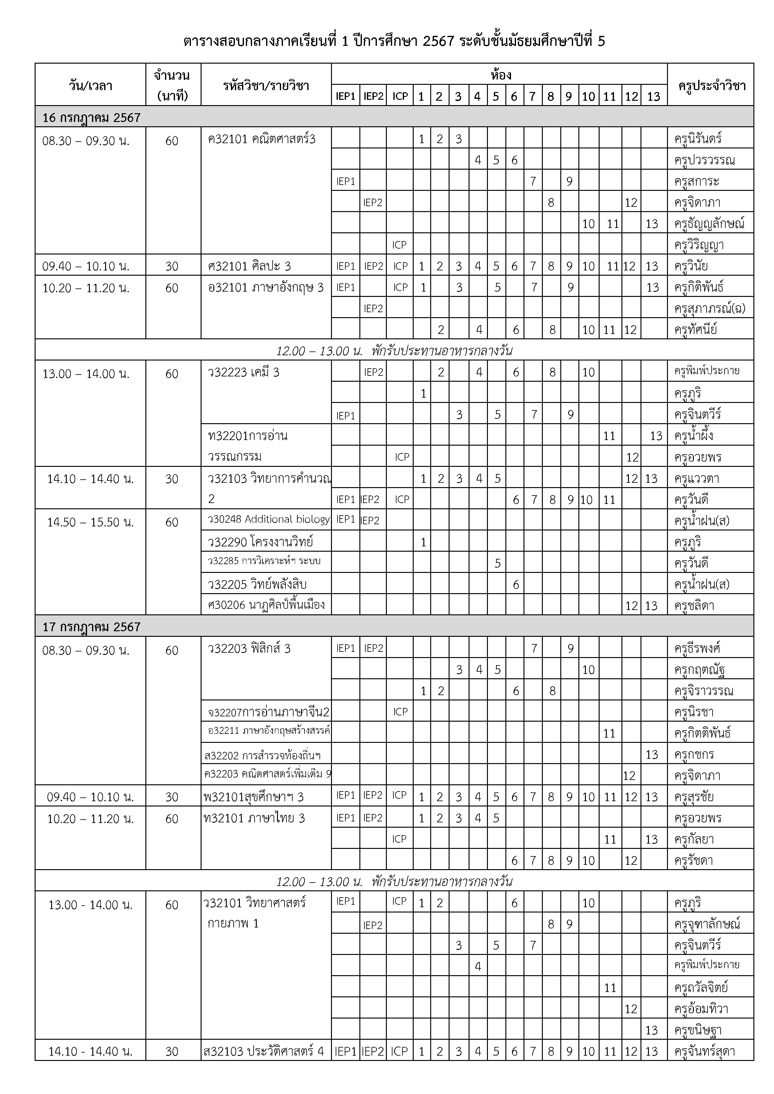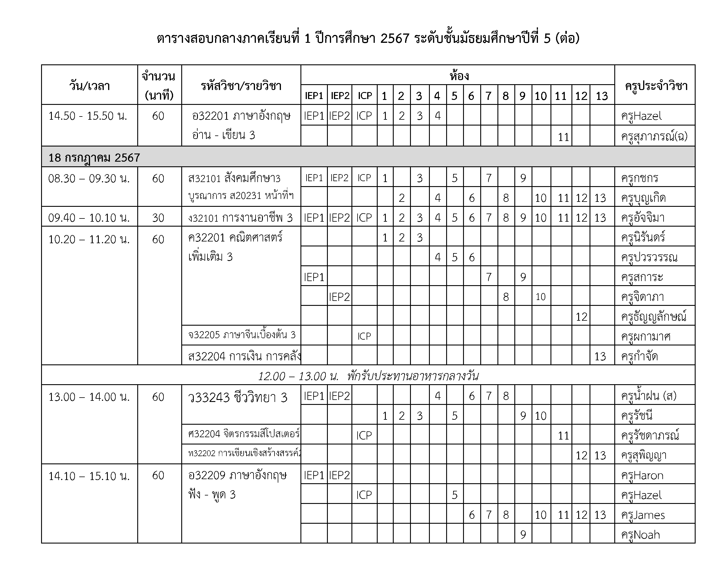 ตารางสอบกลางภาคเรียนที่ 1 ปีการศึกษา 2567 ระดับชั้นมัธยมศึกษาปีที่ 5 วันที่ 16-17-18 กรกฎาคม 2567