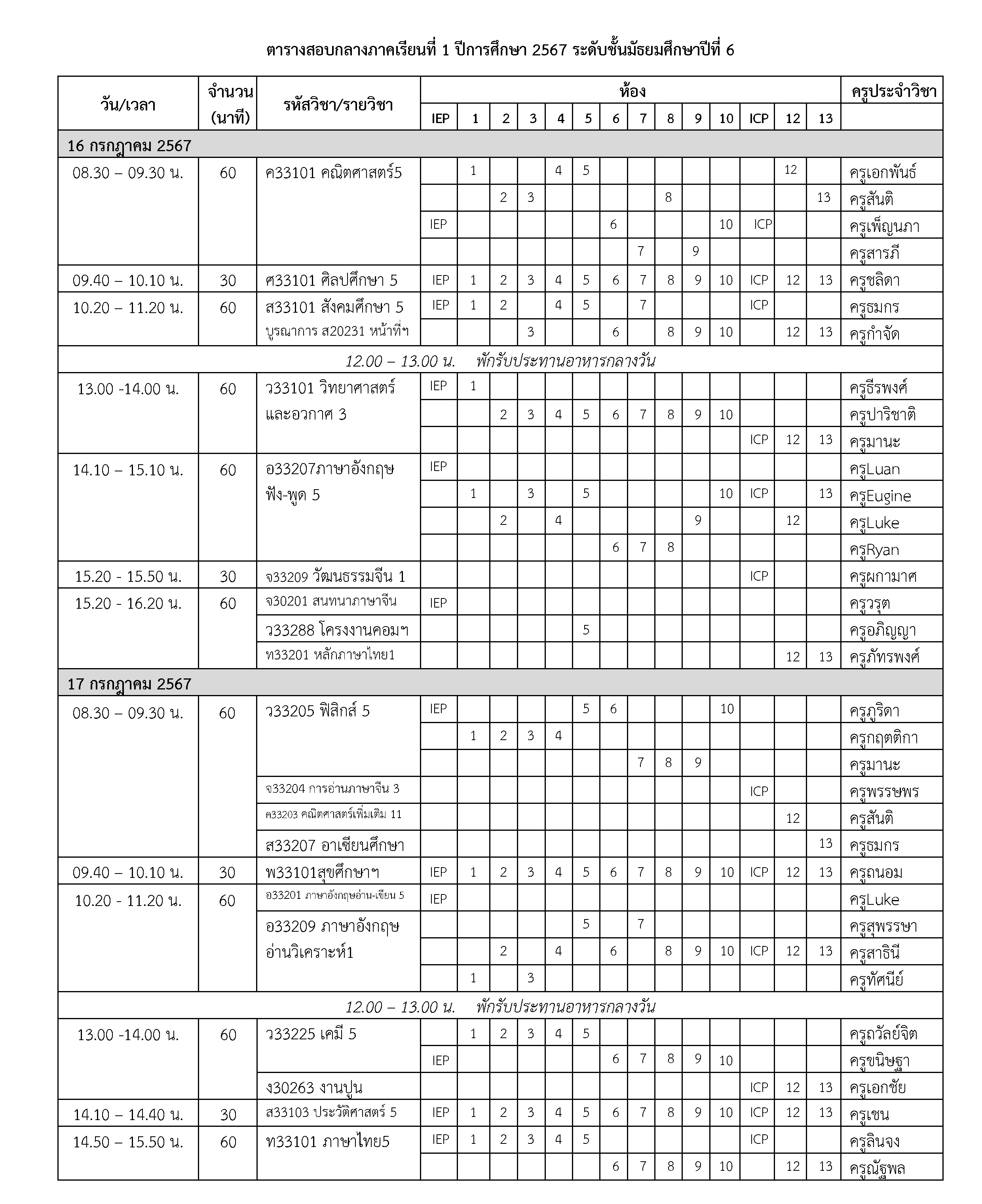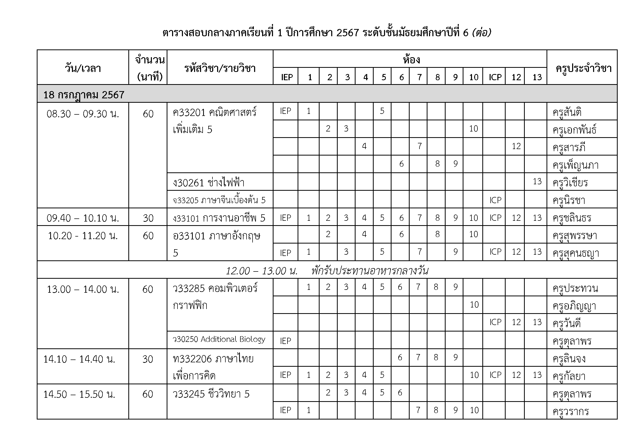ตารางสอบกลางภาคเรียนที่ 1 ปีการศึกษา 2567 ระดับชั้นมัธยมศึกษาปีที่ 6 วันที่ 16-17-18 กรกฎาคม 2567