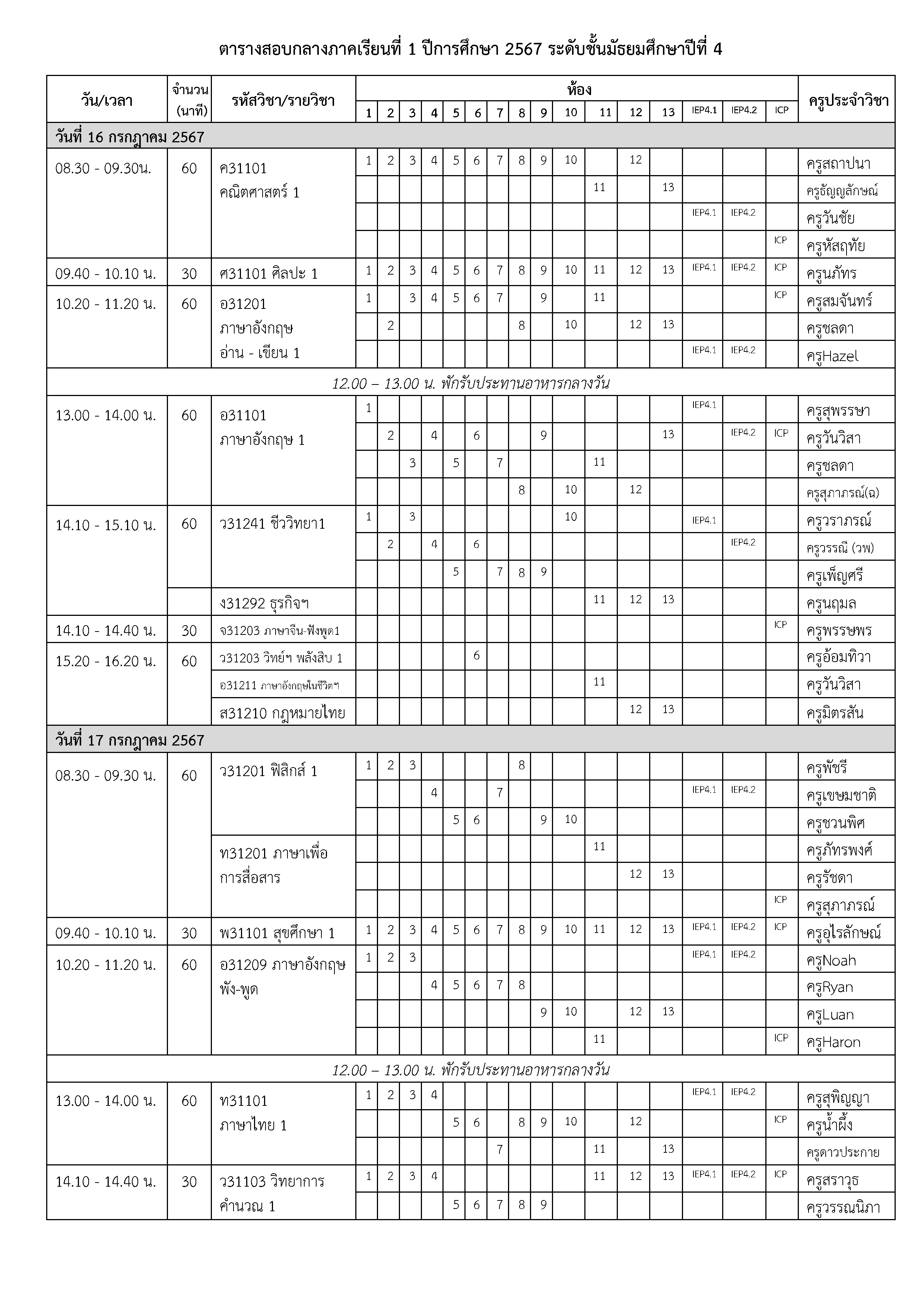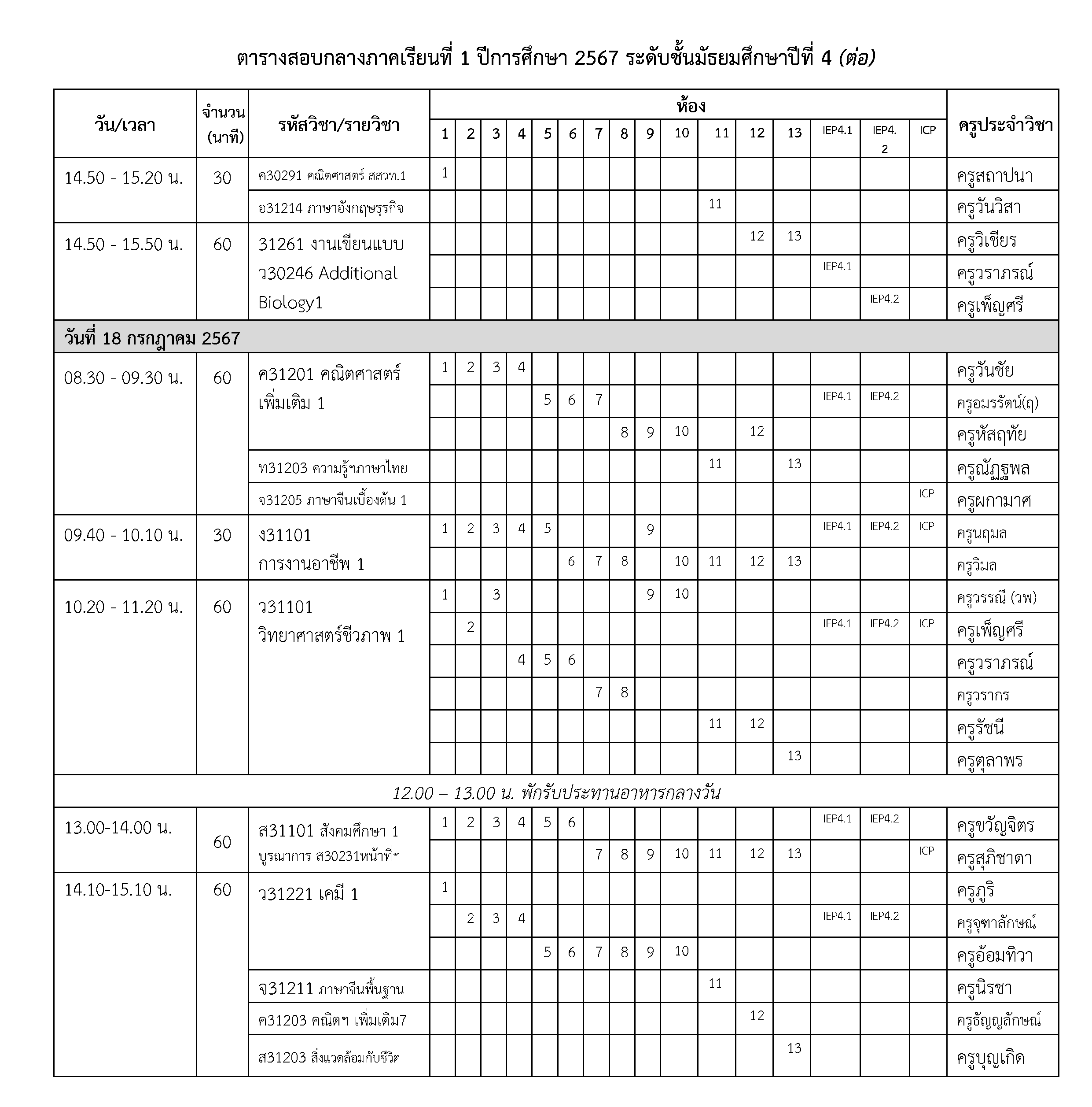 ตารางสอบกลางภาคเรียนที่ 1 ปีการศึกษา 2567 ระดับชั้นมัธยมศึกษาปีที่ 4 วันที่ 16-17-18 กรกฎาคม 2567