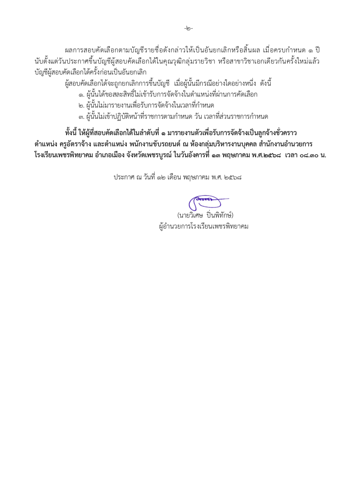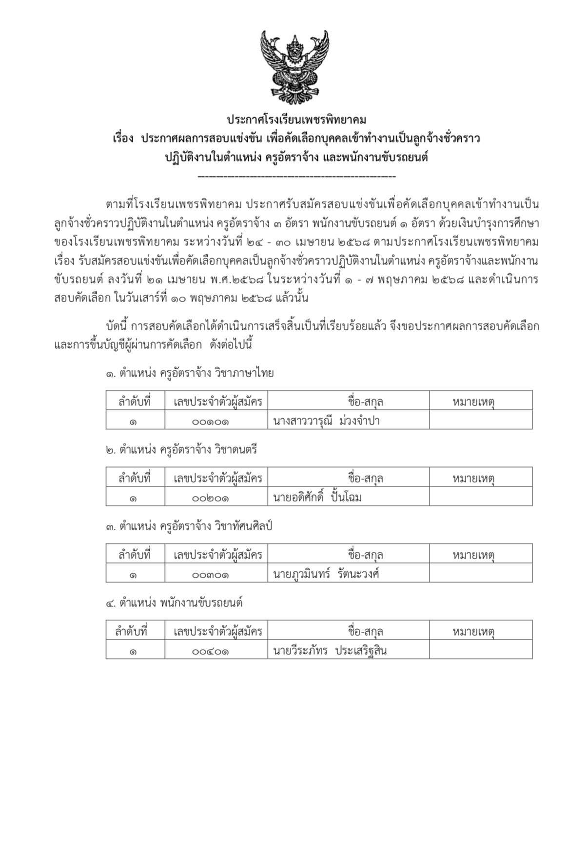 ประกาศโรงเรียนเพชรพิทยาคม เรื่อง ประกาศผลการสอบแข่งขัน เพื่อคัดเลือกบุคคลเข้าทำงานเป็นลูกจ้างชั่วคราว ปฏิบัติงานในตำแหน่ง ครูอัตราจ้าง และพนักงานขับรถยนต์