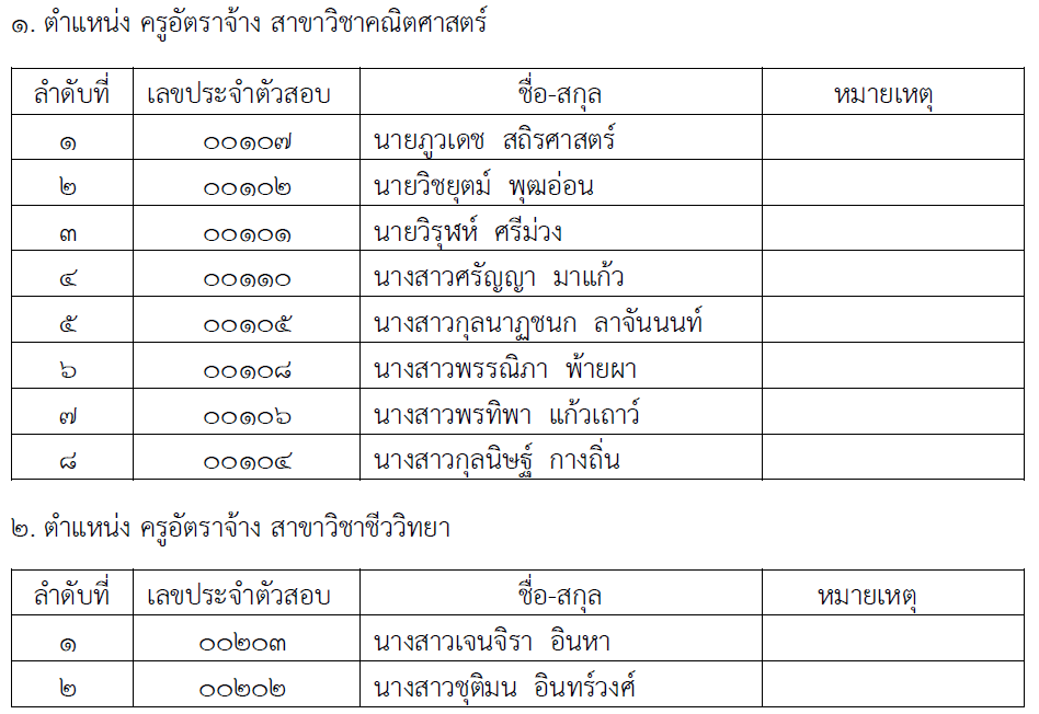 ทั้งนี้ ให้ผู้ที่สอบคัดเลือกได้ในลำดับที่ 1 มารายงานตัวเพื่อรับการจัดจ้างเป็นลูกจ้างชั่วคราว ตำแหน่ง ครูอัตราจ้าง สาขาวิชาคณิตศาสตร์ และสาขาวิชาชีววิทยา ณ ห้องกลุ่มบริหารงานบุคคล สำนักงานอำนวยการ โรงเรียนเพชรพิทยาคม อำเภอเมือง จังหวัดเพชรบูรณ์ ในวันศุกร์ที่ 13 มิถุนายน พ.ศ.2568 เวลา 08.30 น.