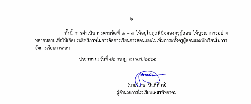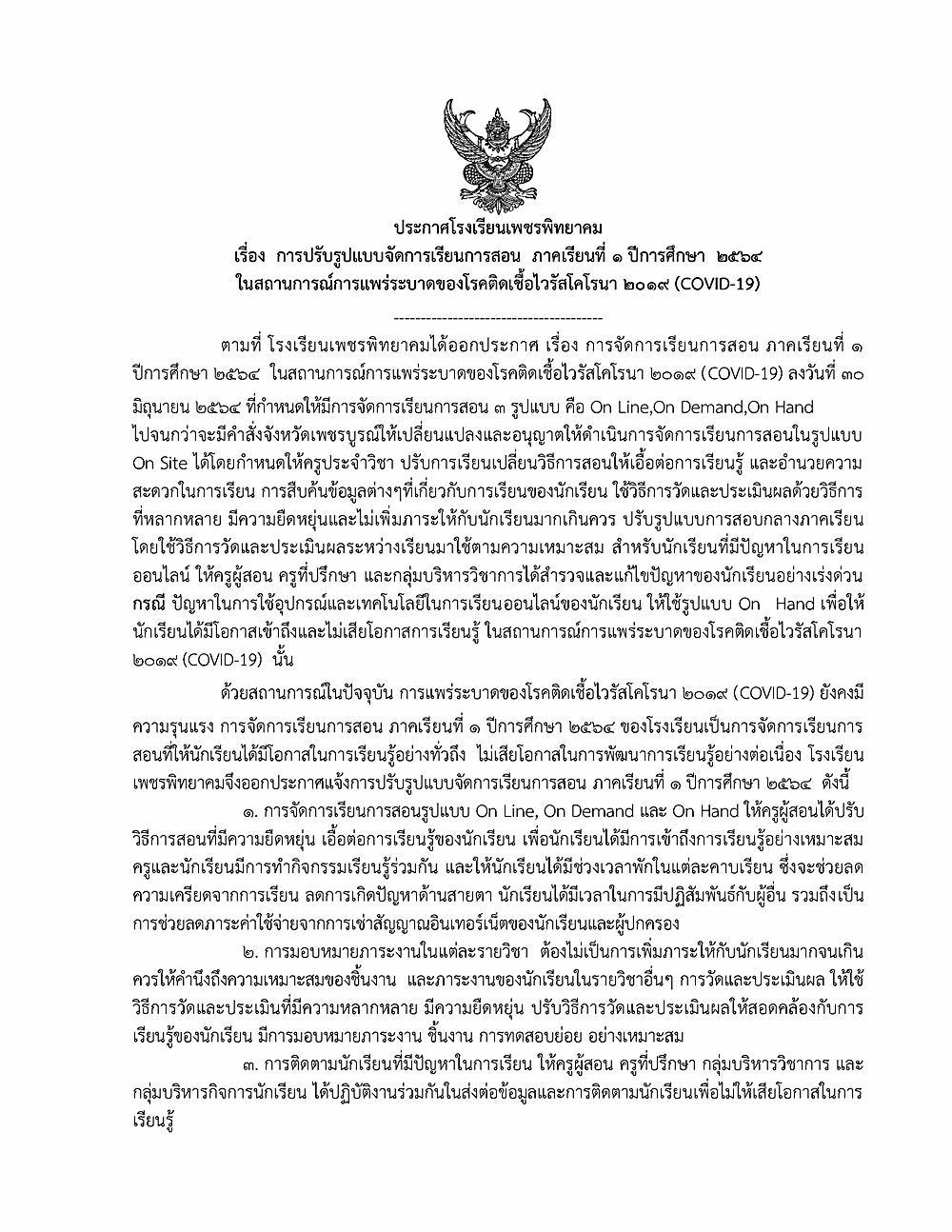 ประกาศโรงเรียนเพชรพิทยาคม เรื่อง การปรับรูปแบบจัดการเรียนการสอน ภาคเรียนที่ 1 ปีการศึกษา 2564 ในสถานการณ์การแพร่ระบาดของโรคติดเชื้อไวรัสโคโรนา 2019 (COVID-19)