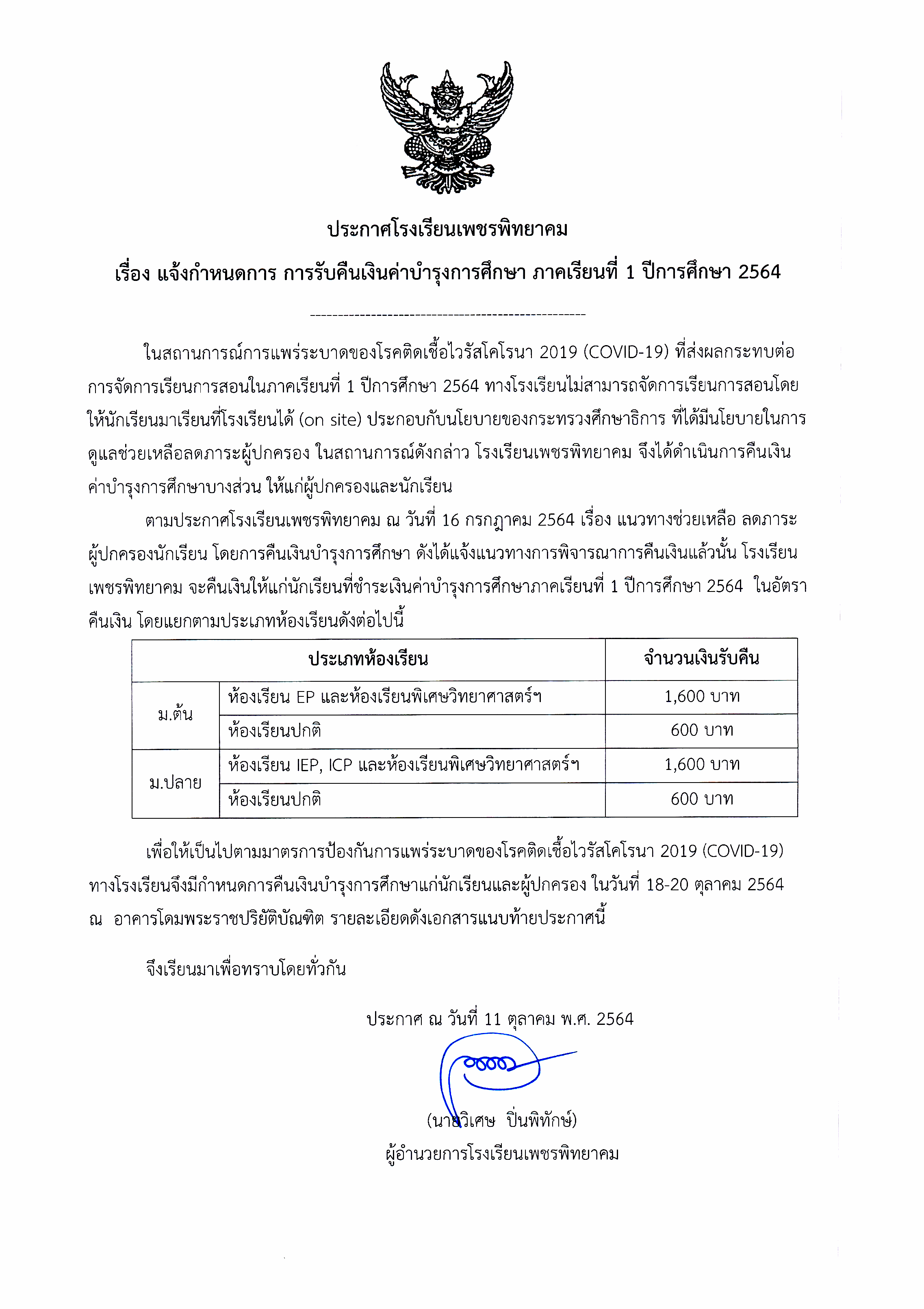 ประกาศโรงเรียนเพชรพิทยาคม เรื่อง แจ้งกำหนดการ การรับคืนเงินค่าบำรุงการศึกษา ภาคเรียนที่ 1 ปีการศึกษา 2564