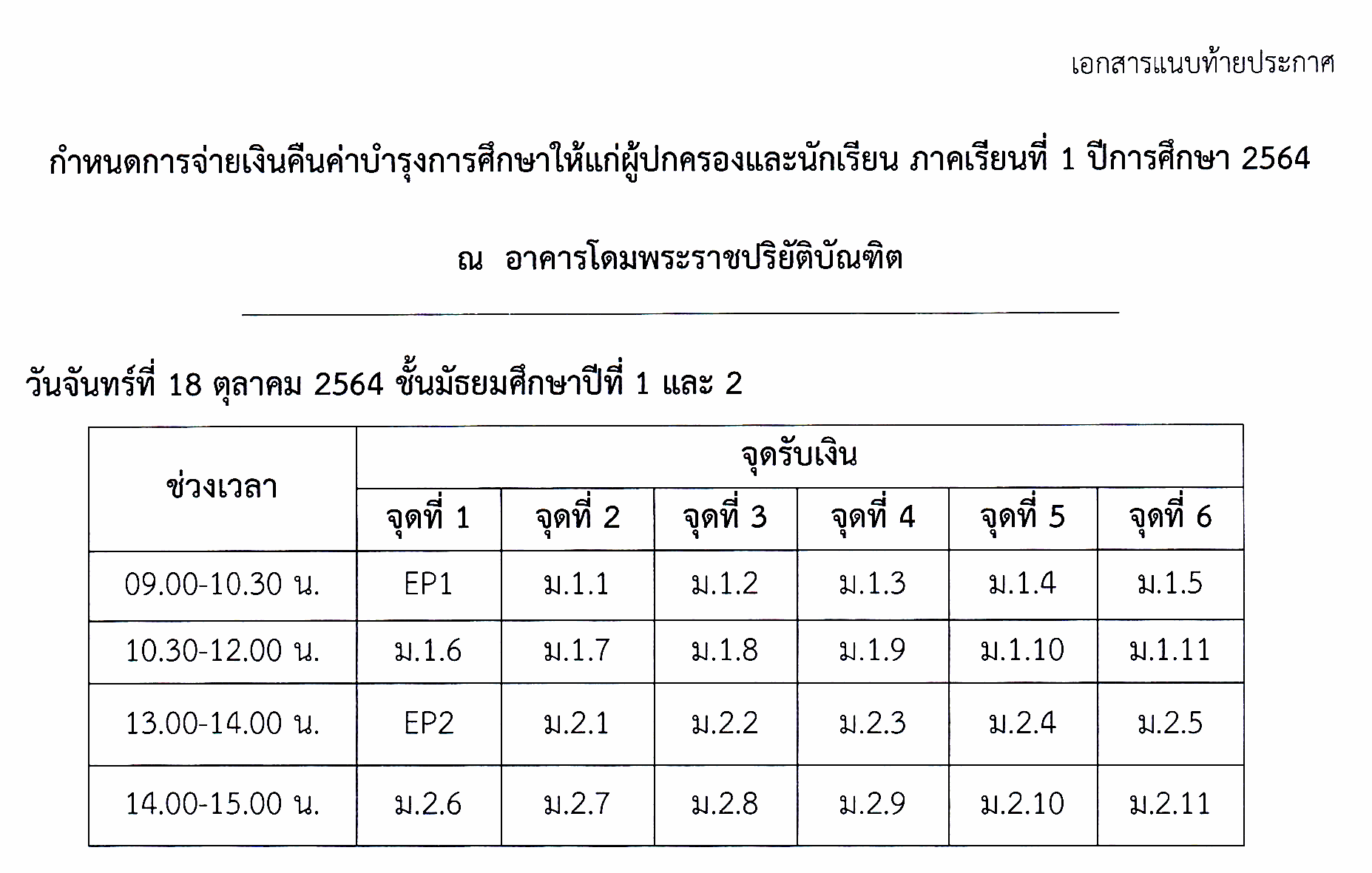 เรื่อง แจ้งกำหนดการ การรับคืนเงินค่าบำรุงการศึกษา ภาคเรียนที่ 1 ปีการศึกษา 2564