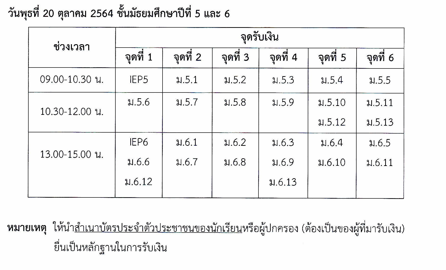 หมายเหตุ ให้นำสำเนาบัตรประจำตัวประชาชนของนักเรียนหรือผู้ปกครอง (ต้องเป็นของผู้ที่มารับเงิน) ยื่นเป็นหลักฐานในการรับเงิน