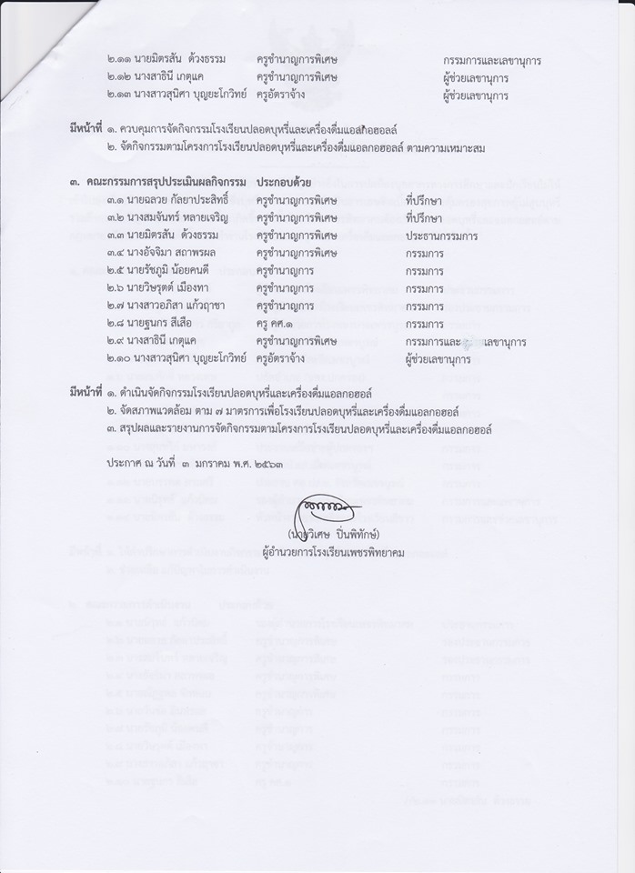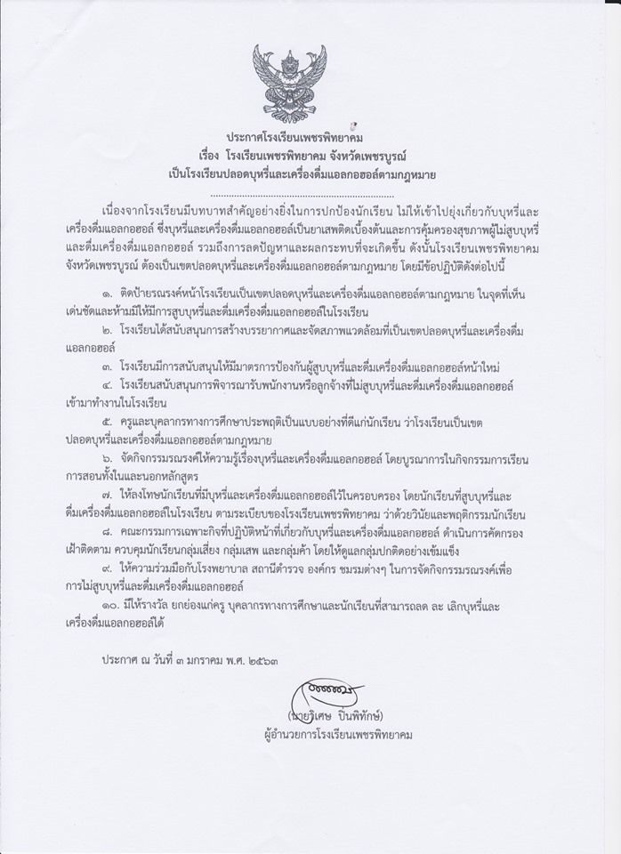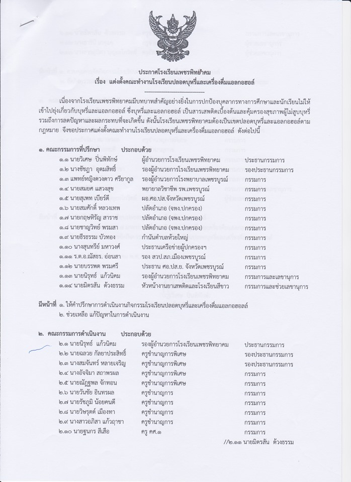 ประกาศโรงเรียนเพชรพิทยาคม เรื่อง แต่งตั้งคณะทำงานโรงเรียนปลอดบุหรี่และเครื่องดื่มแอลกอฮอล์