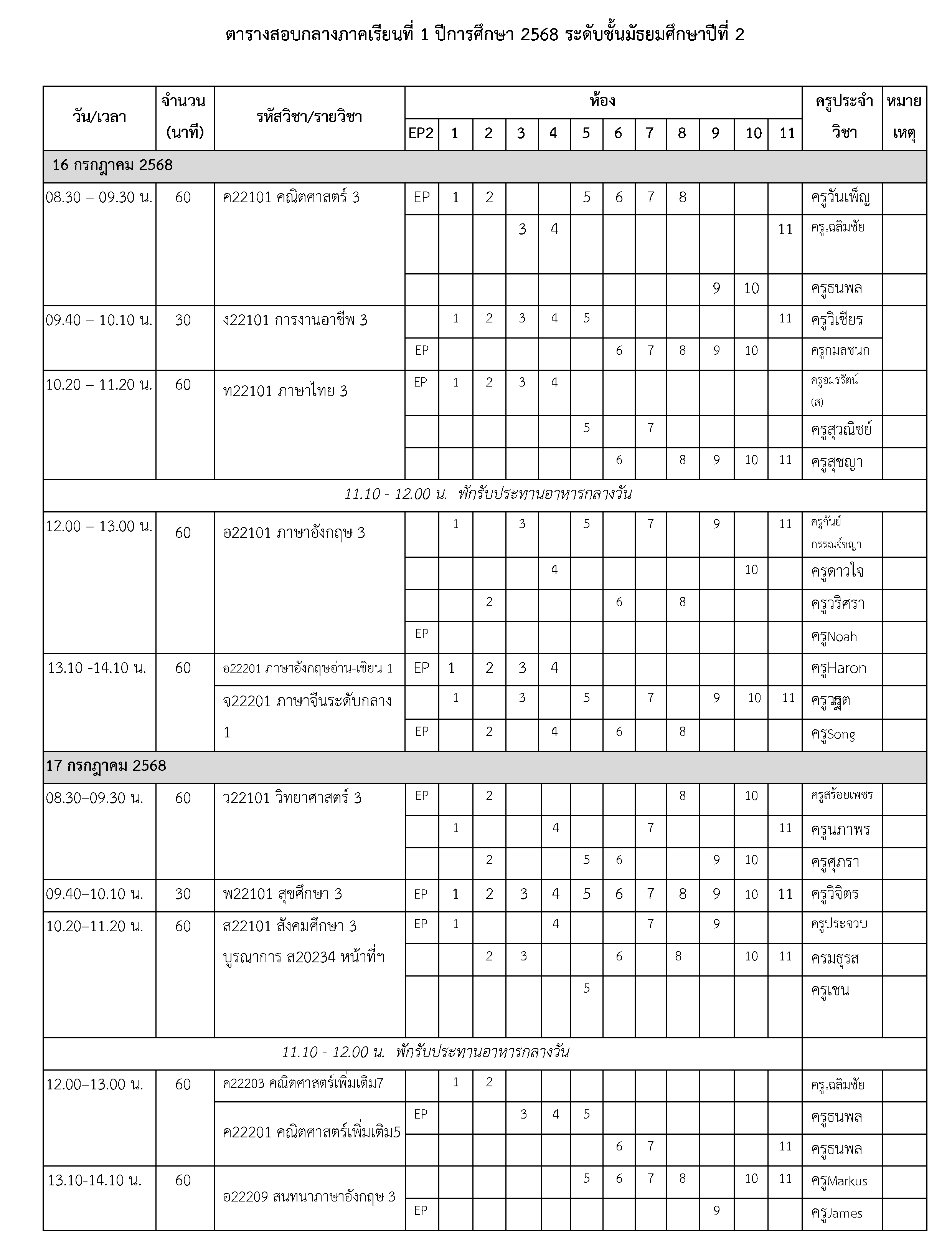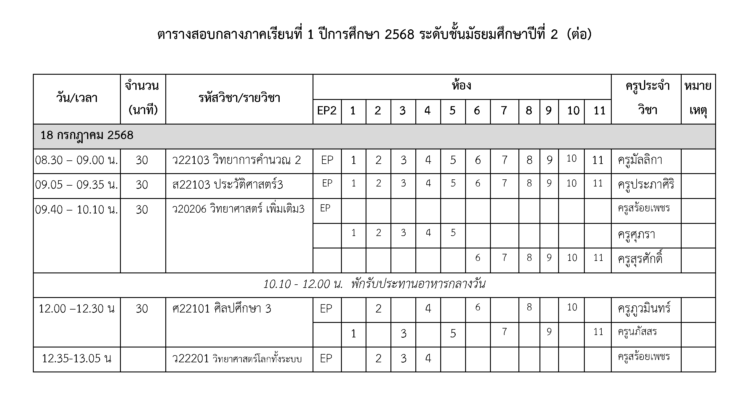 ตารางสอบกลางภาคเรียนที่ 1 ปีการศึกษา 2568 ระดับชั้นมัธยมศึกษาปีที่ 2 ระหว่างวันที่ 16-18 กรกฎาคม 2568