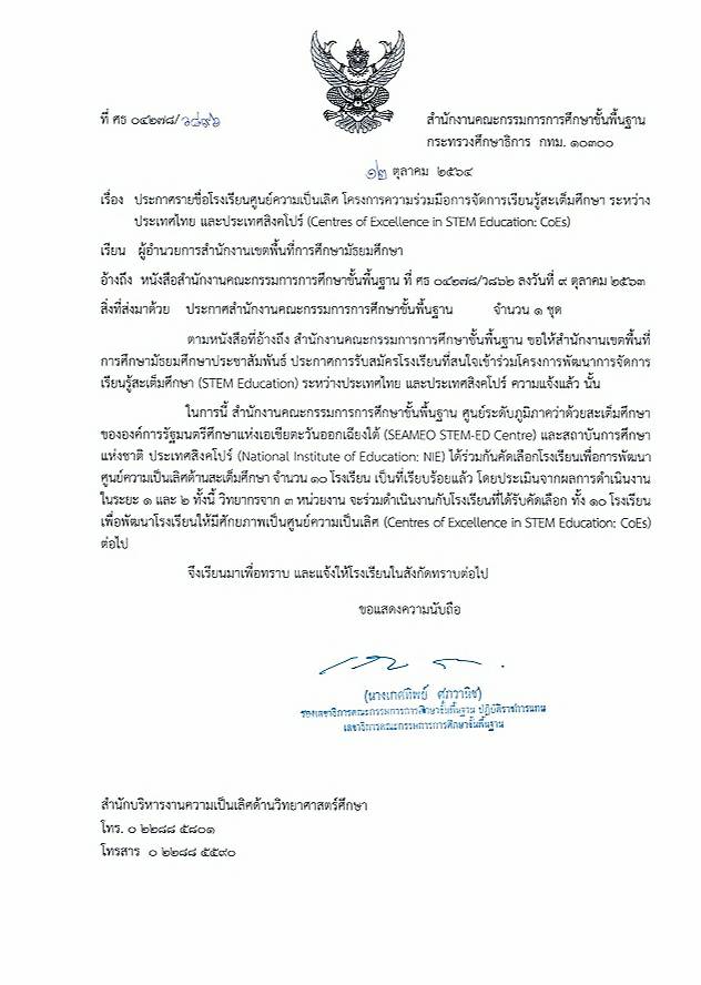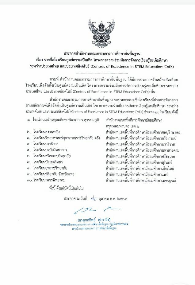 สำนักงานคณะกรรมการการศึกษาขั้นพื้นฐาน ขอประกาศรายชื่อโรงเรียนที่ผ่านการพิจารณาตามหลักเกณฑ์เพื่อจัตตั้งเป็นศูนย์ความเป็นเลิศ โครงการความร่วมมือการจัดการเรียนรู้สะเต็มศึกษา ระหว่างประเทศไทย และประเทศสิงคโปร์ (Centres of Excellence in STEM Education: CoEs) จำนวน 10 โรงเรียน ดังนี้