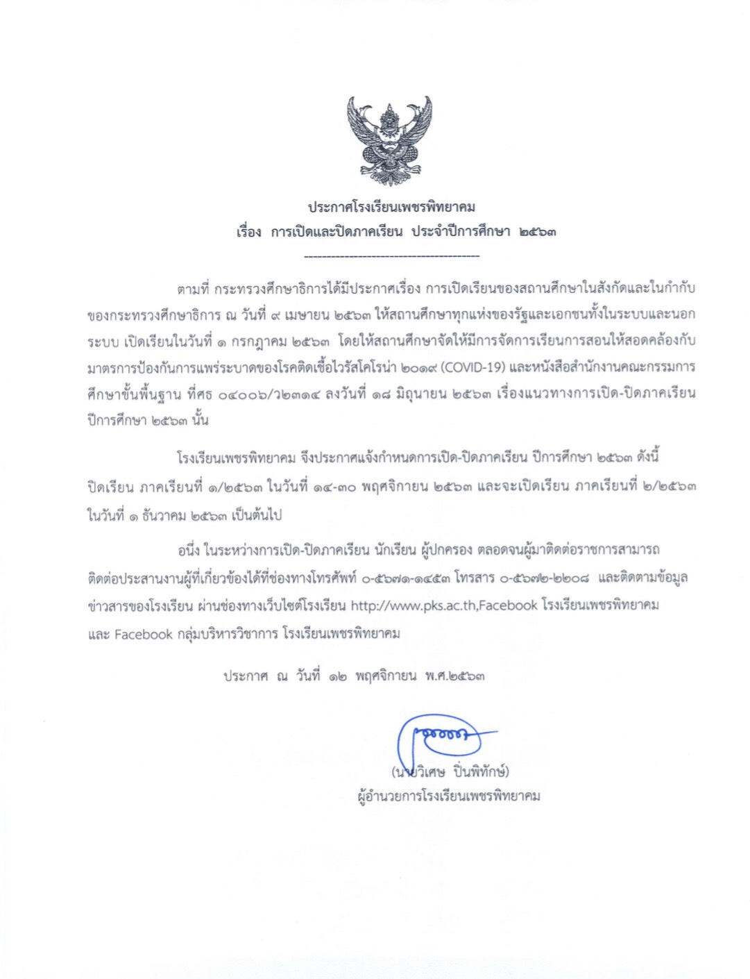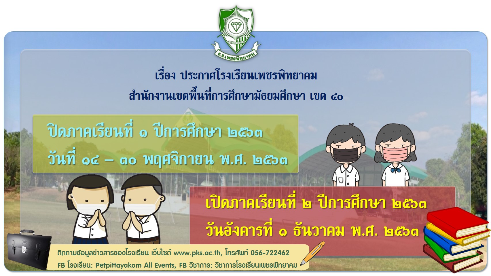 โรงเรียนเพชรพิทยาคม ปิดภาคเรียนที่ 1/2563 วันที่ 14-30 พฤศจิกายน พ.ศ.2563