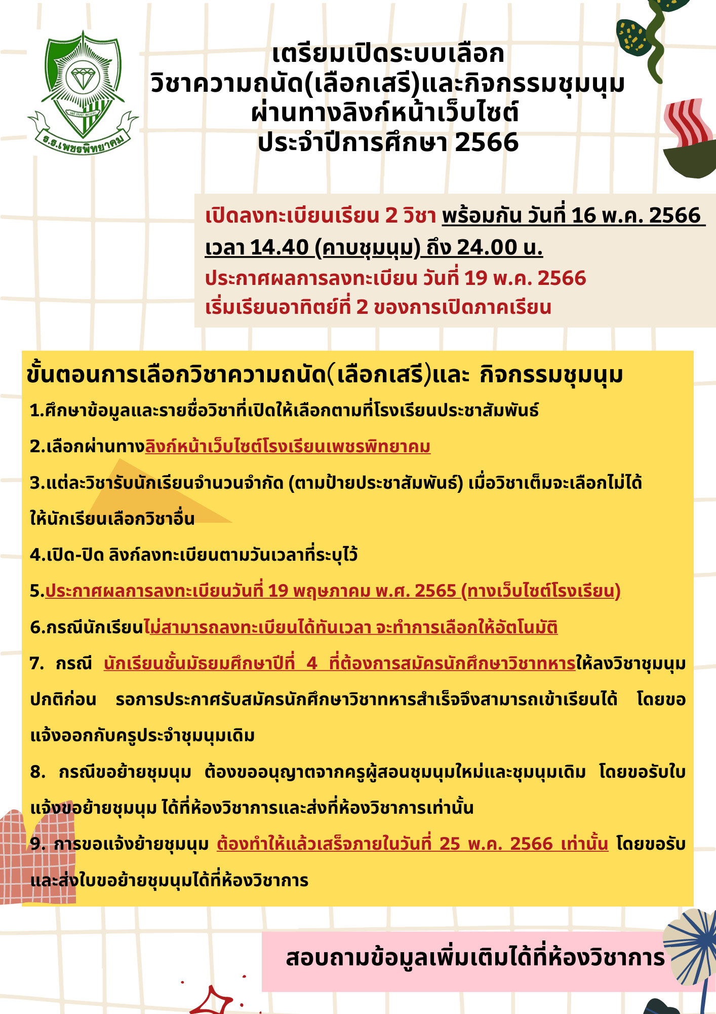 เตรียมเปิดระบบเลือกวิชาความถนัด (เลือกเสรี)และกิจกรรมชุมนุม ประจำปีการศึกษา 2566 ผ่านทางลิงก์หน้าเว็บไซต์