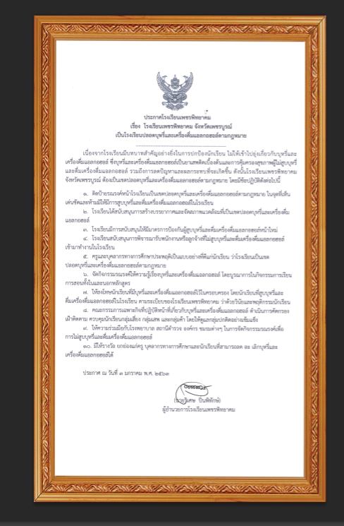 ผู้บริหารโรงเรียน โดย นายวิเศษ ปิ่นพิทักษ์ ผู้อำนวยการโรงเรียนเพชรพิทยาคม และดร.ชัชฎา อุดมสิทธิ์ รองผุ้อำนวยการโรงเรียนเพชรพิทยาคม กลุ่มบริหารงบประมาณและกลุ่มบริหารวิชาการ และนายนิรุทธ์ แก้วนิคม รองผู้อำนวยการโรงเรียนเพชรพิทยาคม กลุ่มบริหารทั่วไปและกลุ่มบริหารกิจการนักเรียน ร่วมกิจกรรม รณรงค์ตามโครงการโรงเรียนปลอดบุหรี่และเครื่องดื่มแอลกอฮอล์