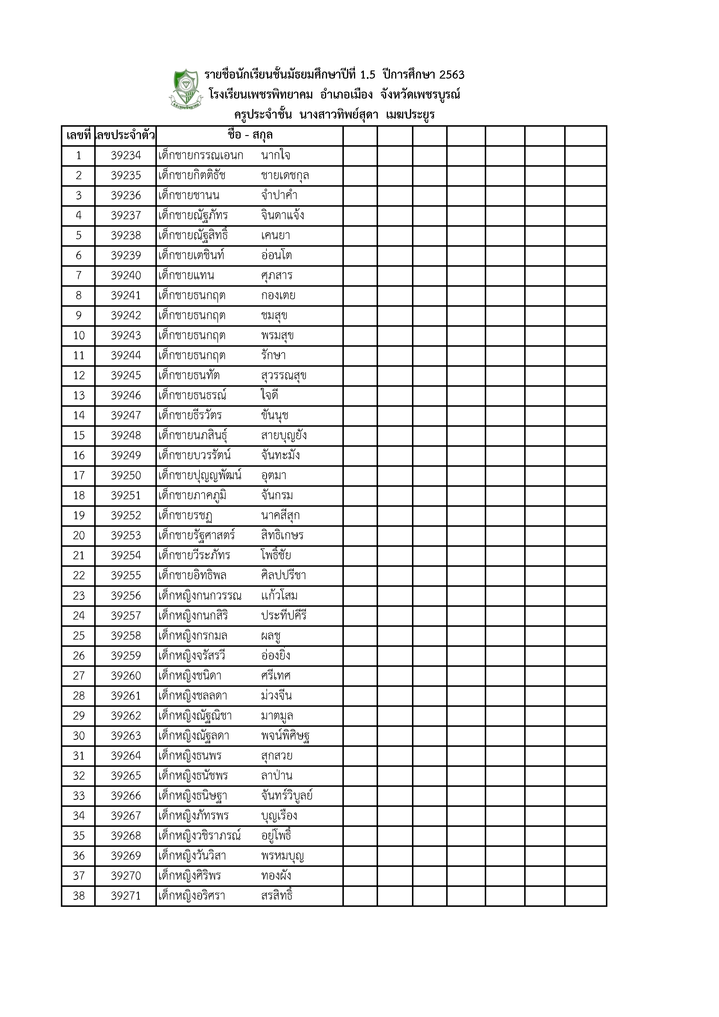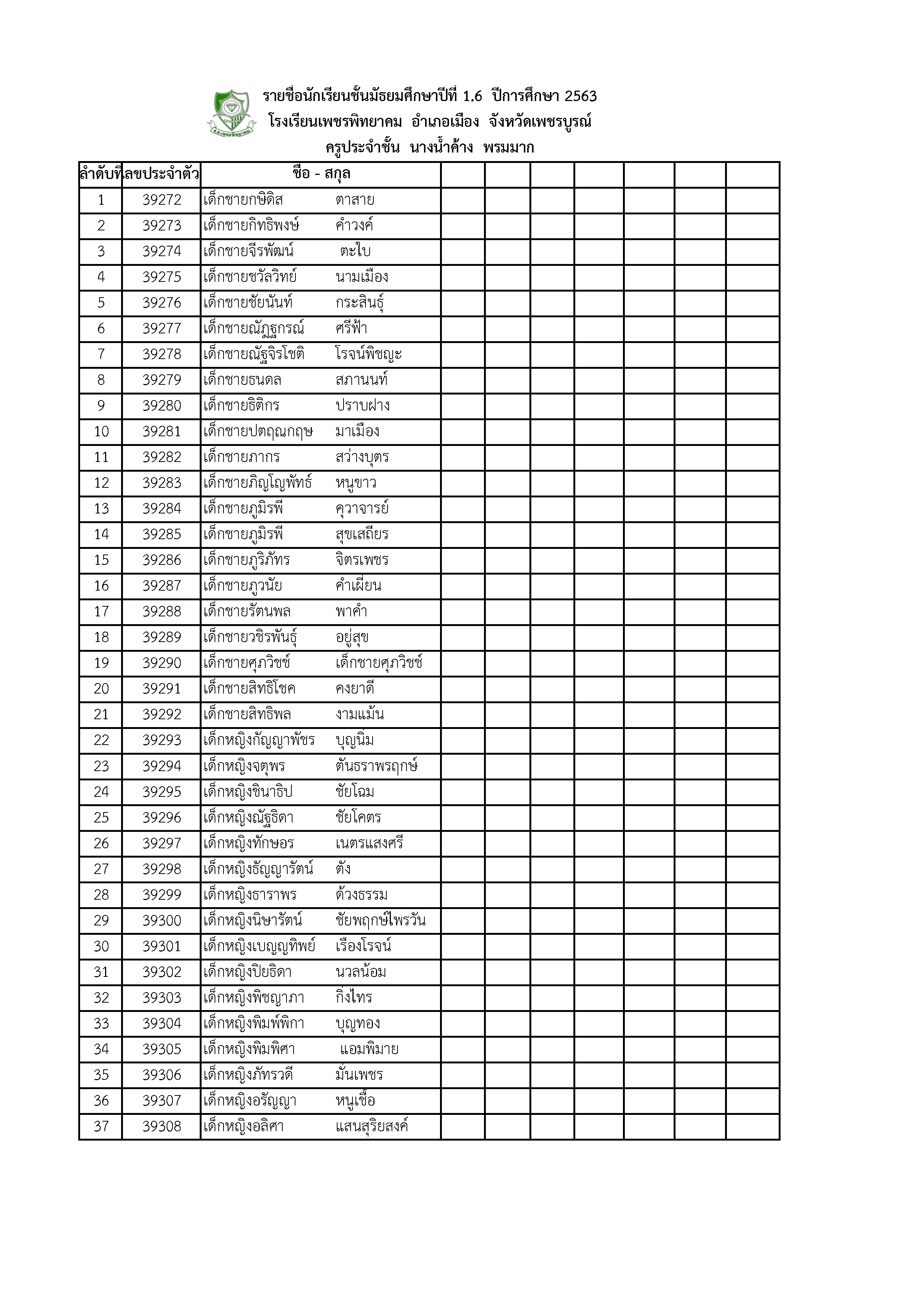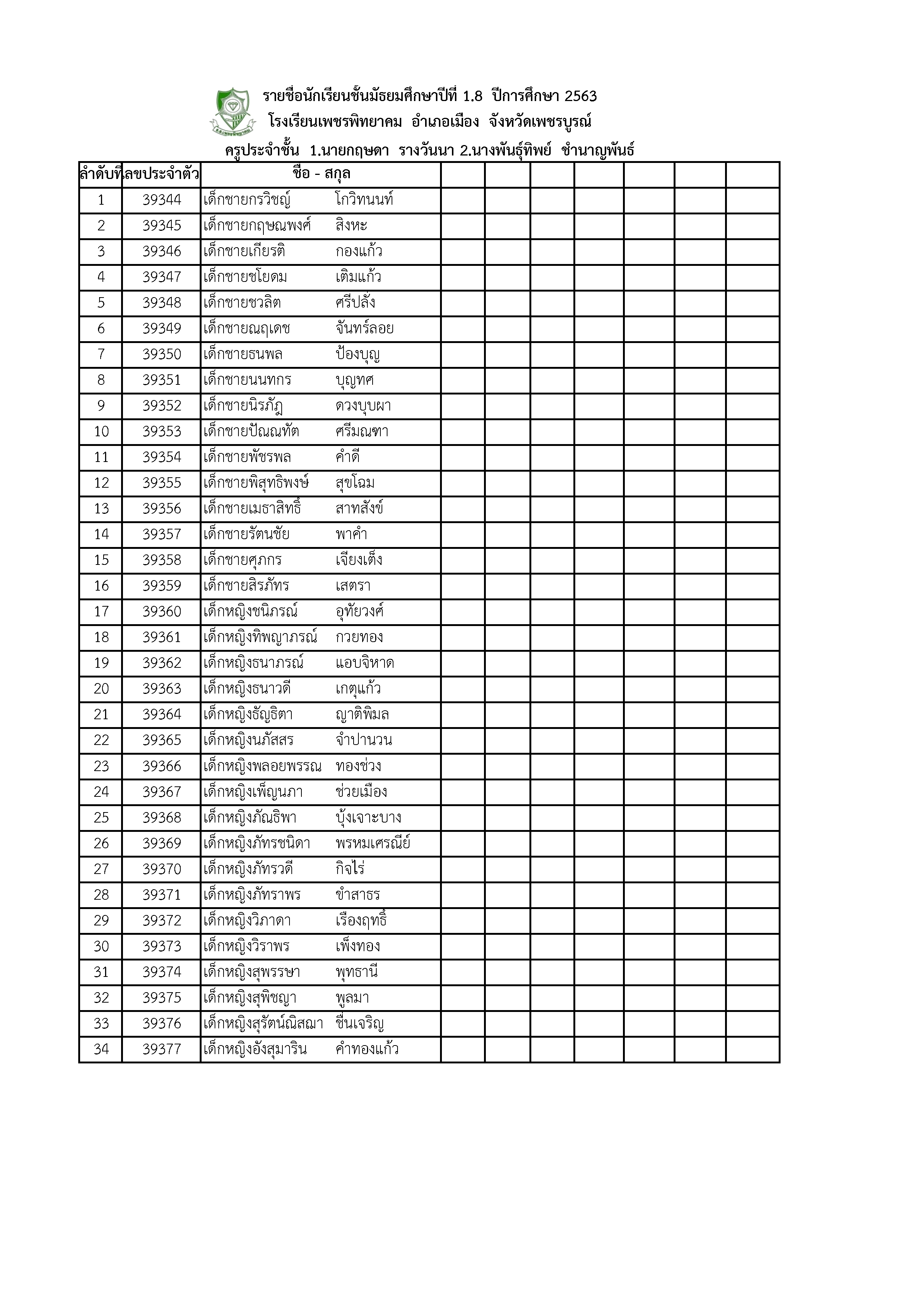 โรงเรียนเพชรพิทยาคม ประกาศรายชื่อนักเรียนและรหัสประจำตัวนักเรียนชั้นม.1 ห้องเรียนทั่วไป ภาคเรียนที่ 1 ปีการศึกษา 2563