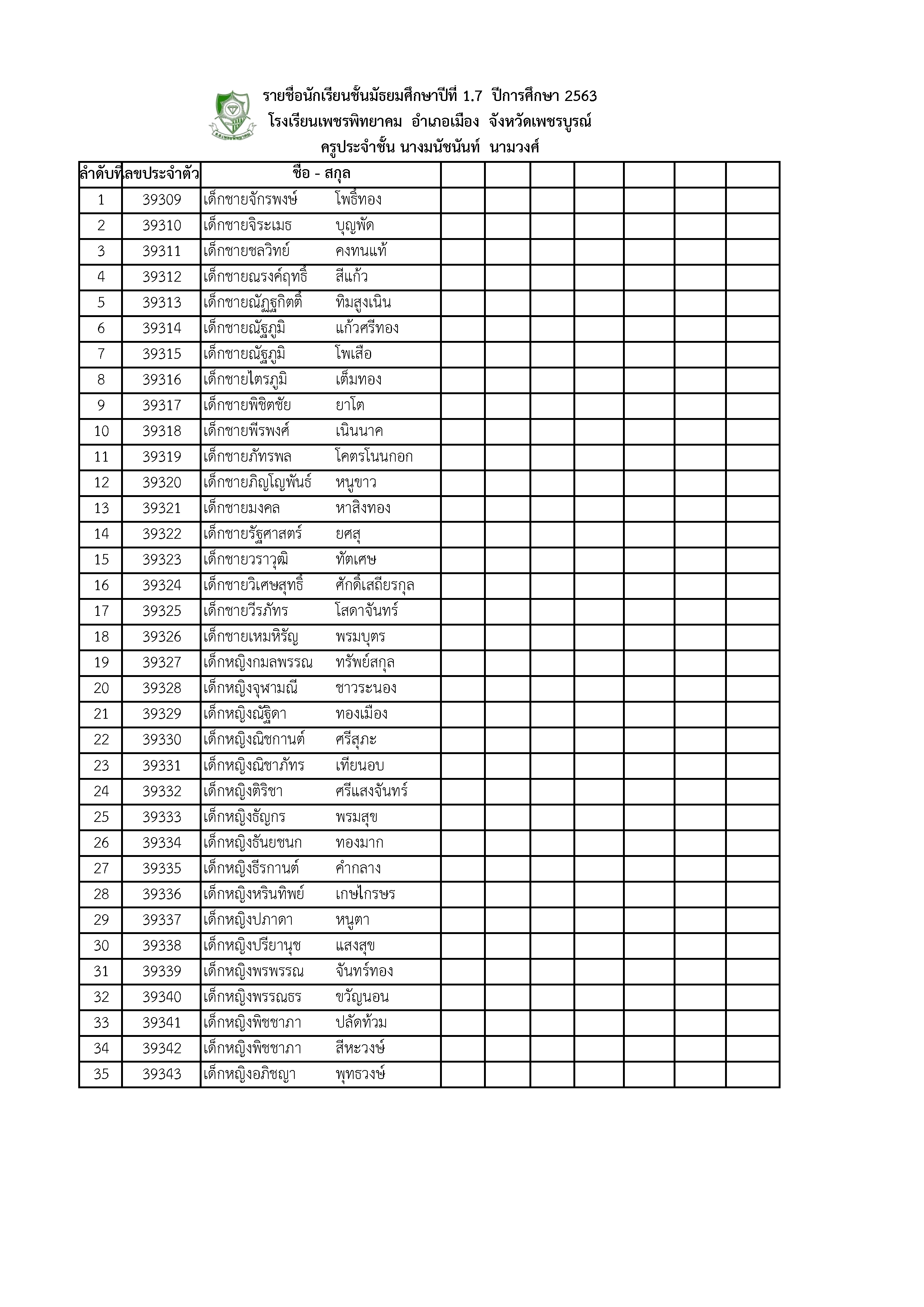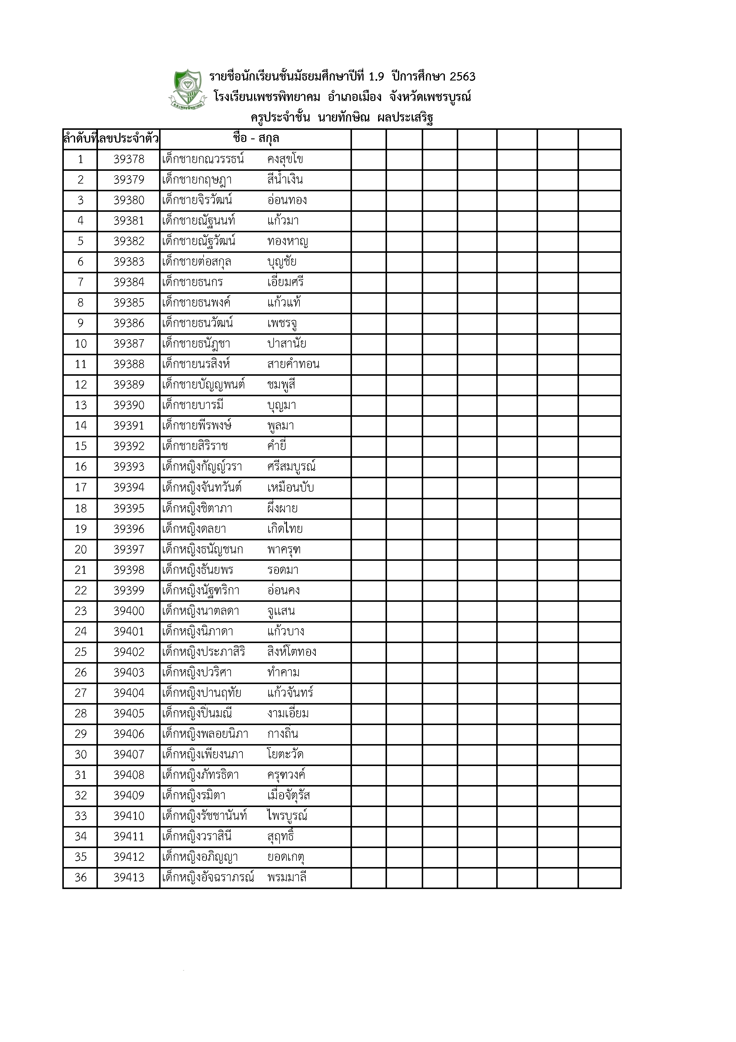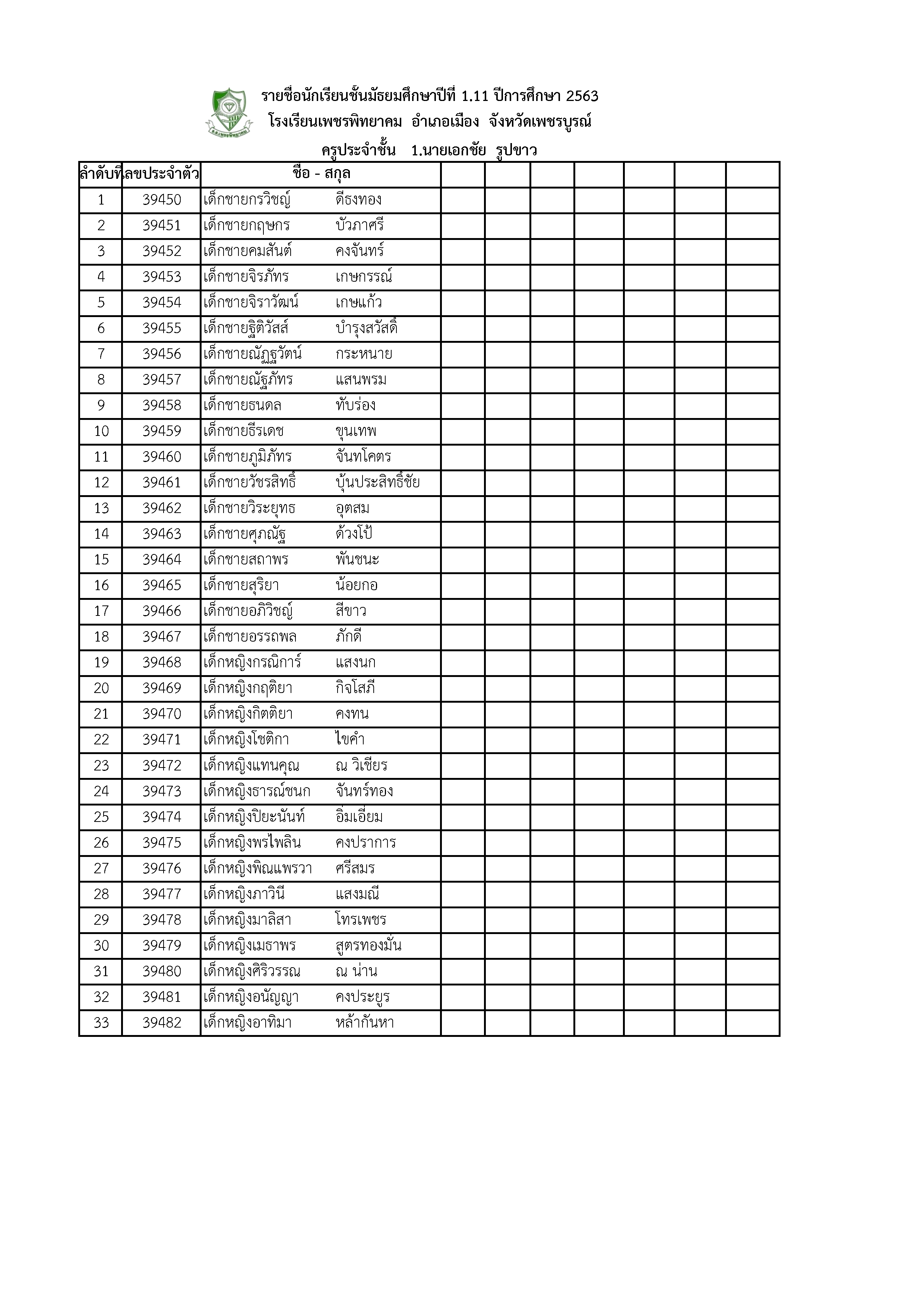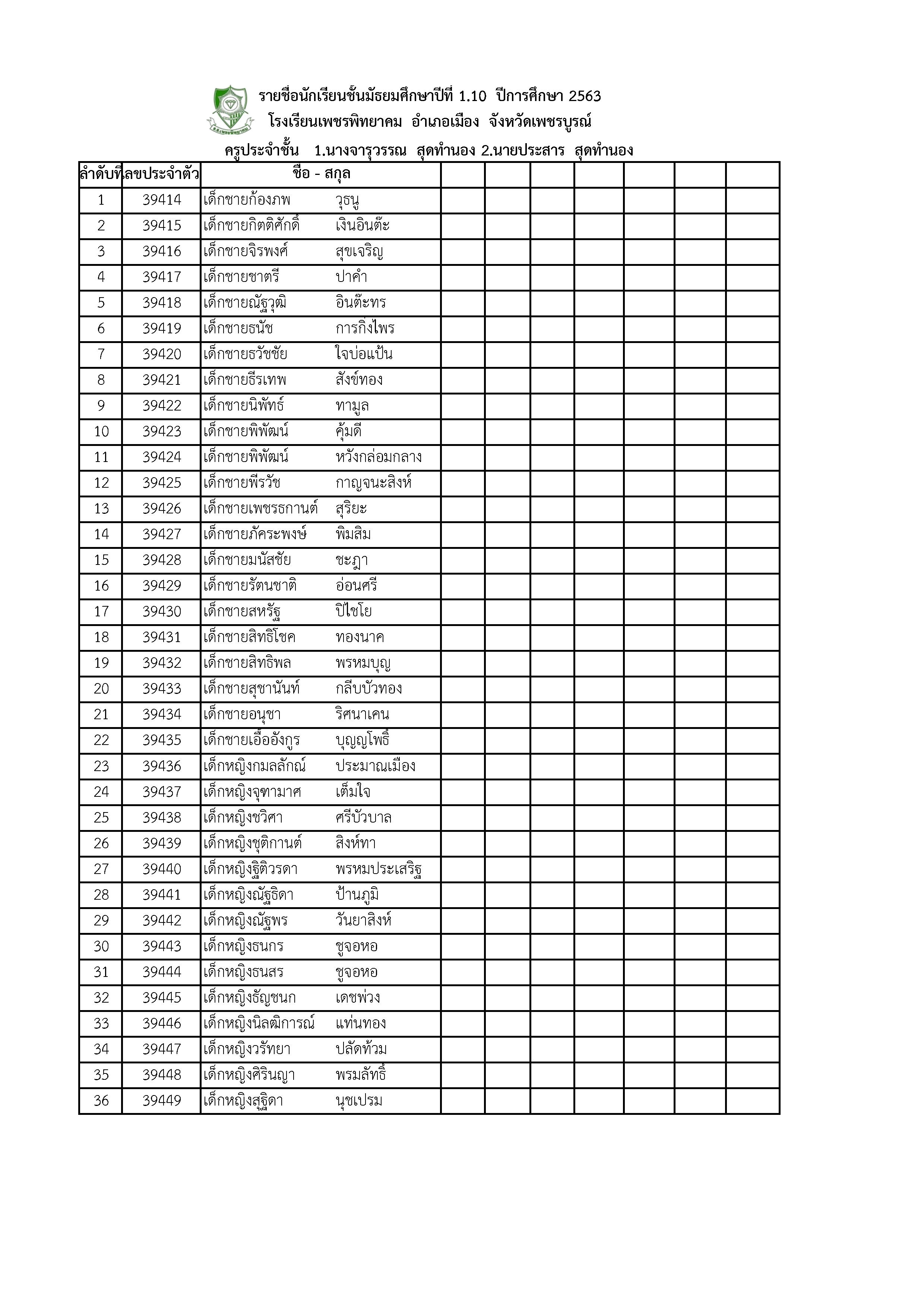 โรงเรียนเพชรพิทยาคม ประกาศรายชื่อนักเรียนและรหัสประจำตัวนักเรียนชั้นม.1 ห้องเรียนทั่วไป ภาคเรียนที่ 1 ปีการศึกษา 2563