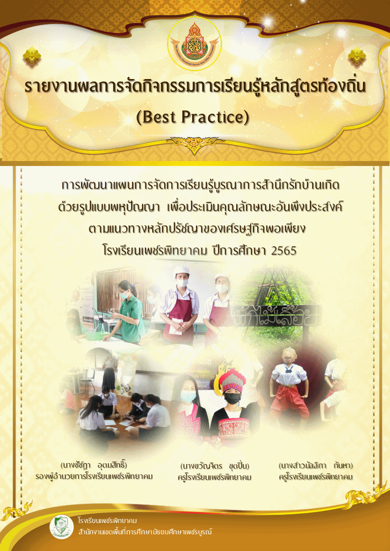 รายงานผลงานที่เป็นแบบอย่างที่ดี (Best Practice) เรื่องการพัฒนาแผนการจัดการเรียนรู้บูรณาการสำนึกรักบ้านเกิดด้วยรูปแบบพหุปัญญา เพื่อประเมินคุณลักษณะอันพึงประสงค์ตามแนวทางหลักปรัชญาของเศรษฐกิจพอเพียง โรงเรียนเพชรพิทยาคม ปีการศึกษา 2565