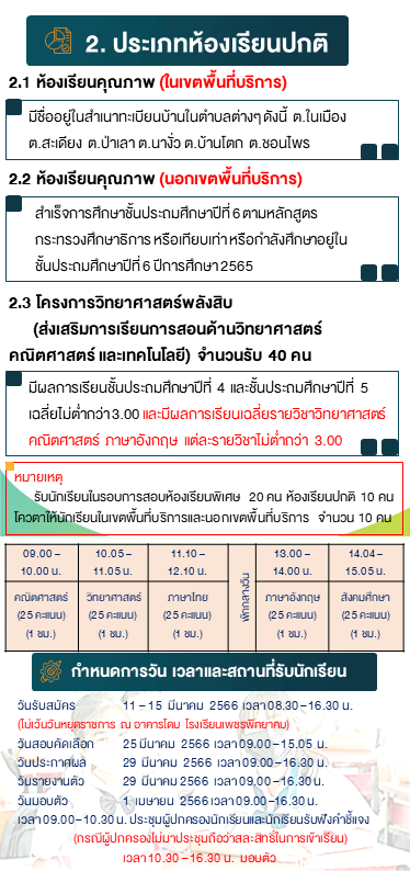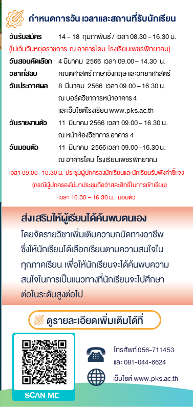 วันรับสมัคร 11 – 12 มีนาคม 2566 เวลา 08.30 – 16.30 น. ไม่เว้นวันหยุดราชการ ณ อาคารโดม โรงเรียนเพชรพิทยาคม