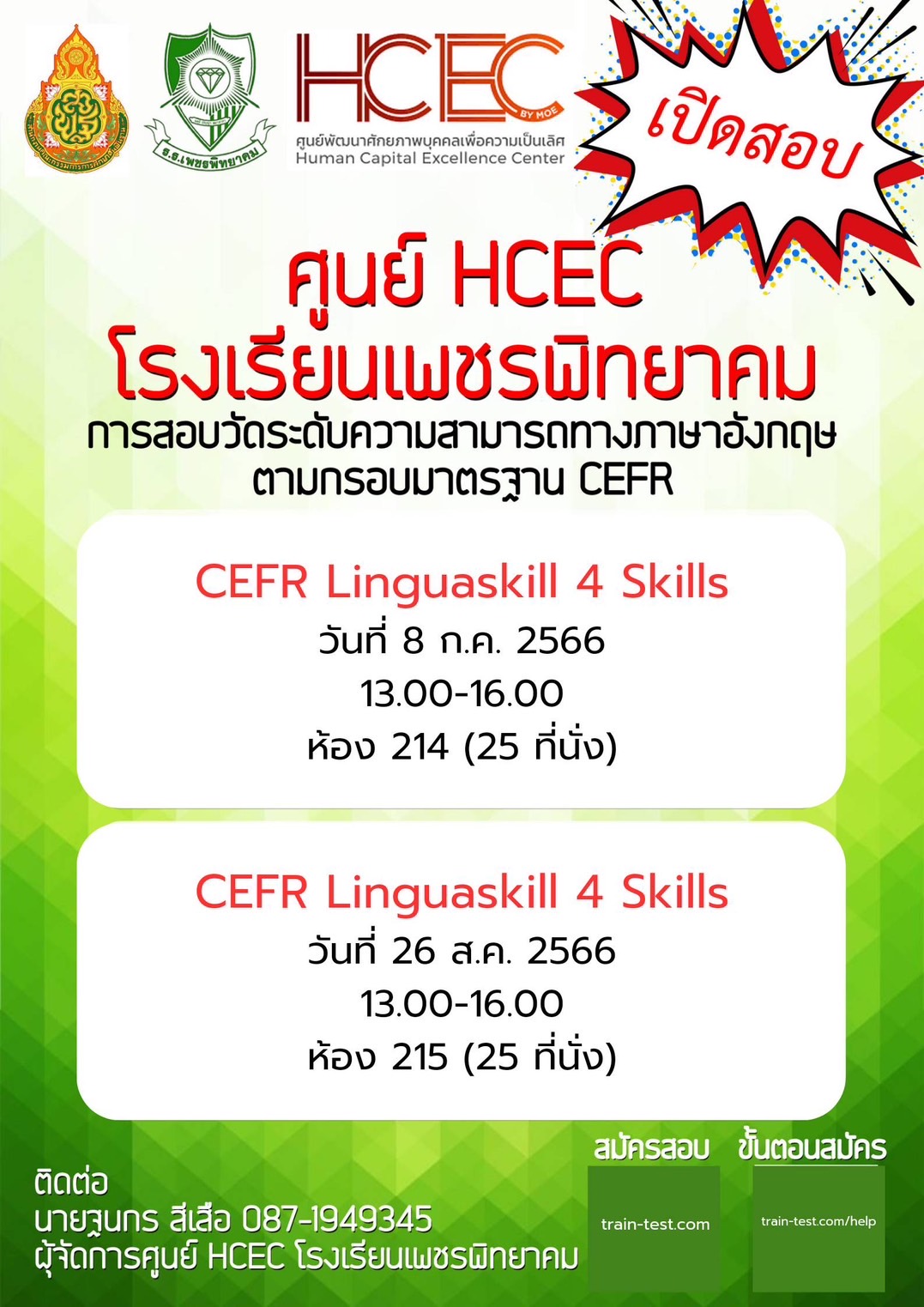 เชิญชวนคุณครูและบุคลากรทางการศึกษาที่สนใจสอบวัดความรู้ภาษาอังกฤษ ตามกรอบมาตรฐาน CEFR สมัครสอบได้ตามวัน เวลา ที่ศูนย์กำหนด หรือติดต่อประสานงานโดยตรงที่ ครูฐนกร สีเสือ ผู้จัดการศูนย์ HCEC โรงเรียนเพชรพิทยาคม โทร 087-1949345