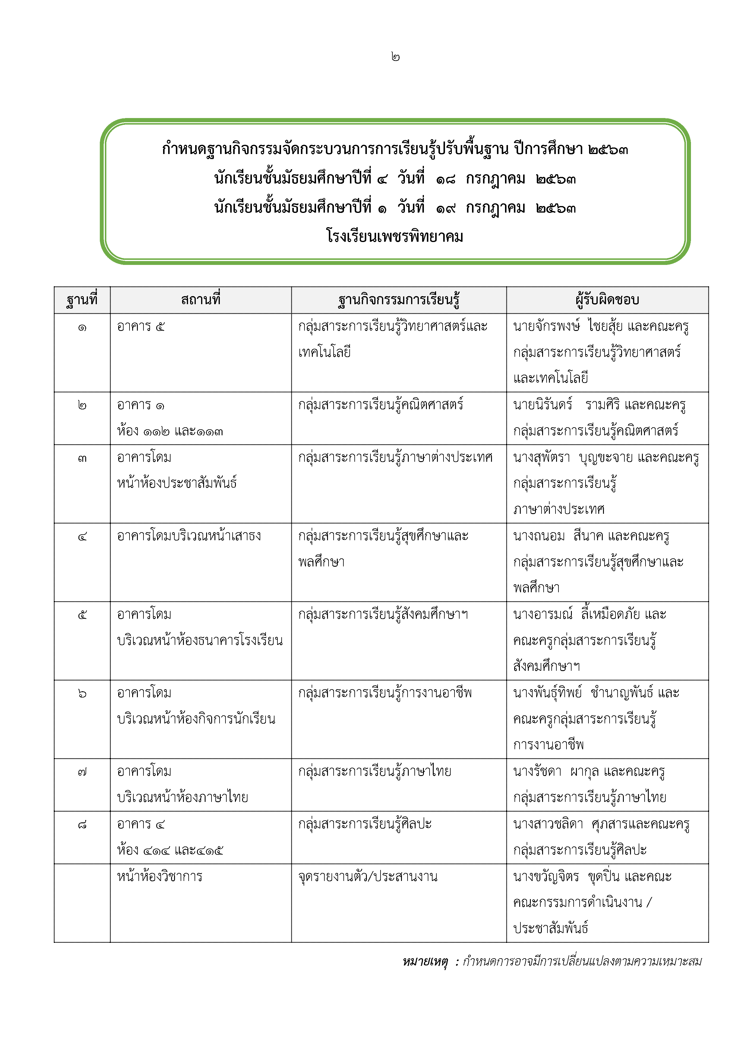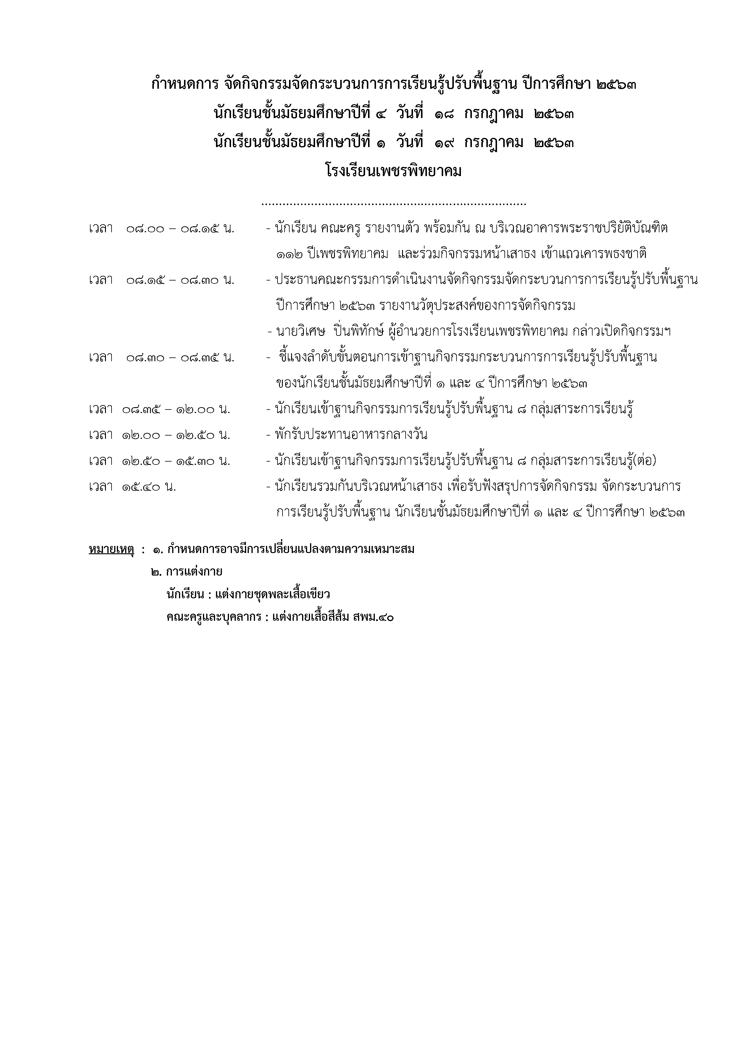 กำหนดการ จัดกิจกรรมจัดกระบวนการ การเรียนรู้ปรับพื้นฐาน ปีการศึกษา 2563