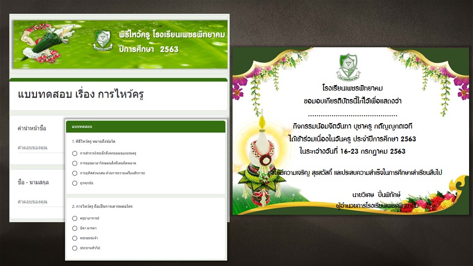 บทเรียนออนไลน์ พิธีวันไหว้ครู โรงเรียนเพชรพิทยาคม ปีการศึกษา 2563 สอบผ่านเกณฑ์รับเกียรติบัตร