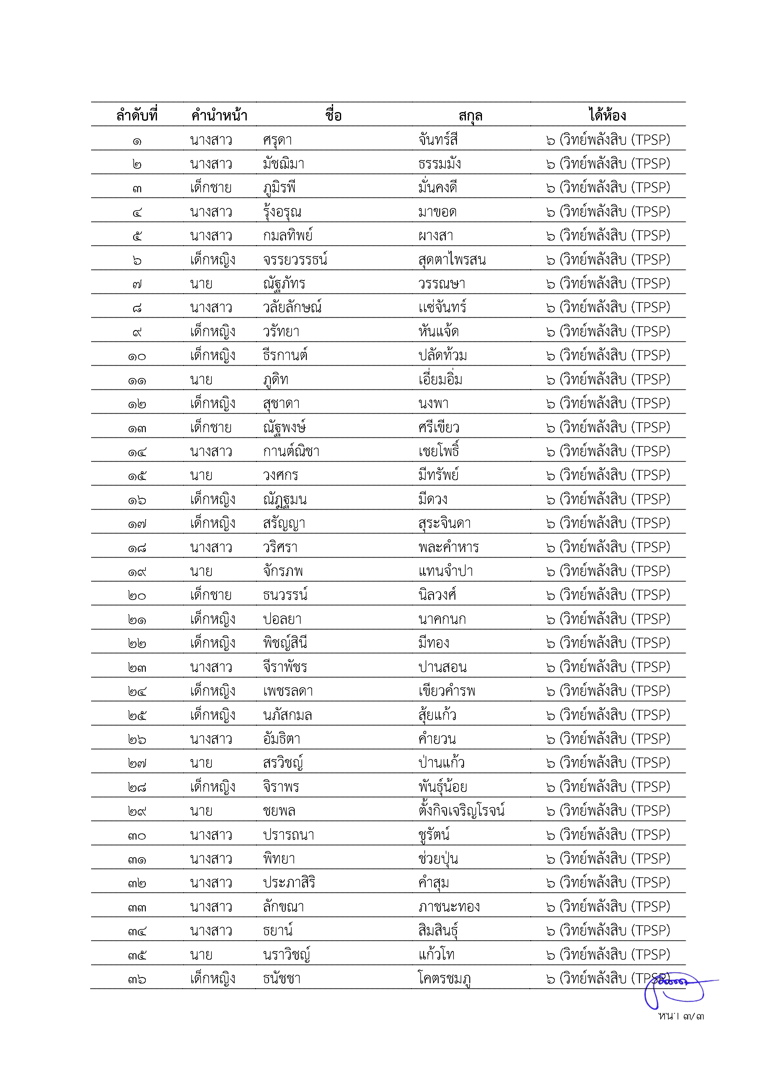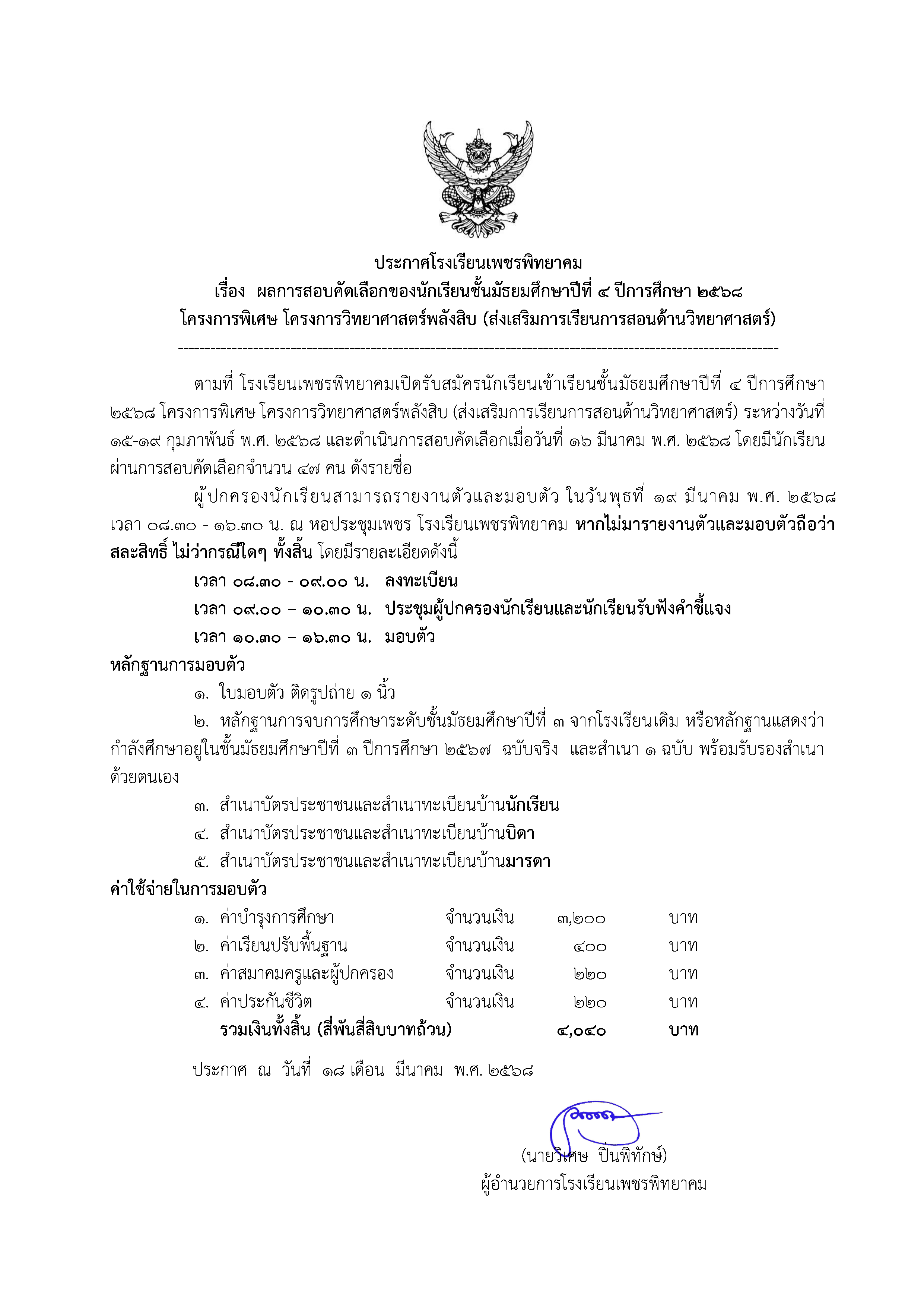 ประกาศผลการสอบคัดเลือกของนักเรียนชั้นมัธยมศึกษาปีที่ 4 ปีการศึกษา 2568 โครงการพิเศษ โครงการวิทยาศาสตร์พลังสิบ (ส่งเสริมการเรียนการสอนด้านวิทยาศาสตร์)