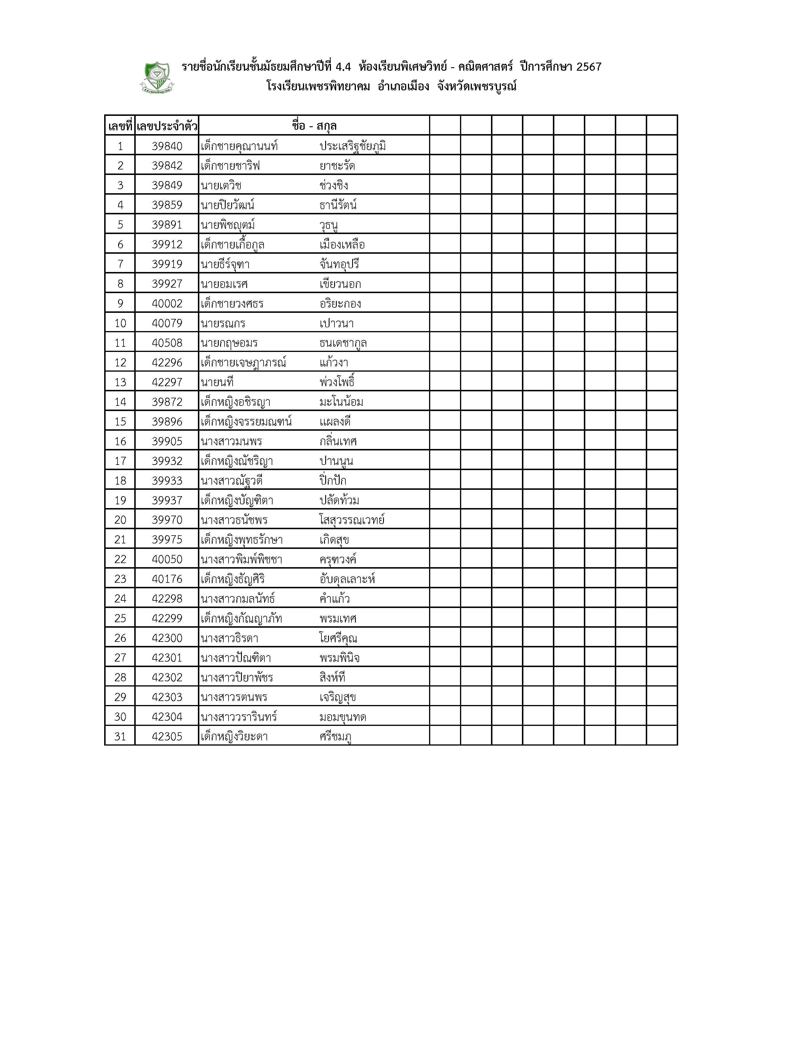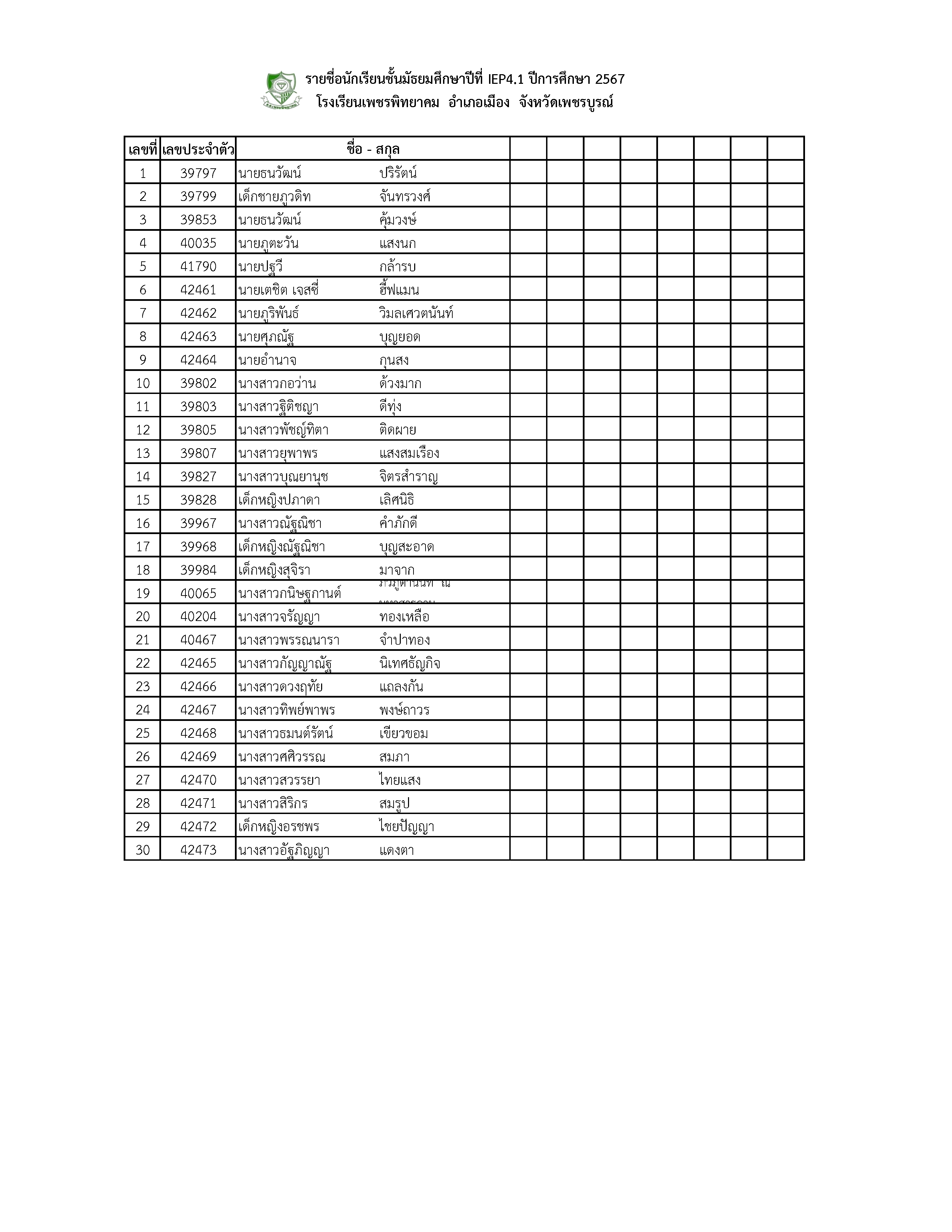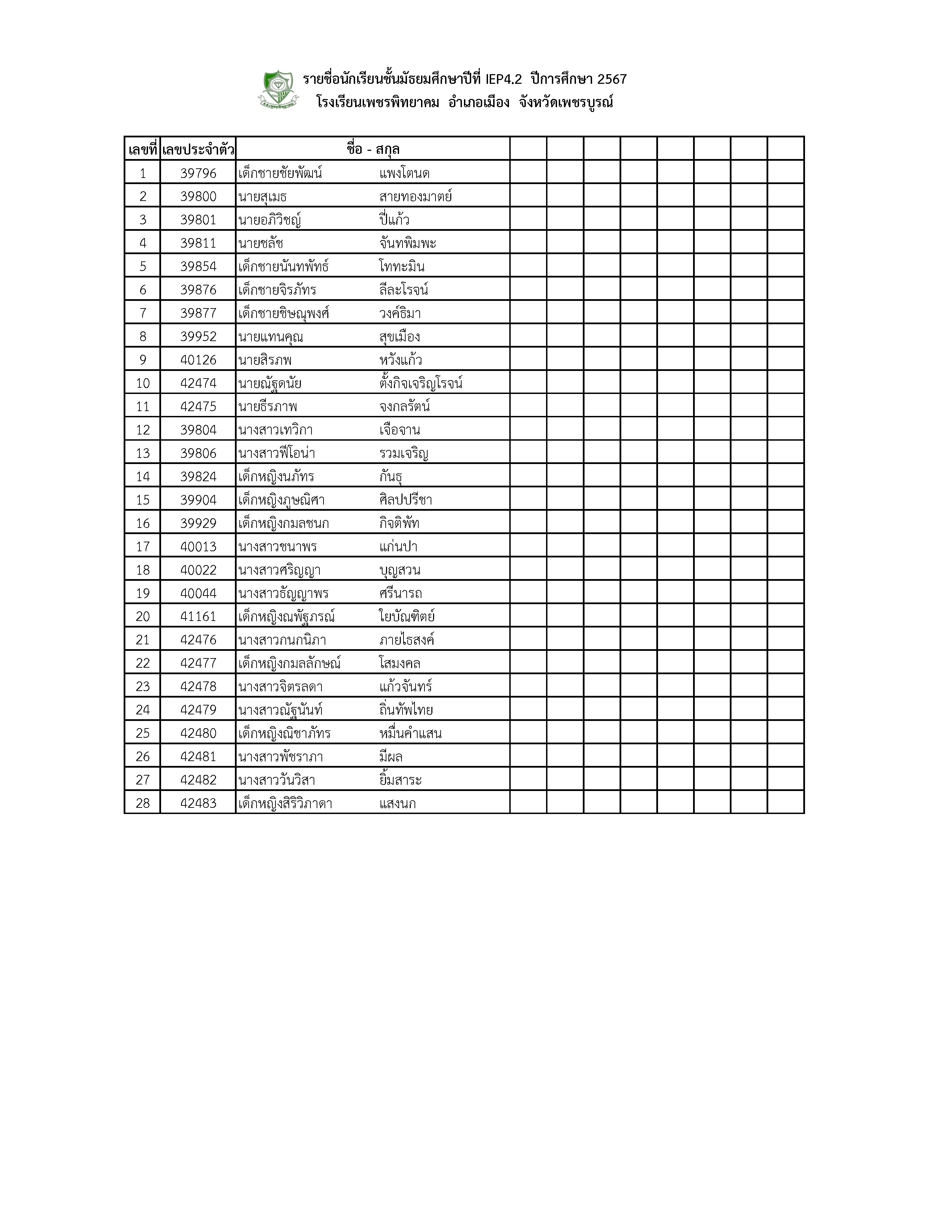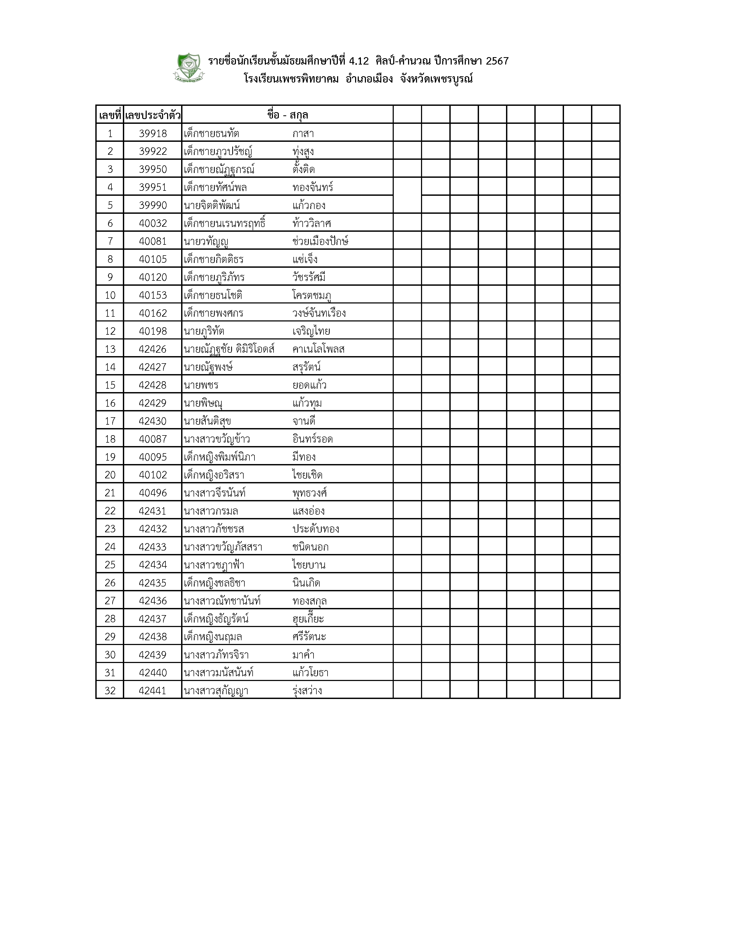 ประกาศเลขประจำตัวนักเรียน ชั้นมัธยมศึกษาปีที่ 4 ปีการศึกษา 2567