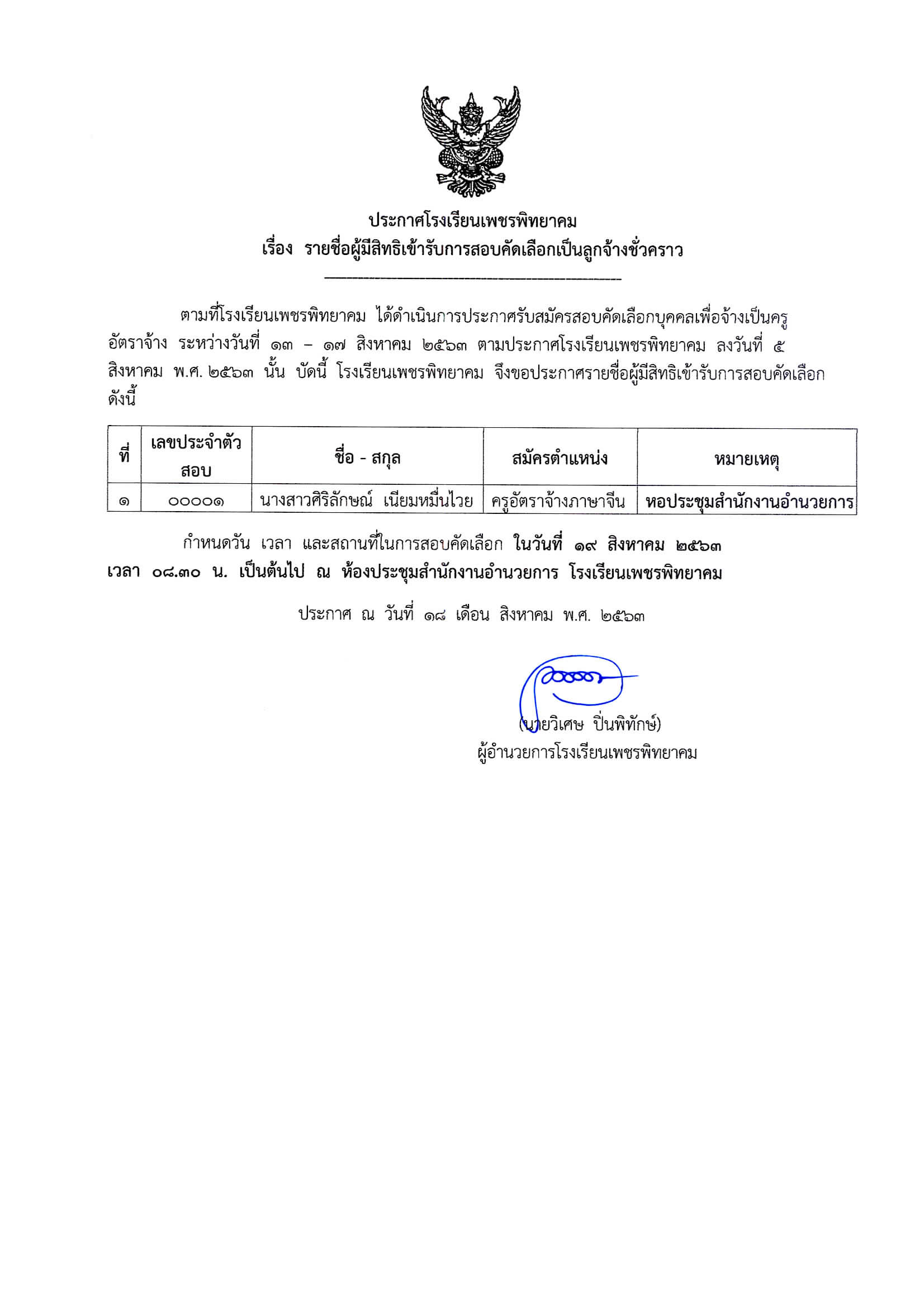 ประกาศโรงเรียนเพชรพิทยาคม เรื่อง รายชื่อผู้มีสิทธิเข้ารับการสอบคัดเลือกเป็นลูกจ้างชั่วคราว