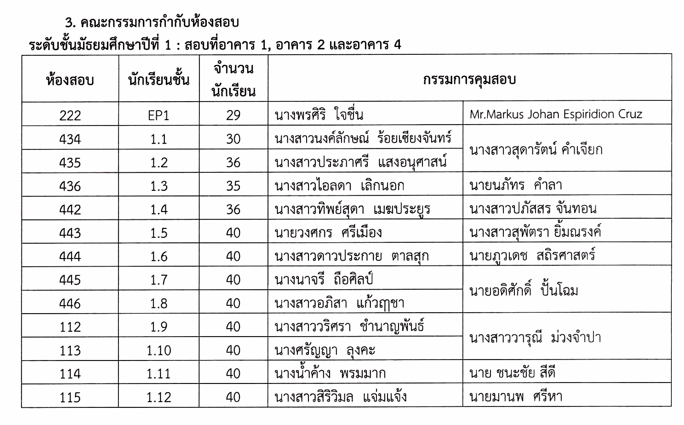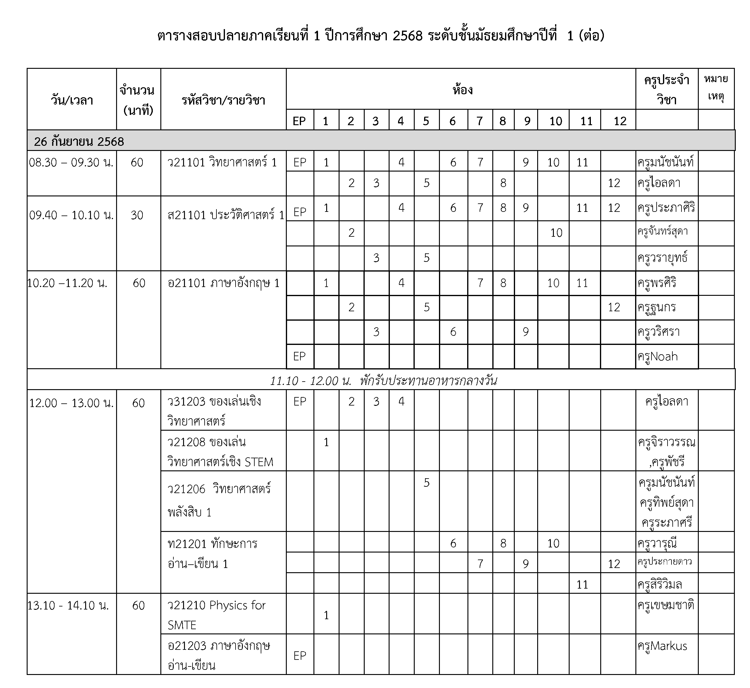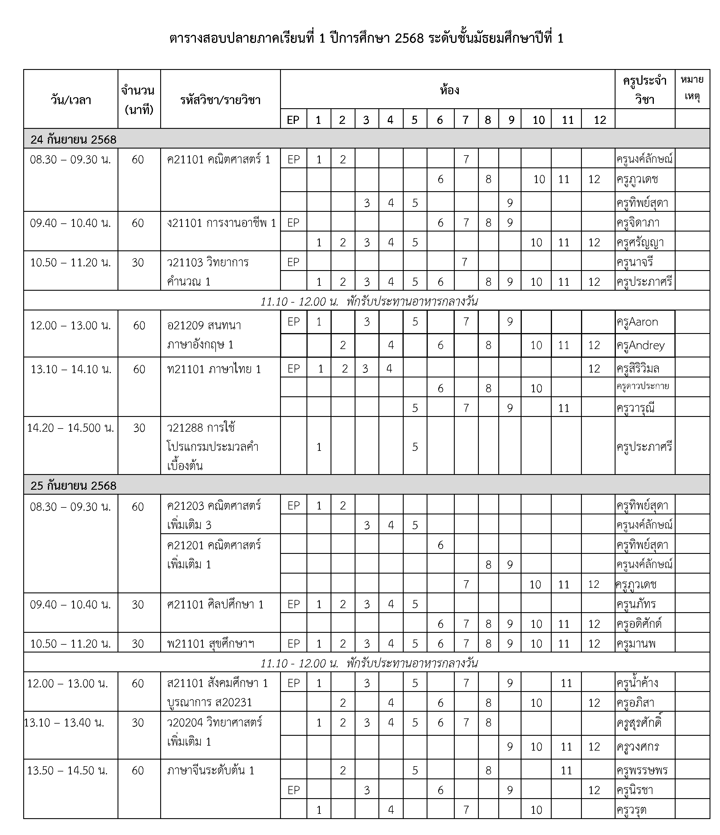 ตารางสอบปลายภาค ภาคเรียนที่ 1 ปีการศึกษา 2568 ชั้น ม.1 วันที่ 24-26 กันยายน 2568
