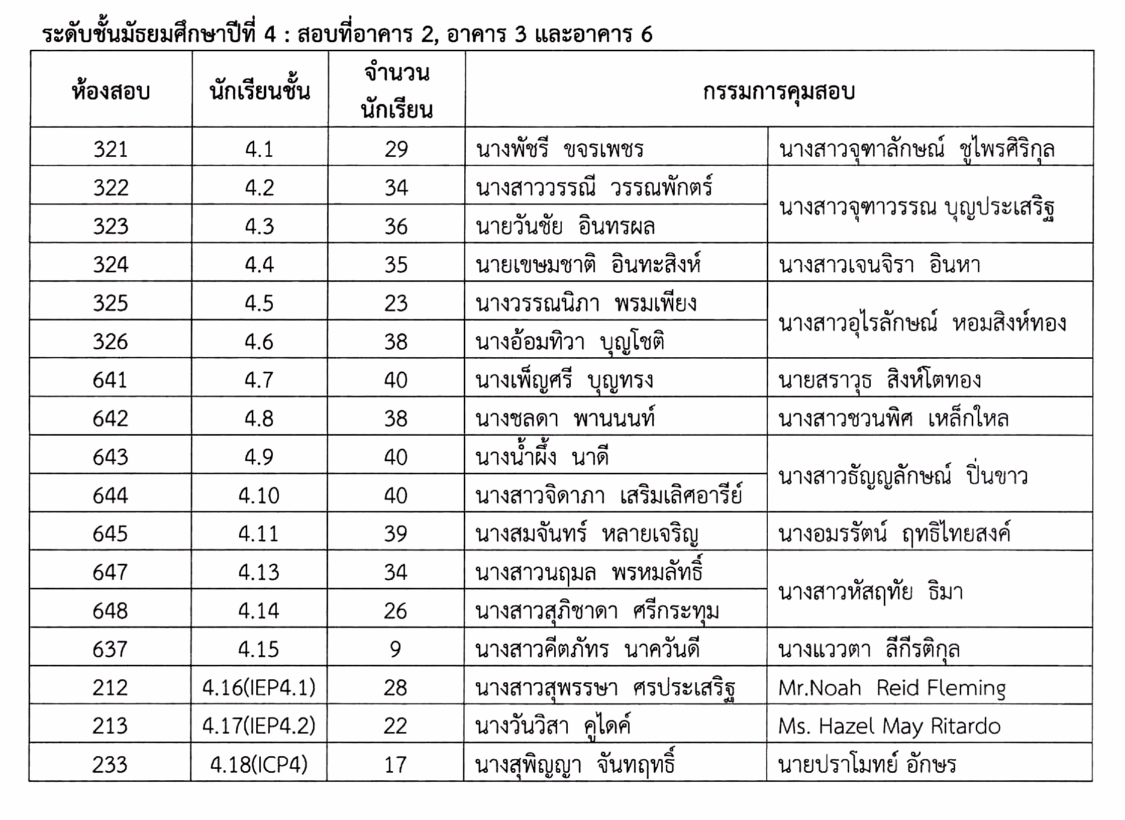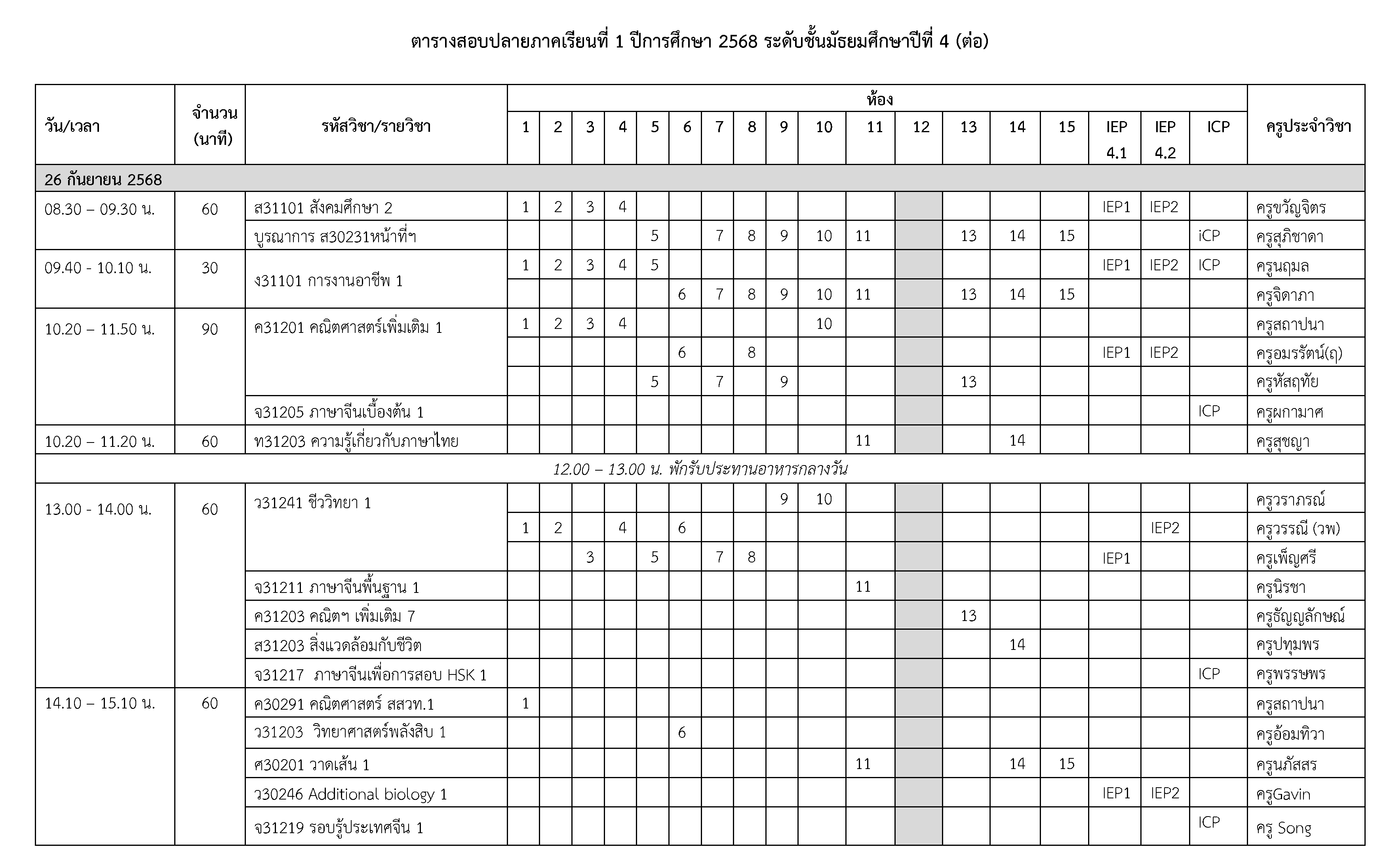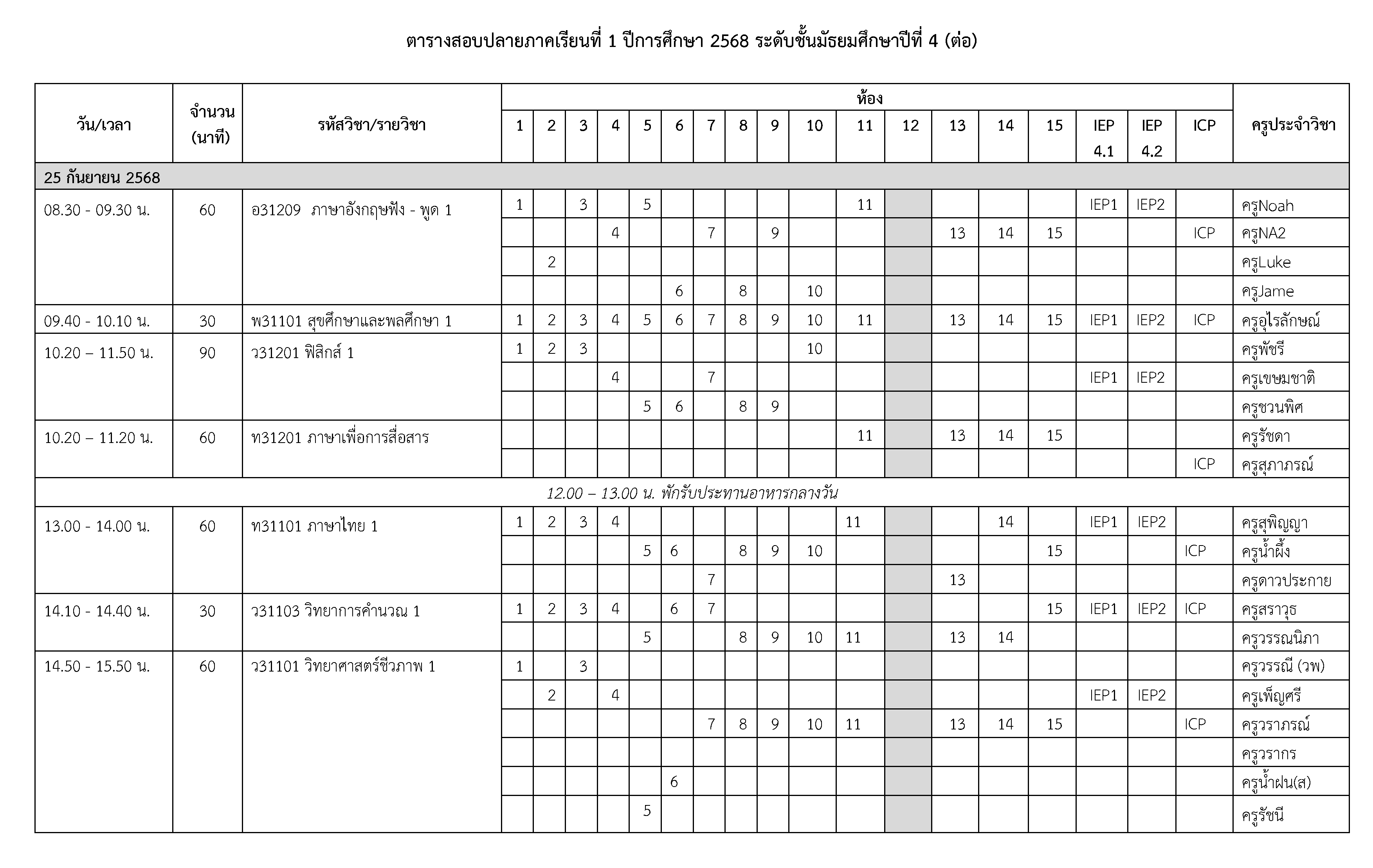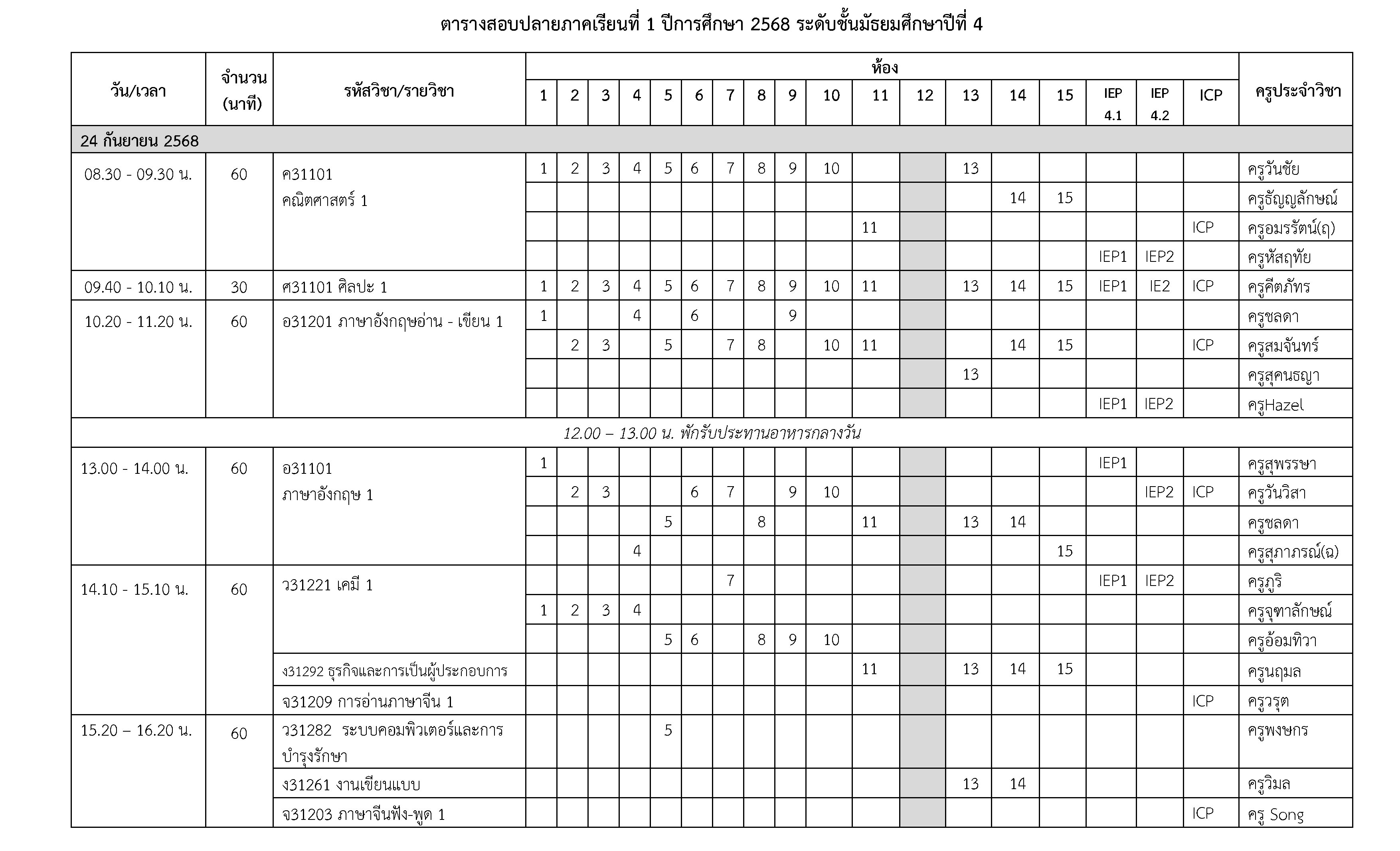 ตารางสอบปลายภาค ภาคเรียนที่ 1 ปีการศึกษา 2568 ชั้น ม.4 วันที่ 24-26 กันยายน 2568