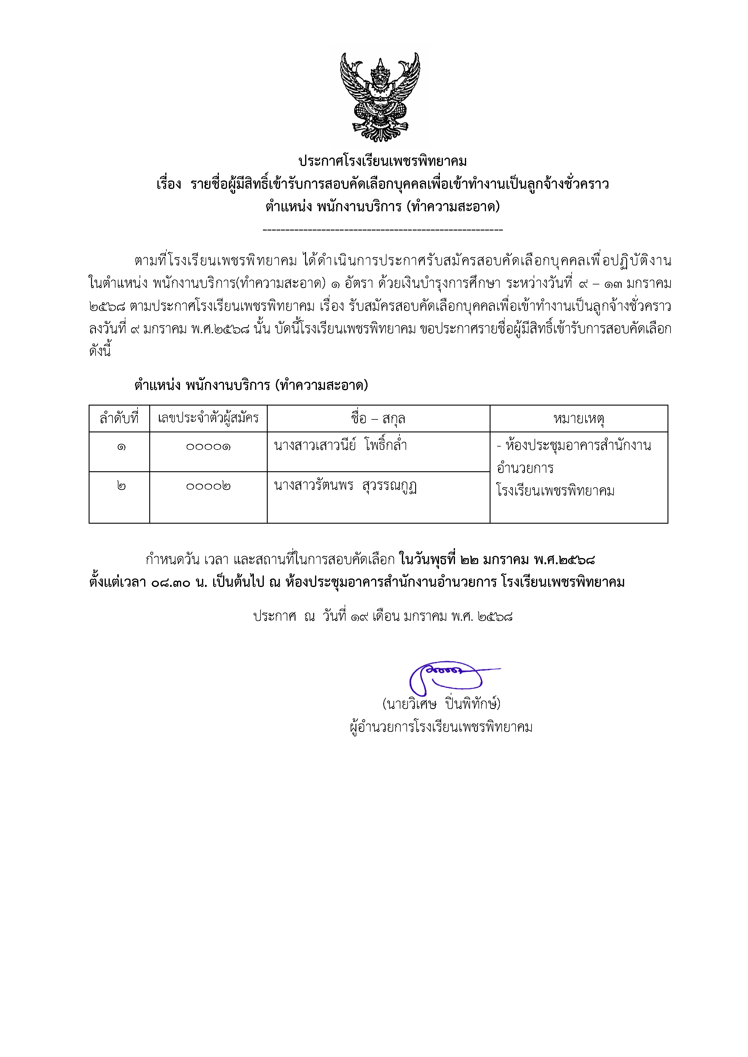 ประกาศโรงเรียนเพชรพิทยาคม เรื่อง รายชื่อผู้มีสิทธิ์เข้ารับการสอบคัดเลือกบุคคลเพื่อเข้าทำงานเป็นลูกจ้างชั่วคราว ตำแหน่ง พนักงานบริการ (ทำความสะอาด)