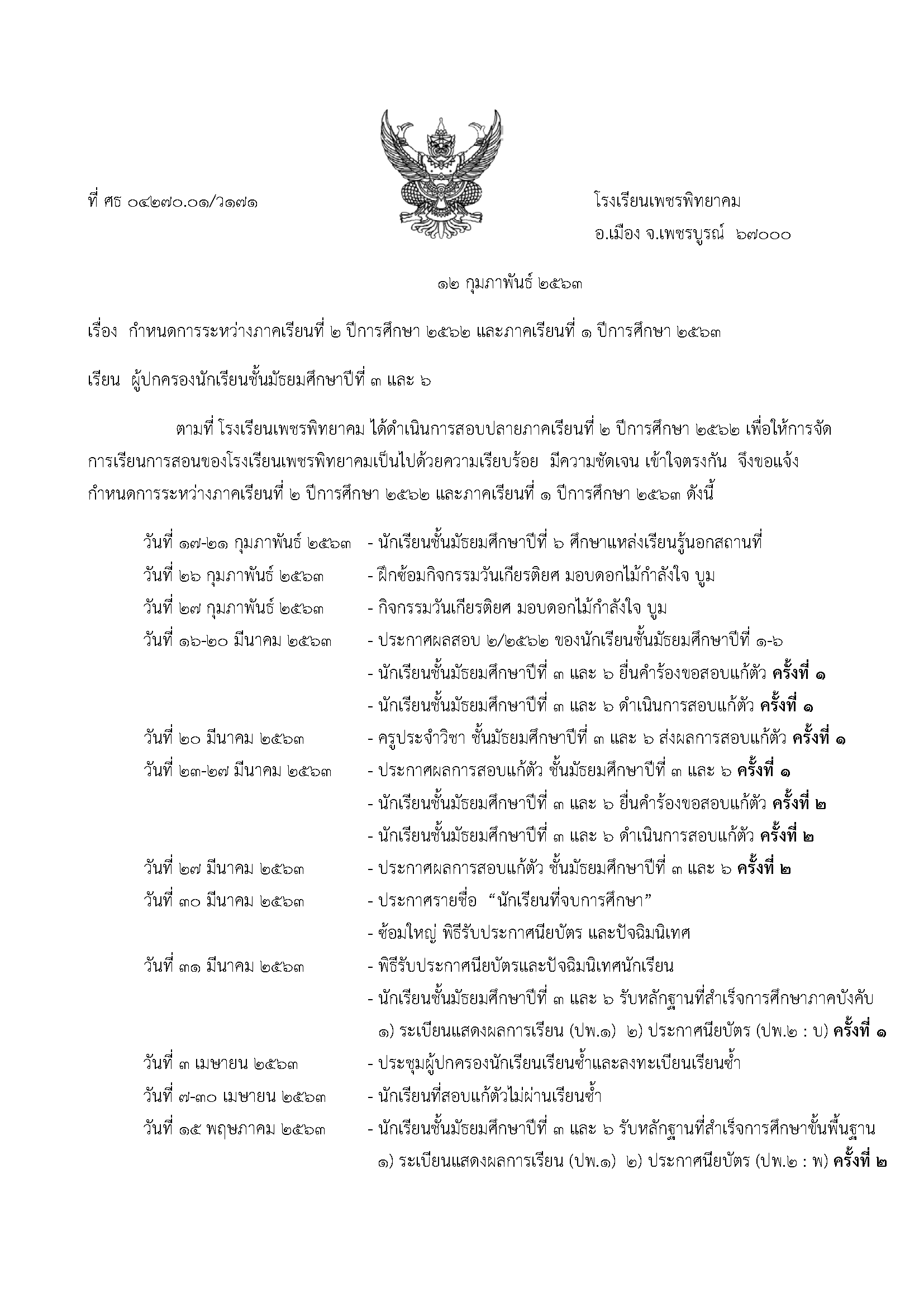 ตามที่ โรงเรียนเพชรพิทยาคม ได้ดำเนินการสอบปลายภาคเรียนที่ 2 ปีการศึกษา 2562 เพื่อให้การจัดการเรียนการสอนของโรงเรียนเพชรพิทยาคมเป็นไปด้วยความเรียบร้อย มีความชัดเจน เข้าใจตรงกัน จึงขอแจ้งกำหนดการระหว่างภาคเรียนที่ 2 ปีการศึกษา 2562 และภาคเรียนที่ 1 ปีการศึกษา 2563 ดังนี้