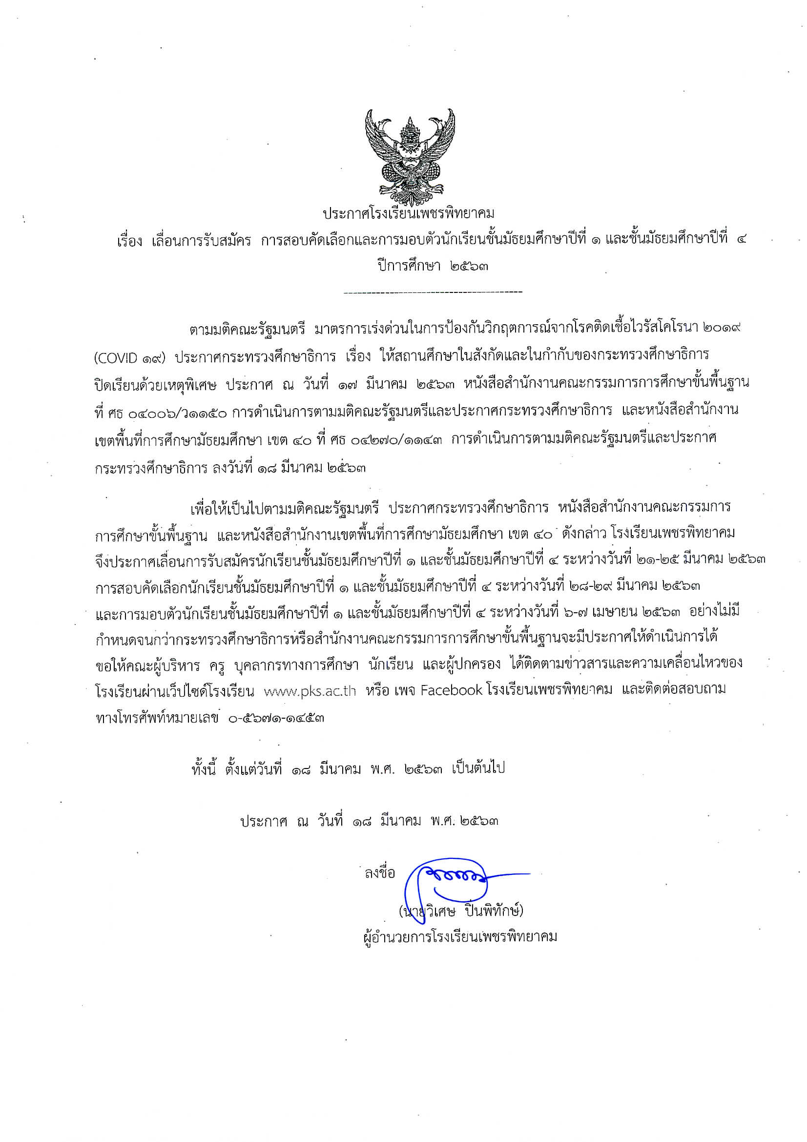 ประกาศโรงเรียนเพชรพิทยาคม เรื่อง เลื่อนการรับสมัคร การสอบคัดเลือกและมอบตัวนักเรียนชั้นมัธยมศึกษาปีที่ 1 และชั้นมัธยมศึกษาปีที่ 4 ปีการศึกษา 2563