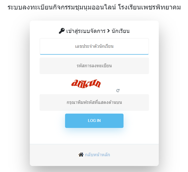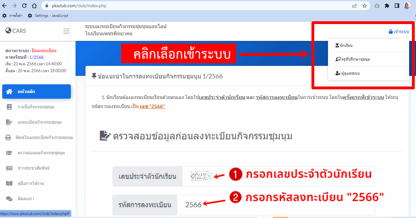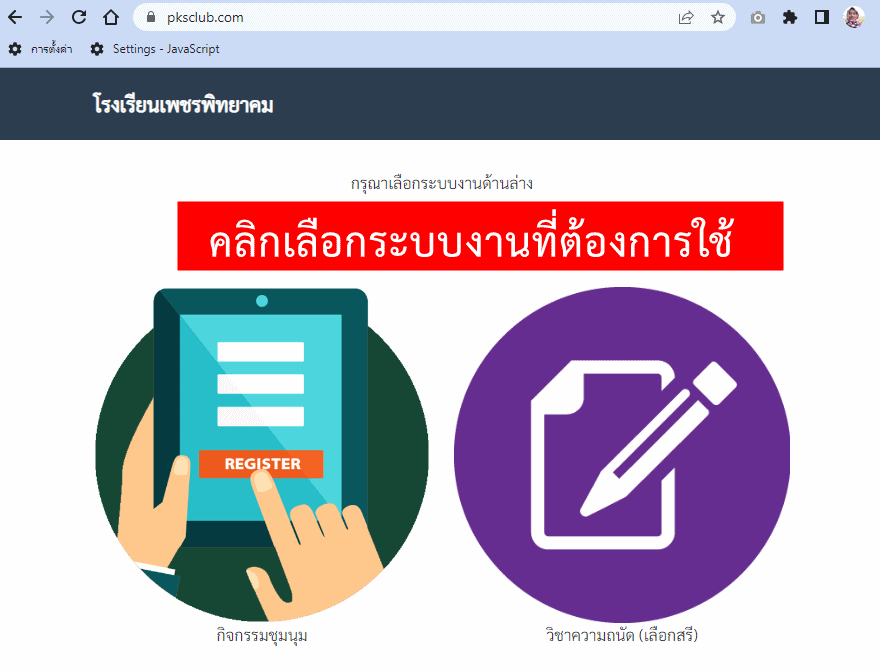 1) เข้าเว็บไซต์ระบบกิจกรรมชุมนุม และวิชาความถนัด(เลือกเสรี) โดยตรง โดยพิมพ์ URL ได้ที่ https://www.pksclub.com