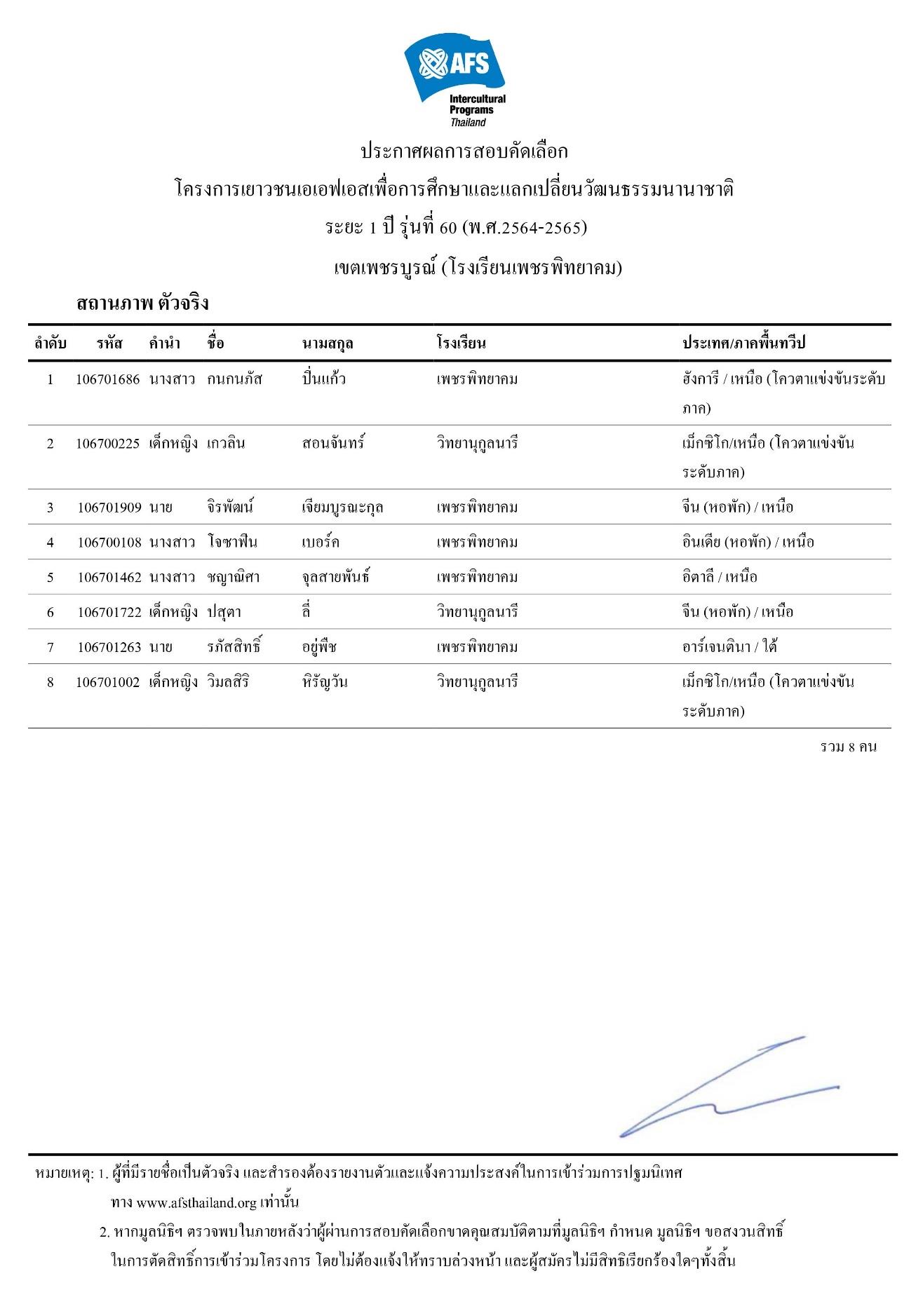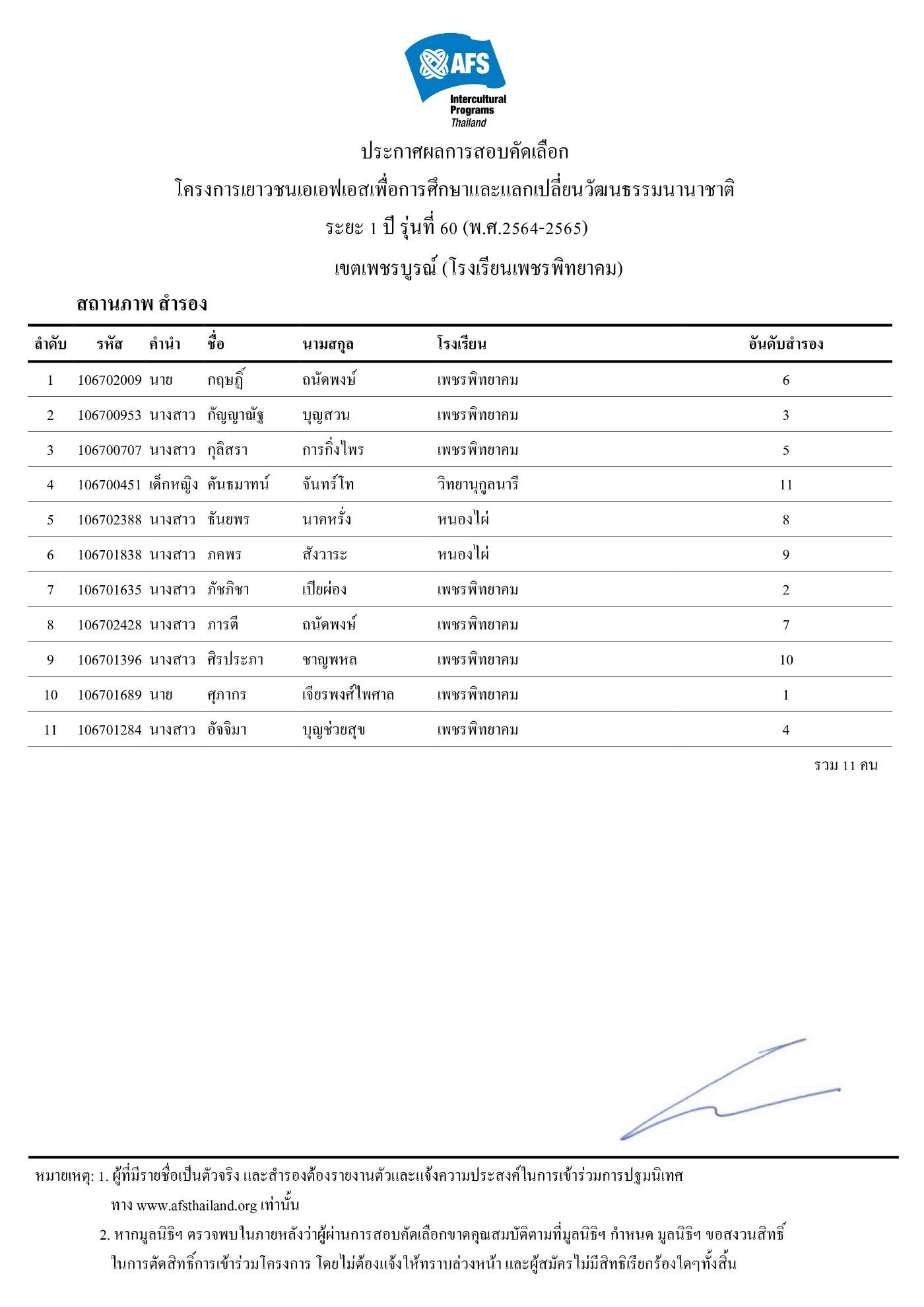 ประกาศผลการสอบคัดเลือก โครงการเยาวชนเอเอฟเอสเพื่อการศึกษาและแลกเปลี่ยนวัฒนธรรมนานาชาติ ระยะ 1 ปี รุ่นที่ 60 (พ.ศ.2564-2565) เขตเพชรบูรณ์