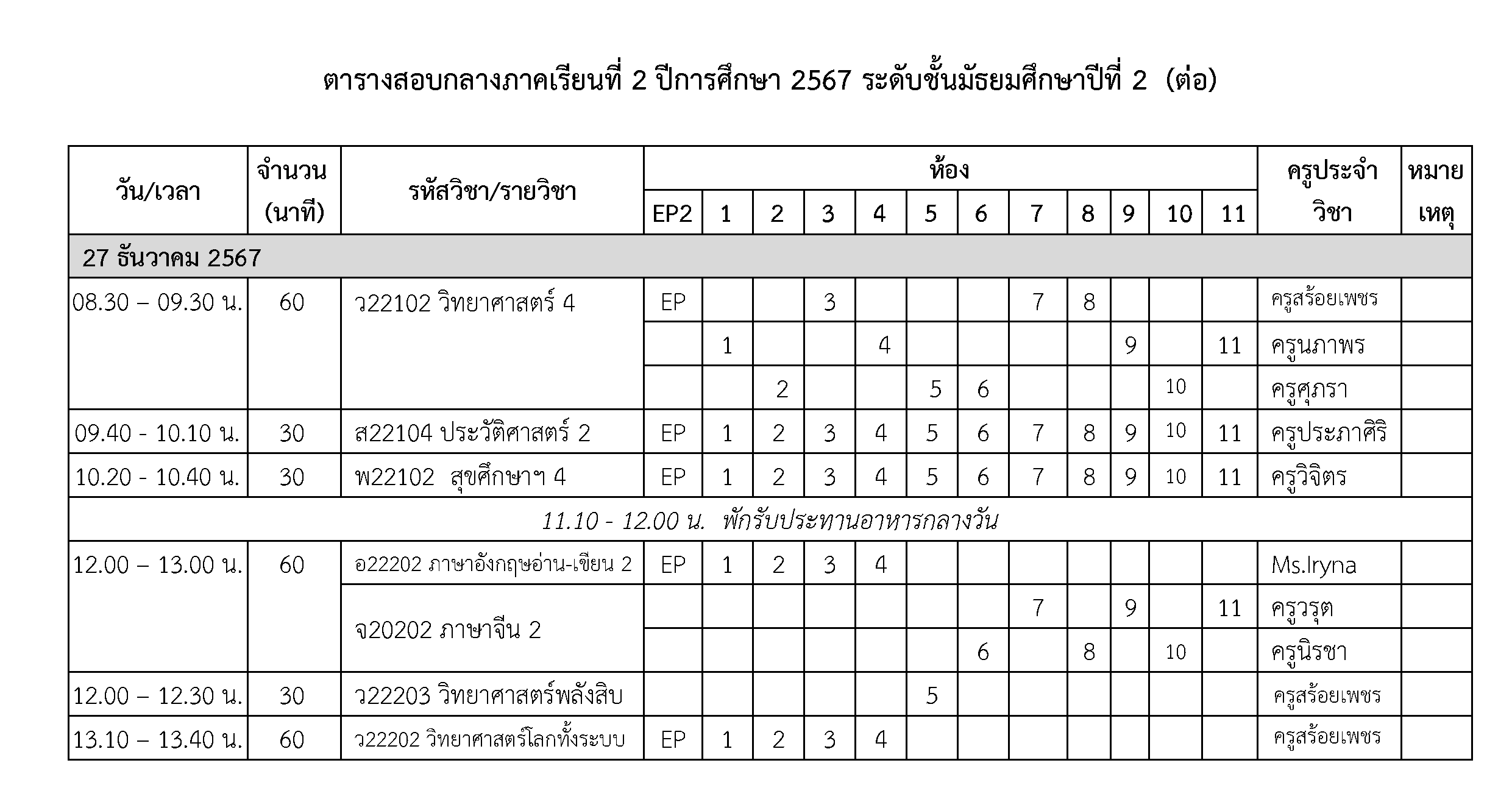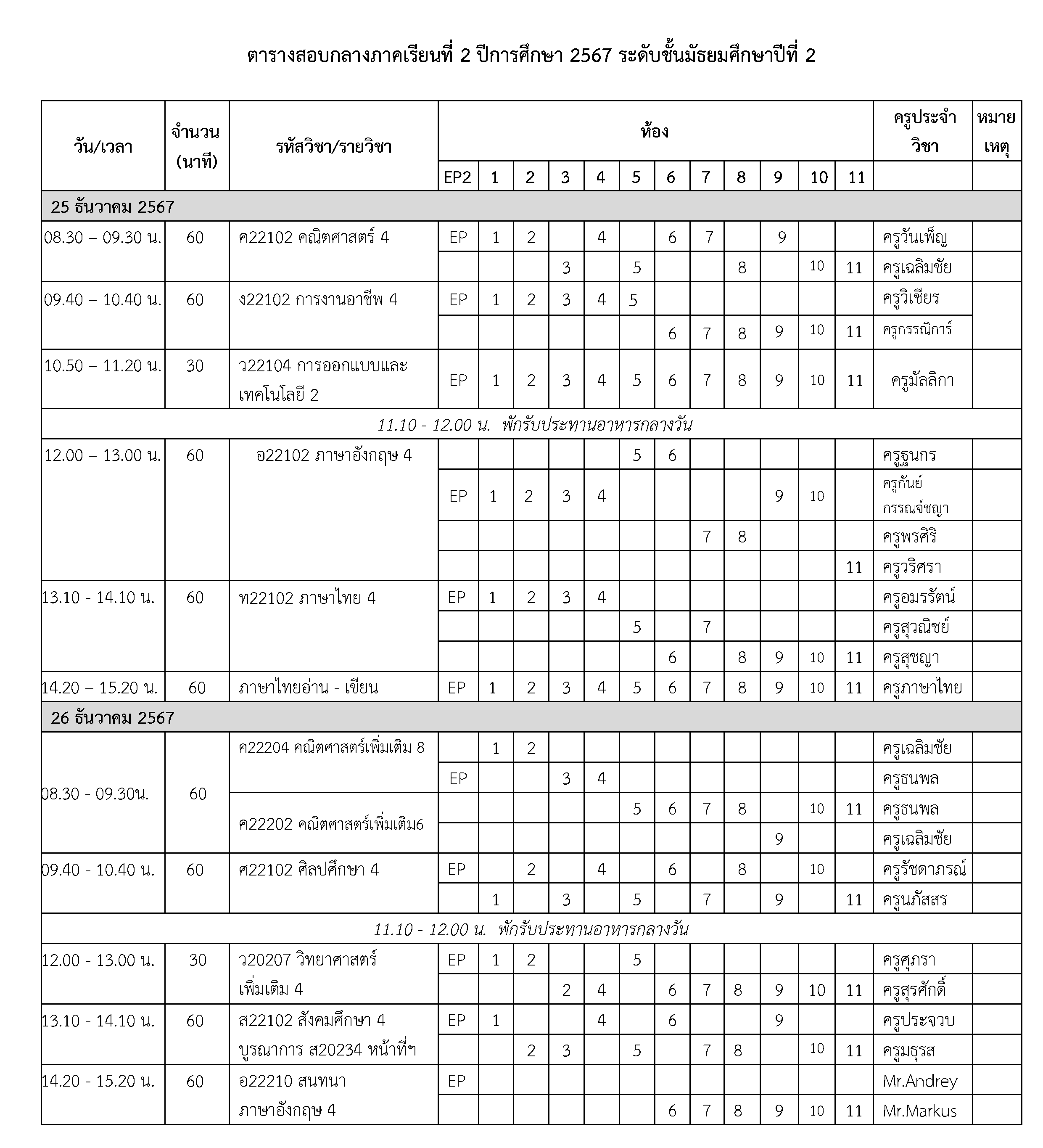 ตารางสอบกลางภาคเรียนที่ 2 ปีการศึกษา 2567 ระดับชั้นมัธยมศึกษาปีที่ 2 ระหว่างวันที่ 25 - 27 ธันวาคม 2567