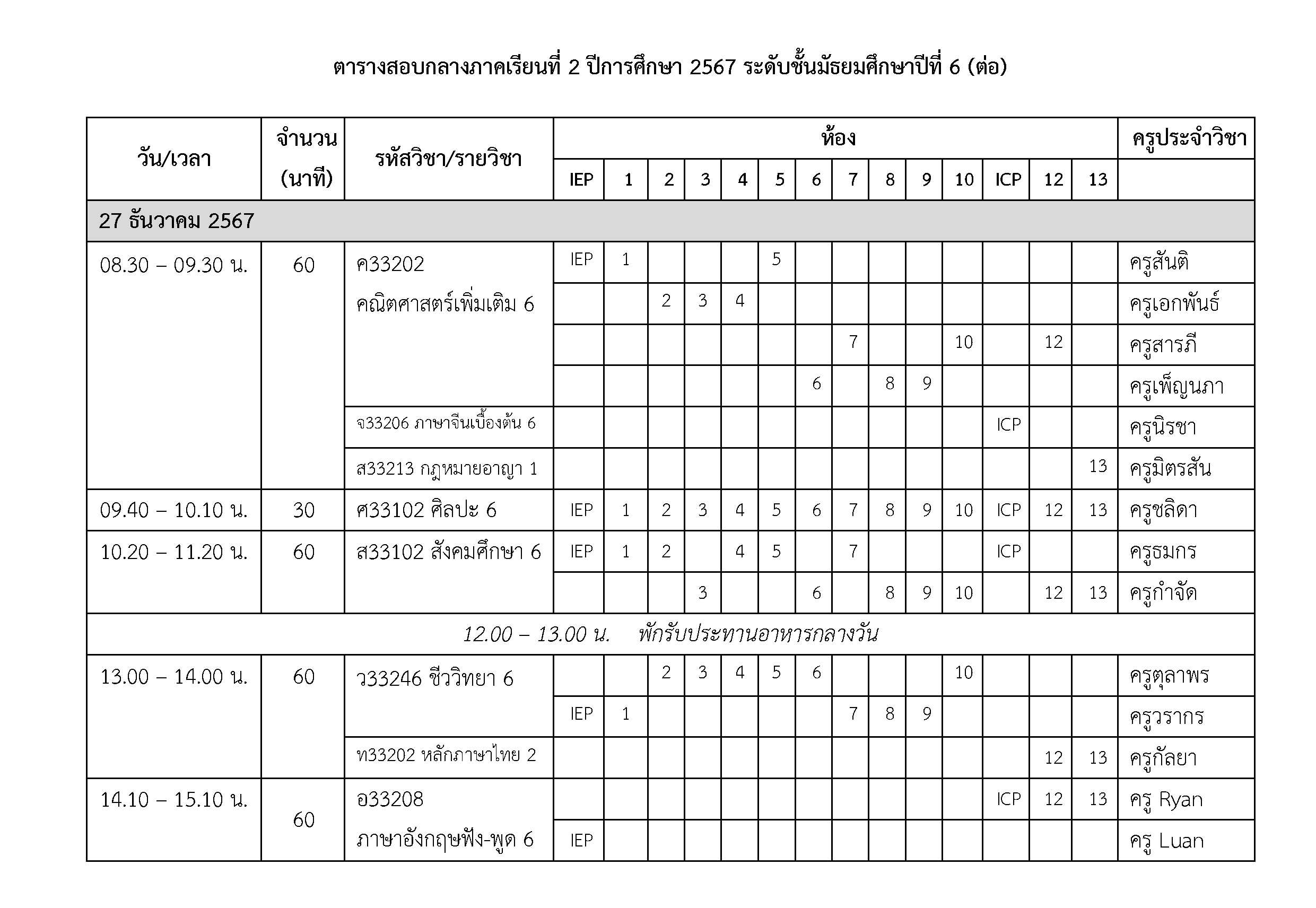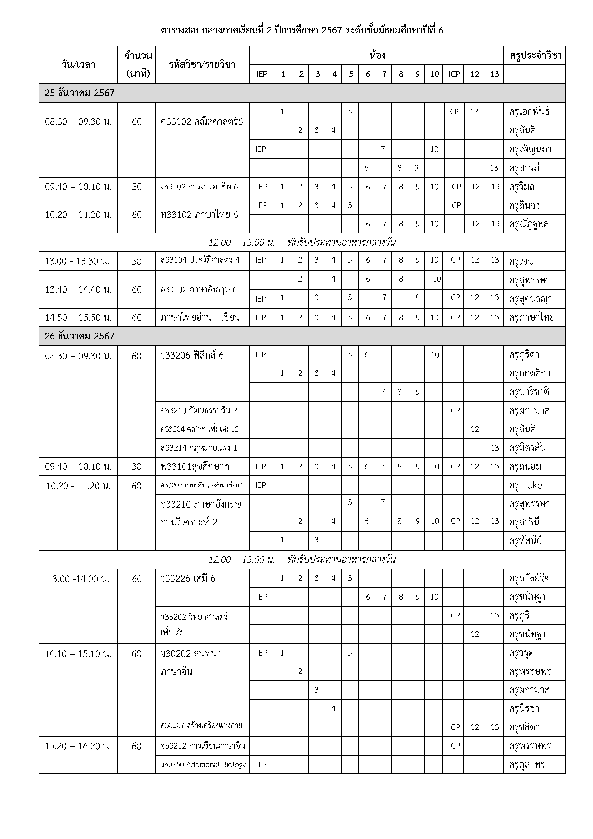 ตารางสอบกลางภาคเรียนที่ 2 ปีการศึกษา 2567 ระดับชั้นมัธยมศึกษาปีที่ 6 ระหว่างวันที่ 25 - 27 ธันวาคม 2567