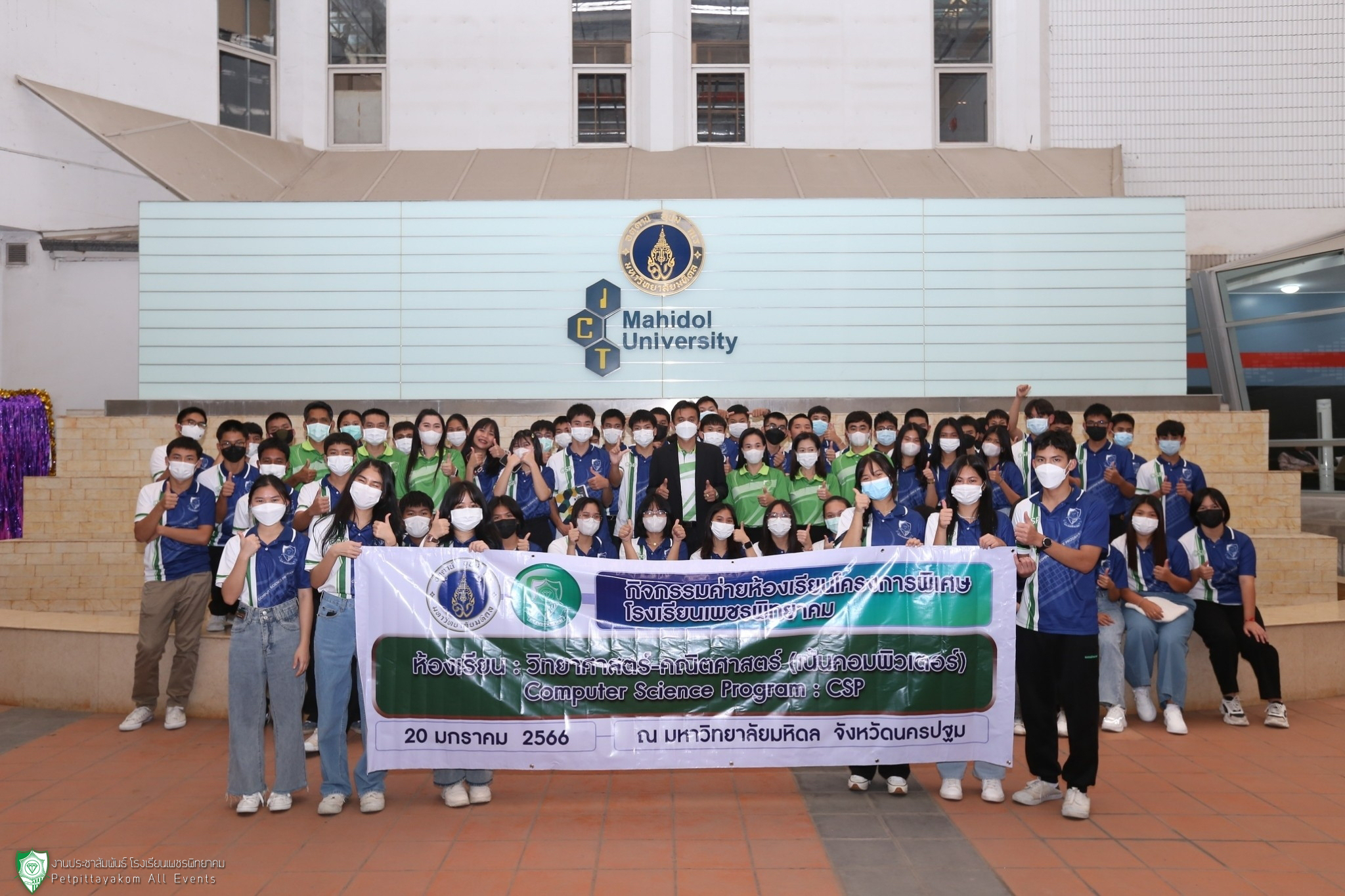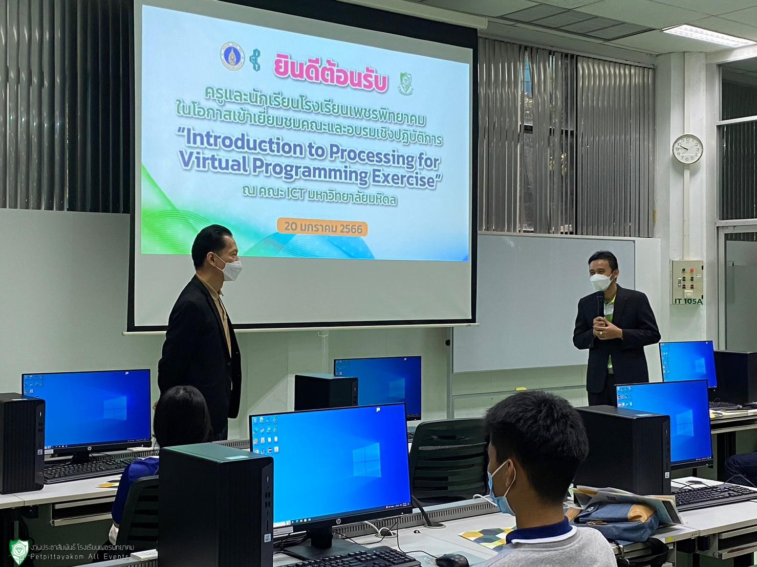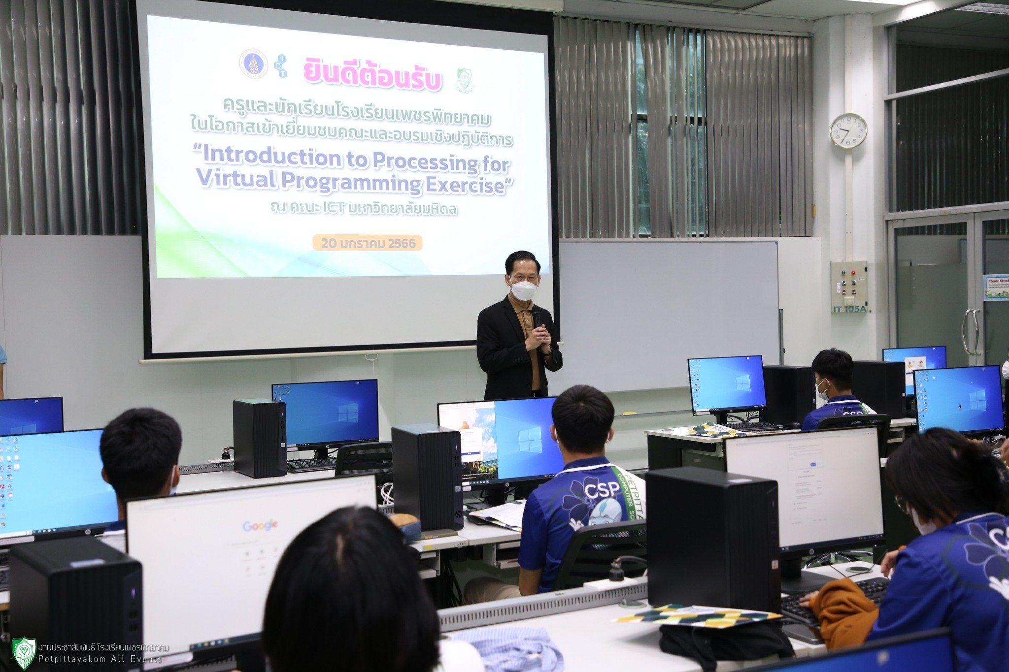 วันที่ 20 มกราคม 2566 นายนิรุทธ์ แก้วนิคม รองผู้อำนวยการโรงเรียนเพชรพิทยาคม พร้อมด้วยคณะครู และนักเรียนชั้นมัธยมศึกษาปีที่ 4 – 5 ห้องเรียนพิเศษ วิทยาศาสตร์-คณิตศาสตร์ เน้นคอมพิวเตอร์ (Computer Science Program : CSP) โรงเรียนเพชรพิทยาคม จ.เพชรบูรณ์ จำนวนกว่า 70 คน เข้าเยี่ยมชมคณะ และเข้าร่วมอบรมเชิงปฏิบัติการ Basic Programming: Introduction to Processing for virtual programming exercise คณะ ICT มหาวิทยาลัยมหิดล ศาลายา