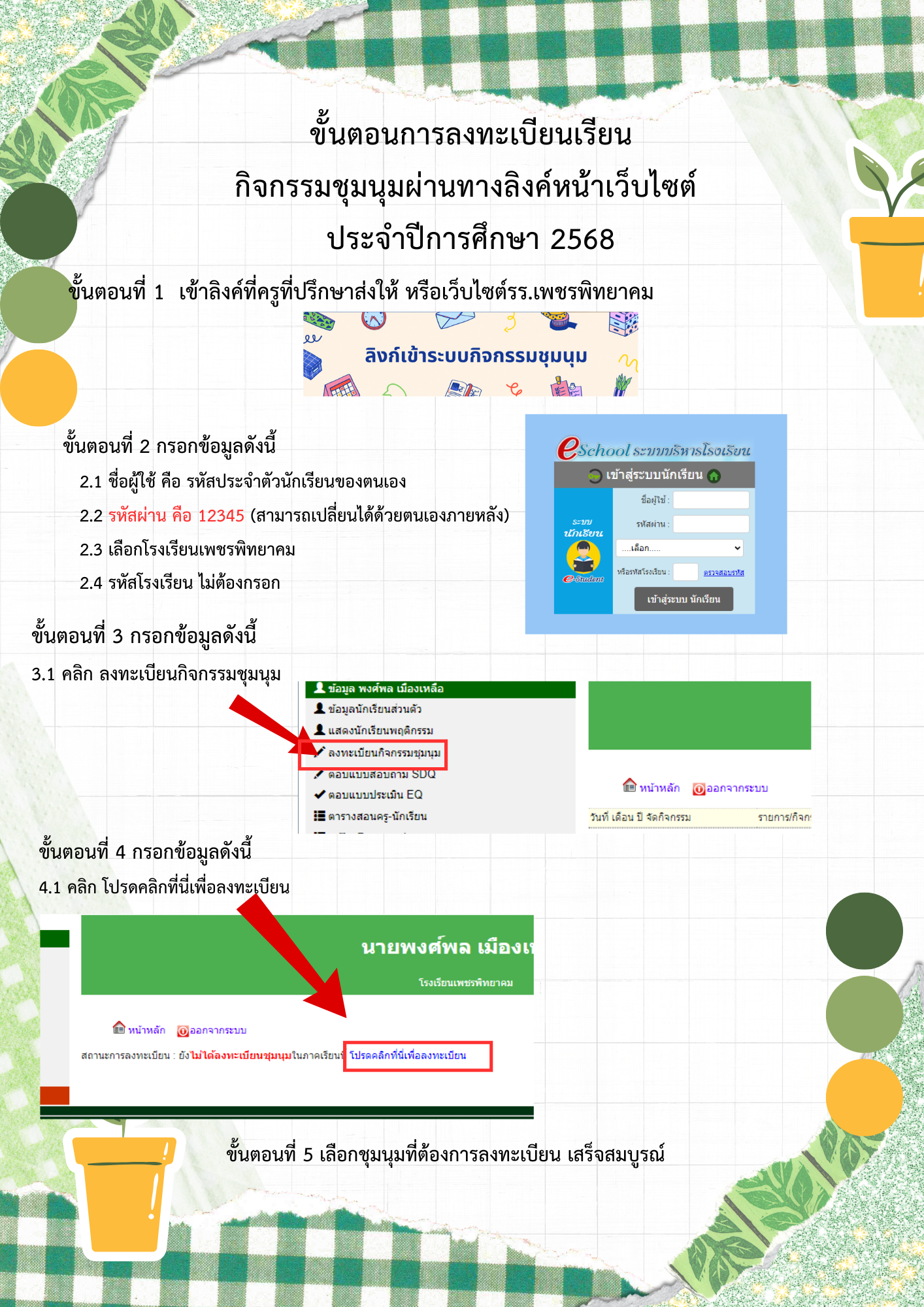วิธีการลงทะเบียน กิจกรรมชุมนุมผ่านทางระบบ E-SCHOOL กิจกรรมชุมนุม วันที่ 20 พฤษภาคม 2568 เปิดระบบ 20 พ.ค.68 เวลา 14.40 น.- ปิดระบบ 24.00 น.