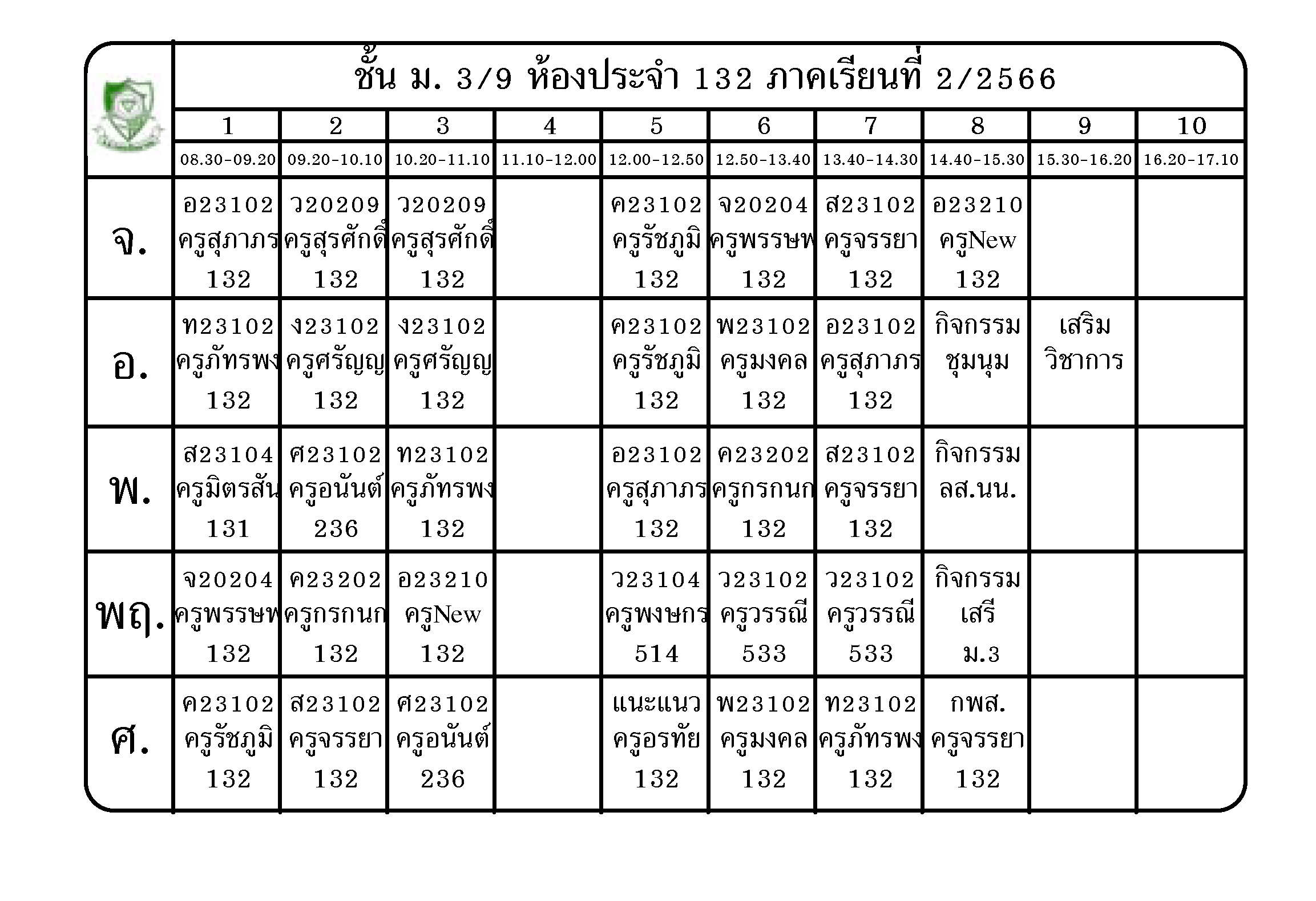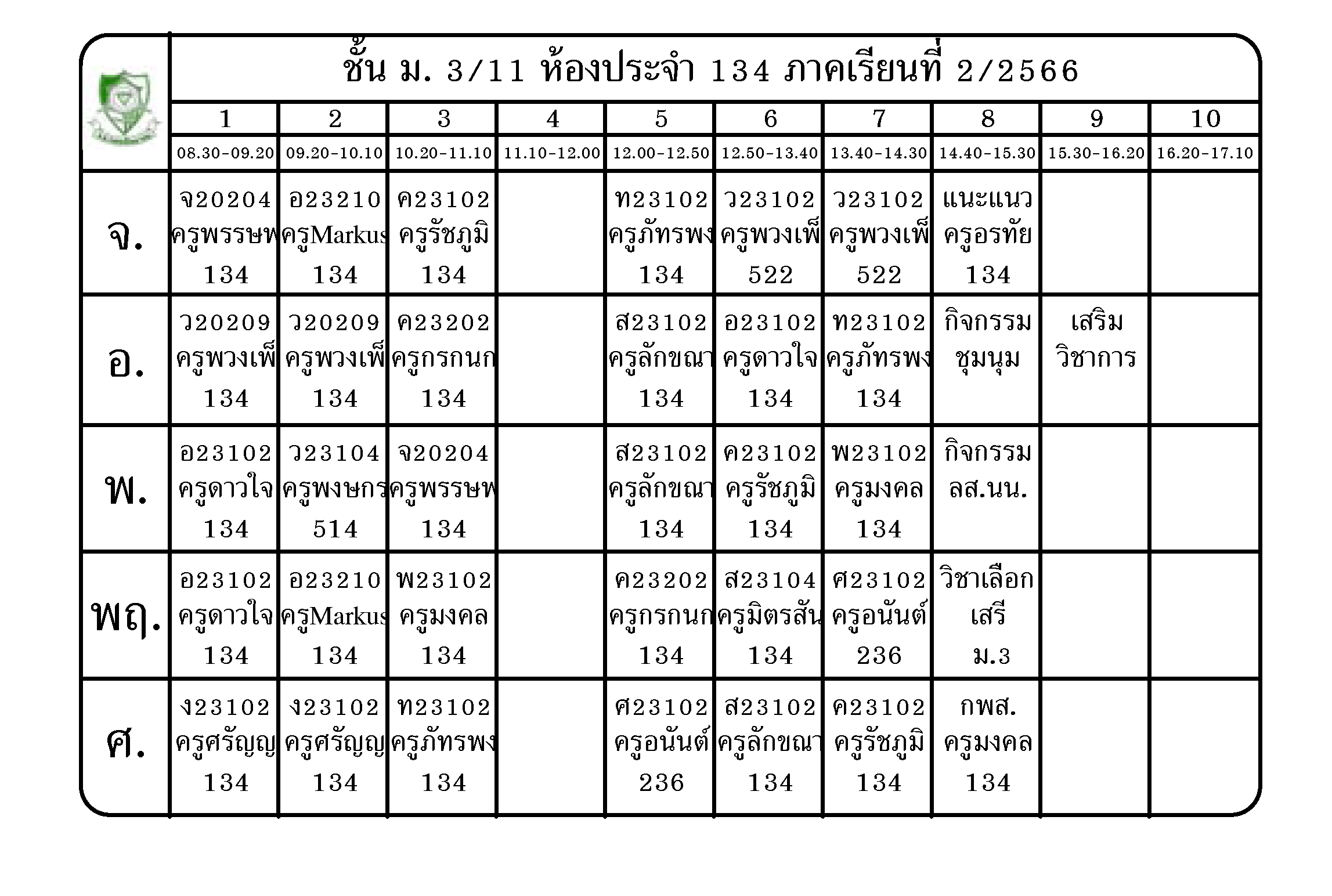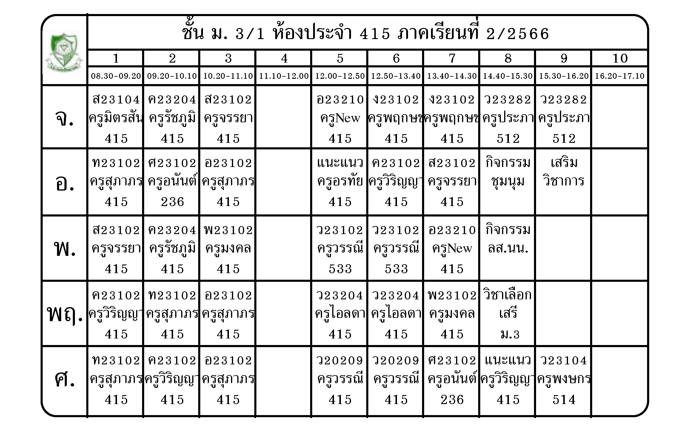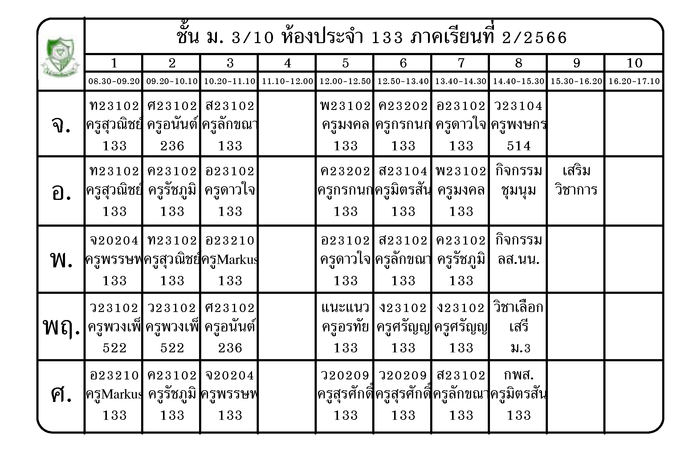 ตารางเรียน นักเรียนชั้น ม.3 ภาคเรียนที่ 2 ปีการศึกษา 2566