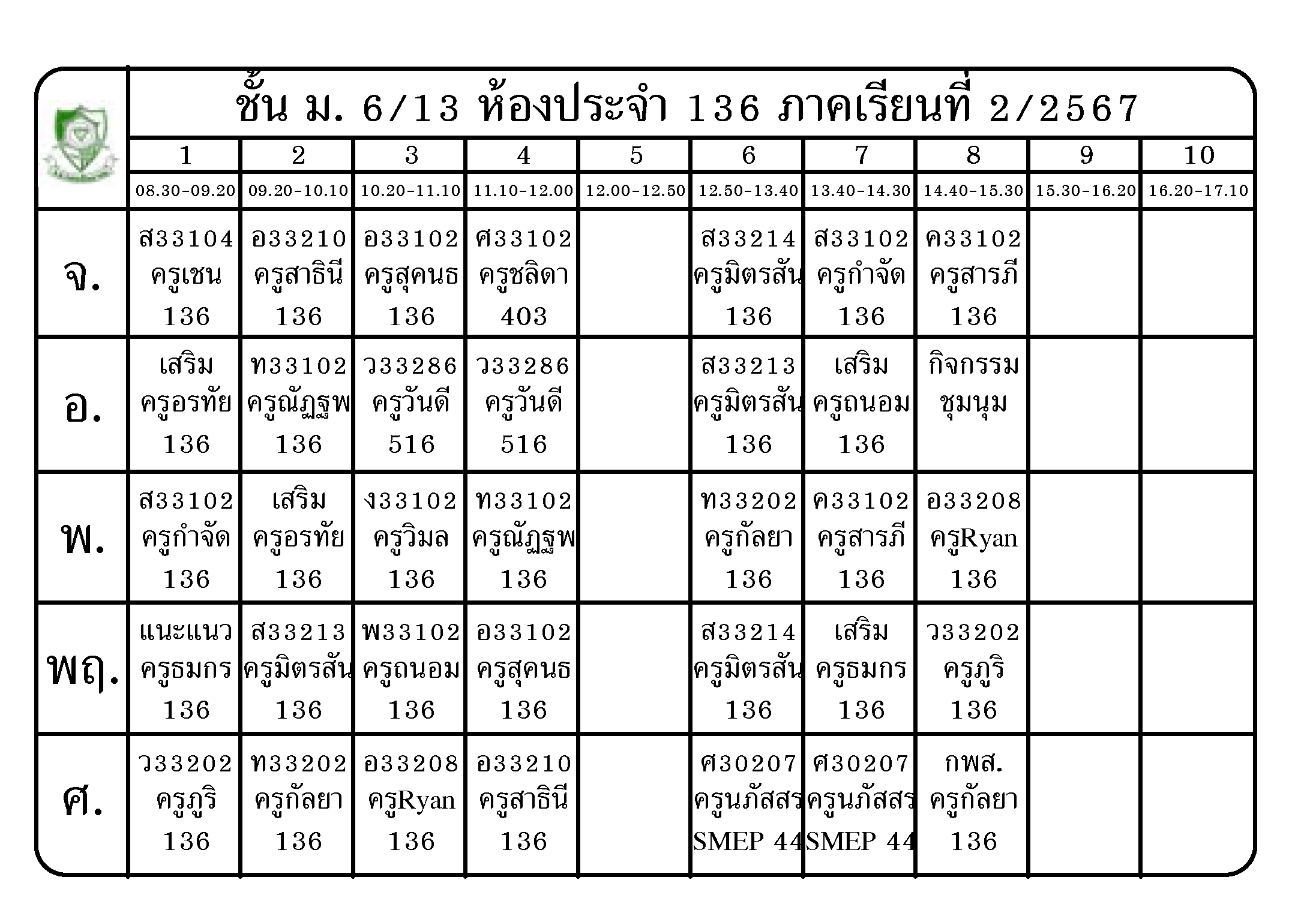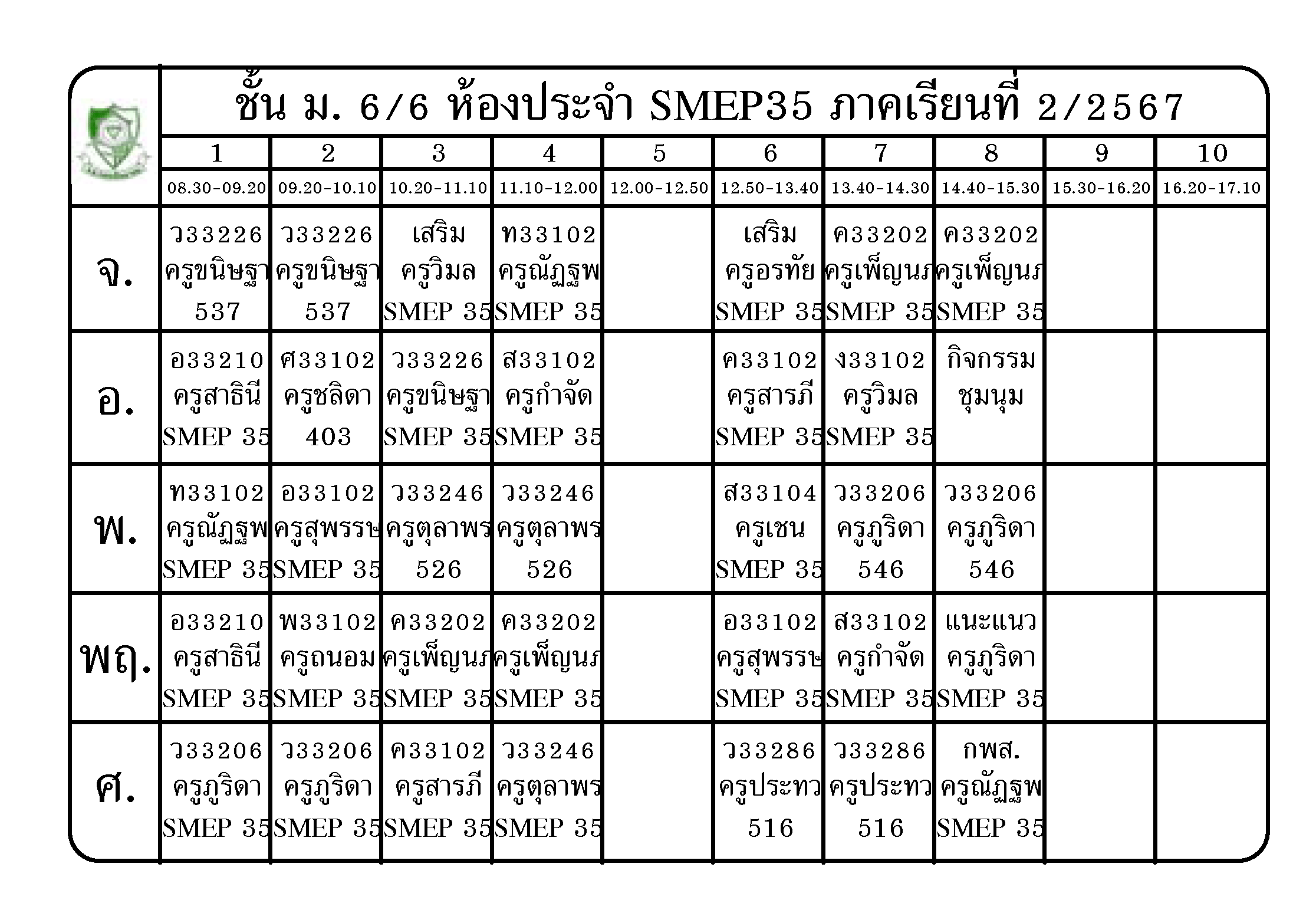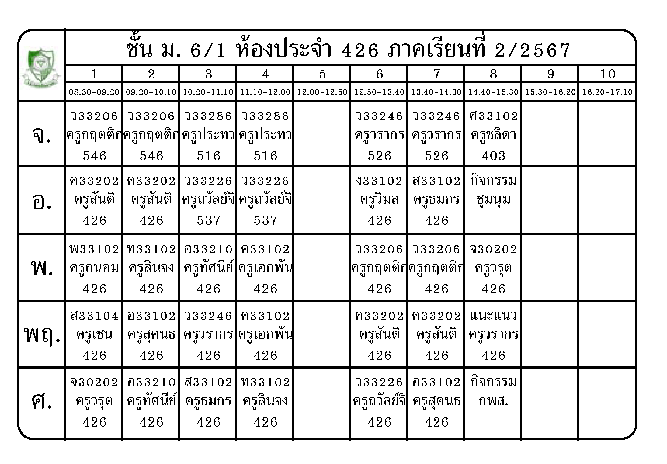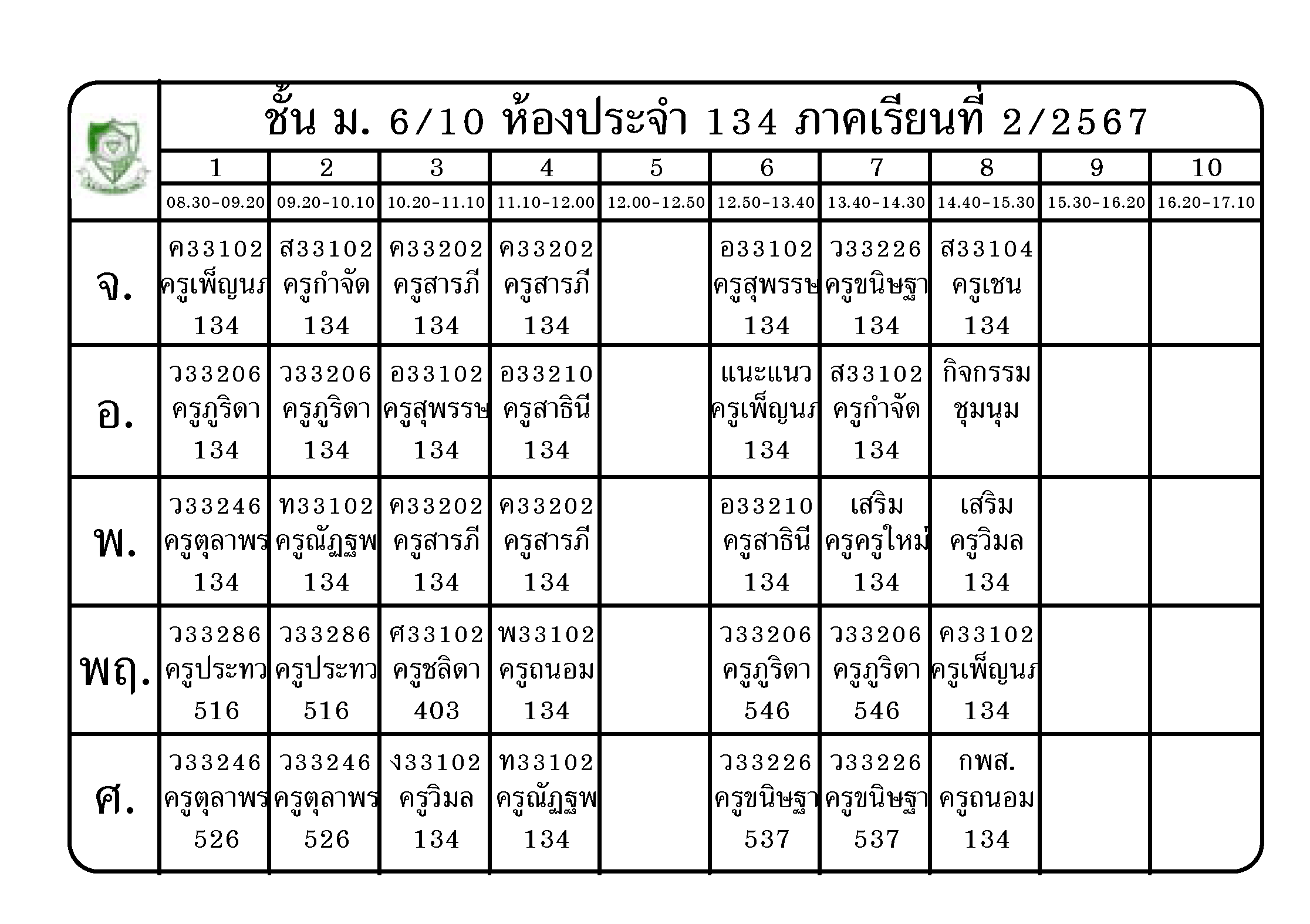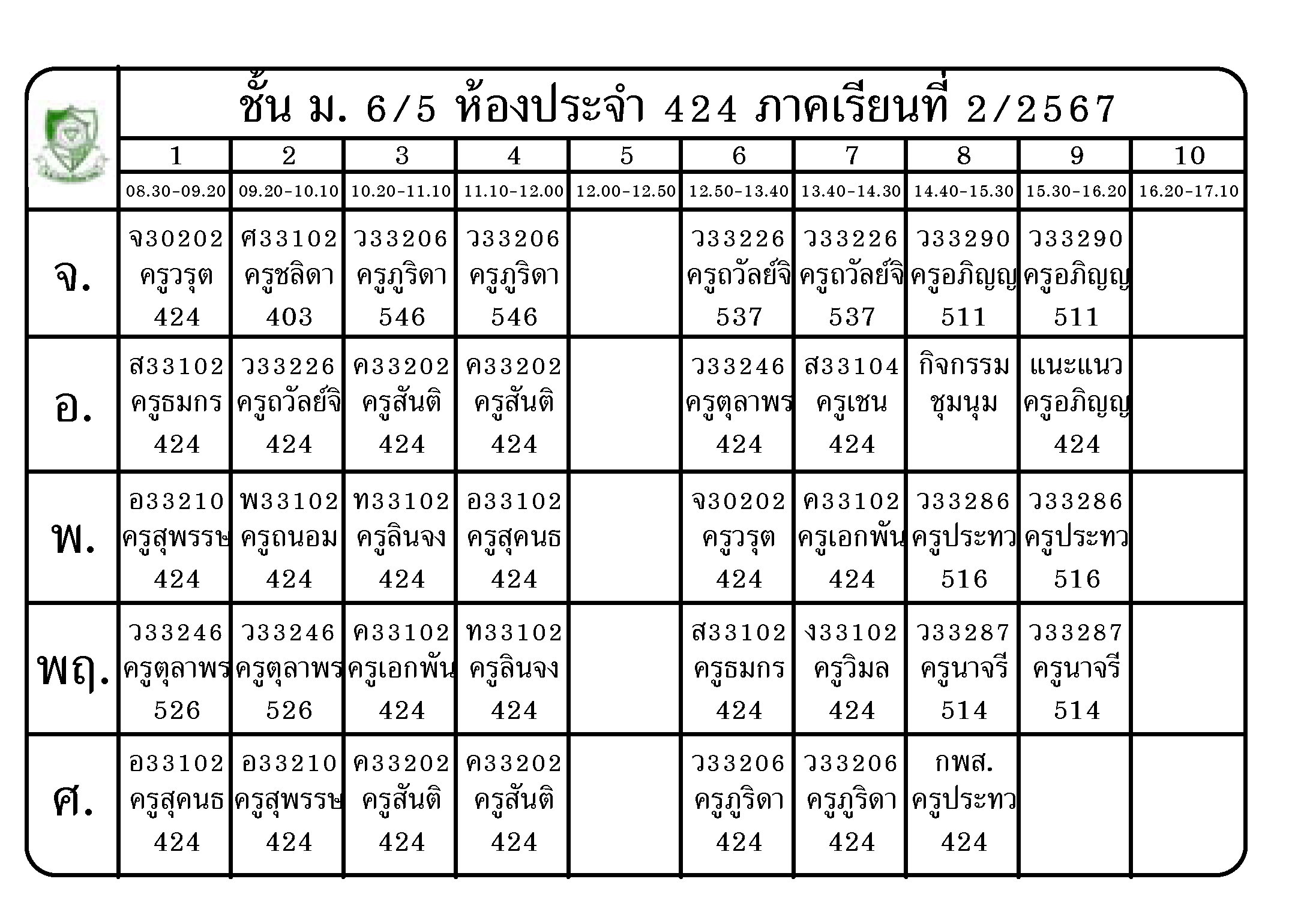 ตารางเรียน ภาคเรียนที่ 2 ปีการศึกษา 2567 ระดับชั้นมัธยมศึกษาปีที่ 6