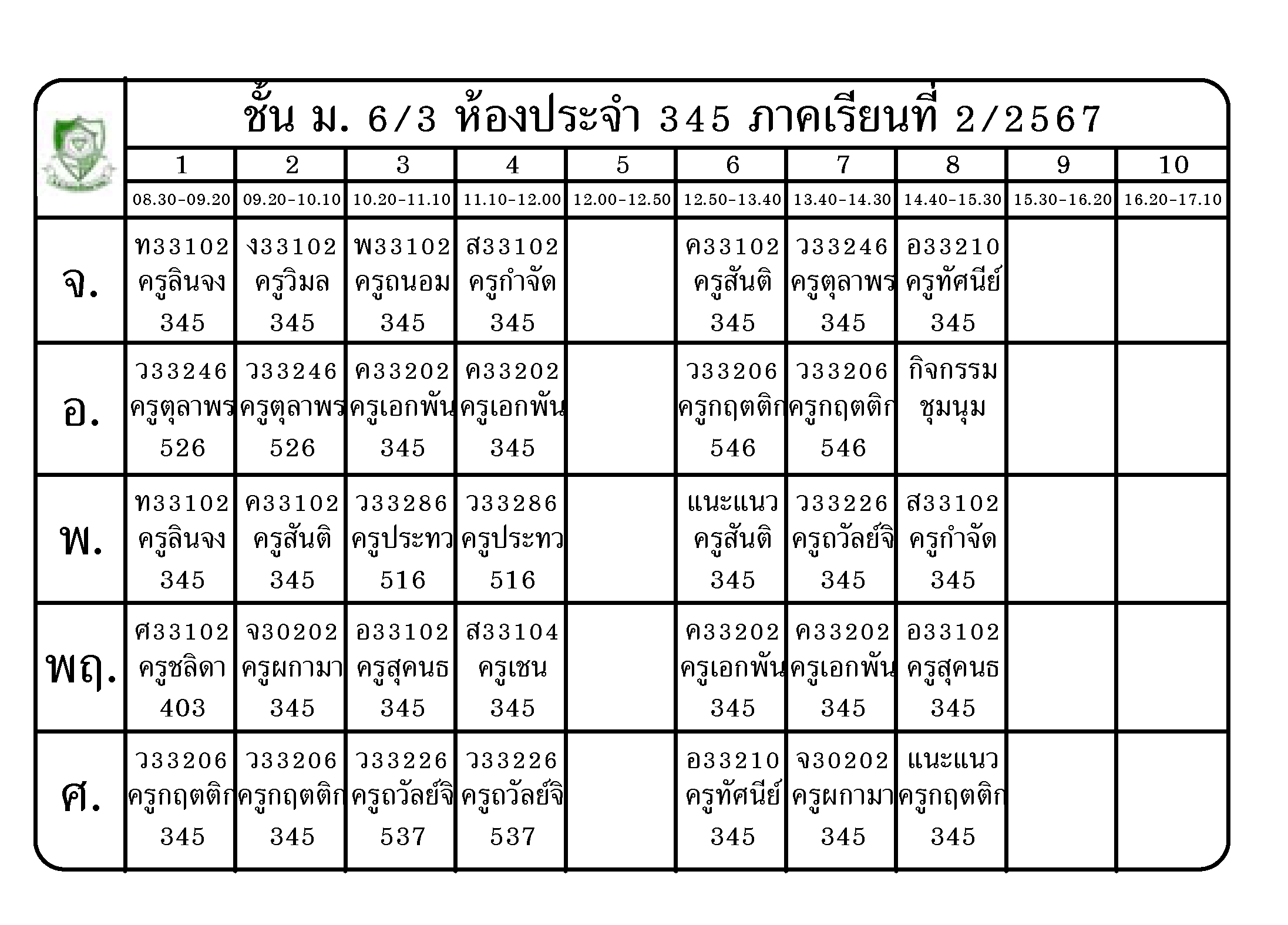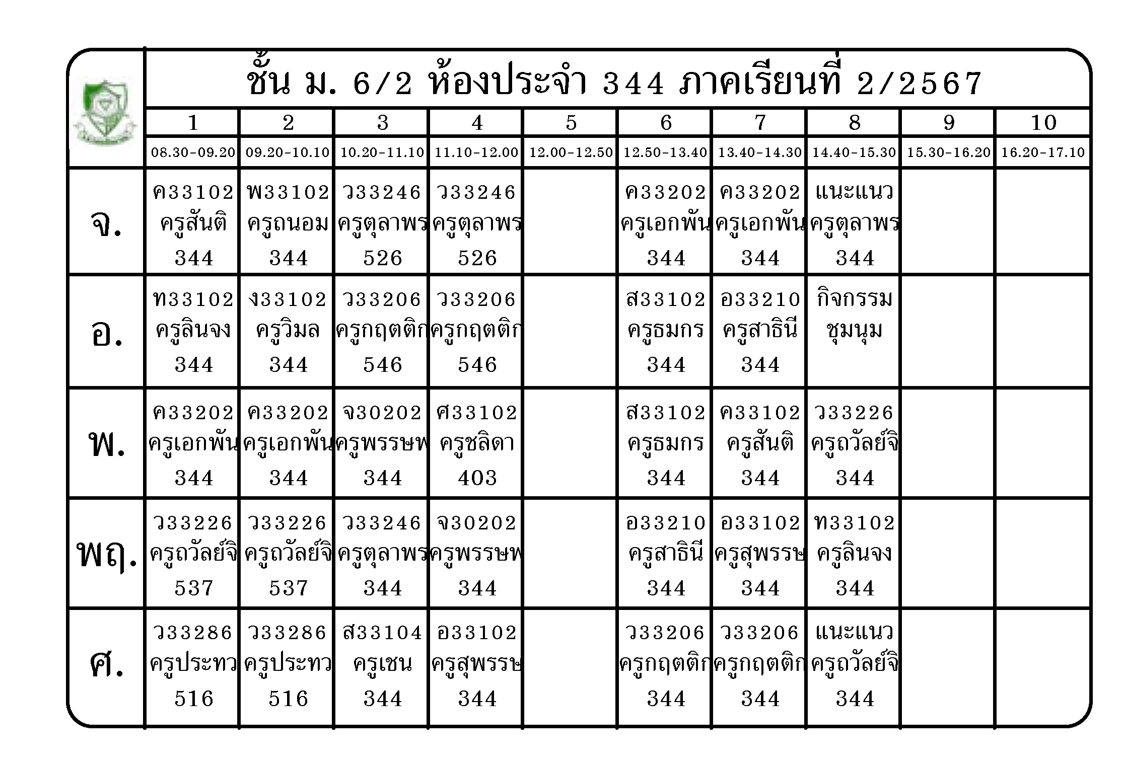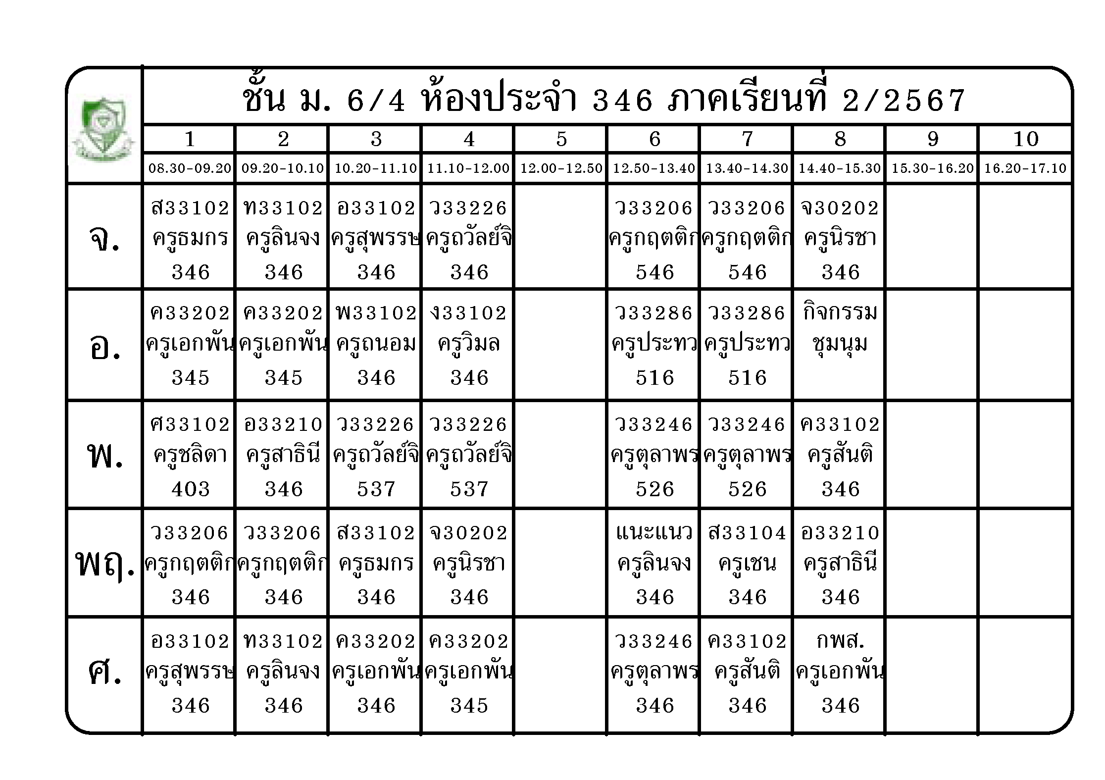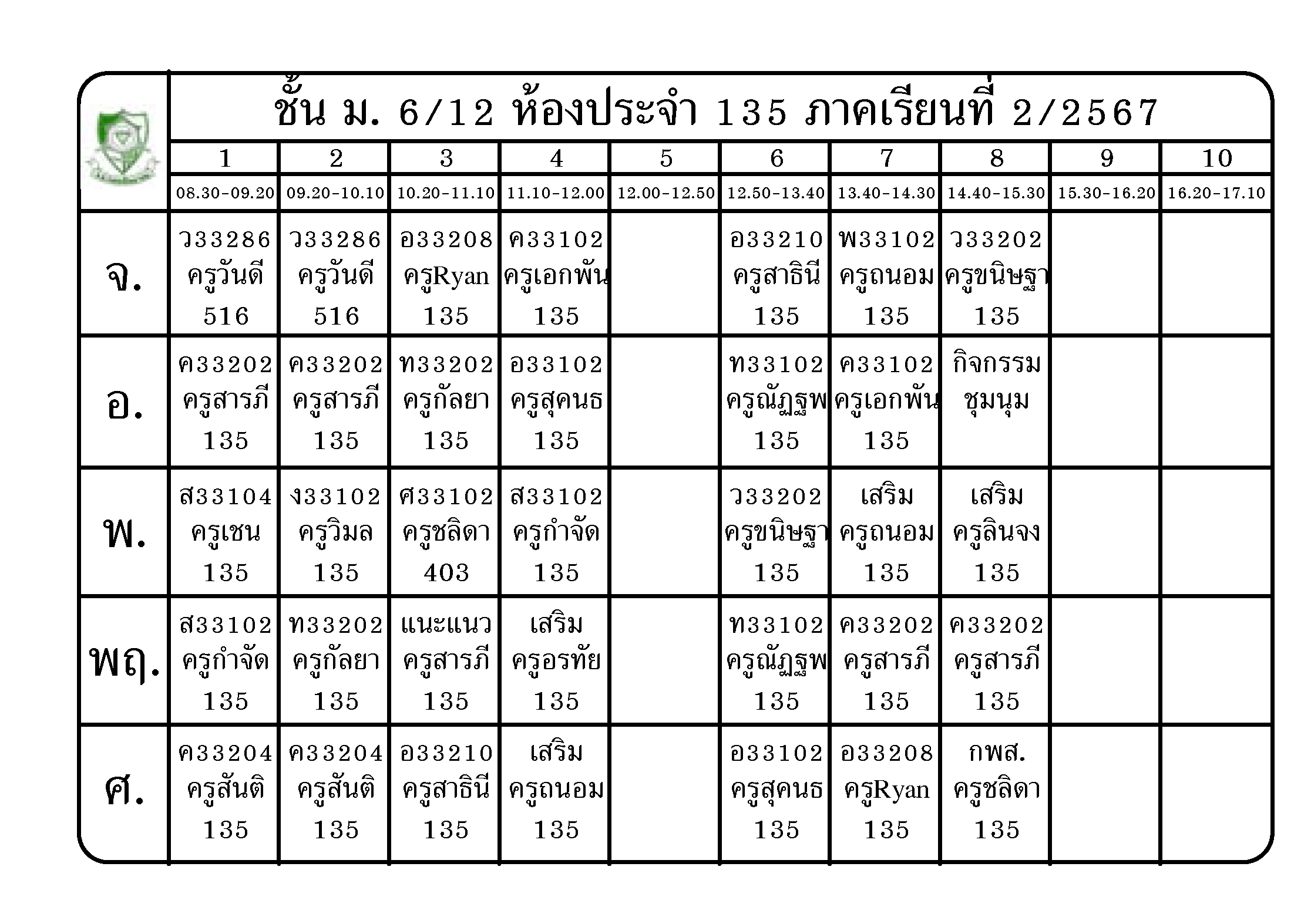 ตารางเรียน ภาคเรียนที่ 2 ปีการศึกษา 2567 ระดับชั้นมัธยมศึกษาปีที่ 6