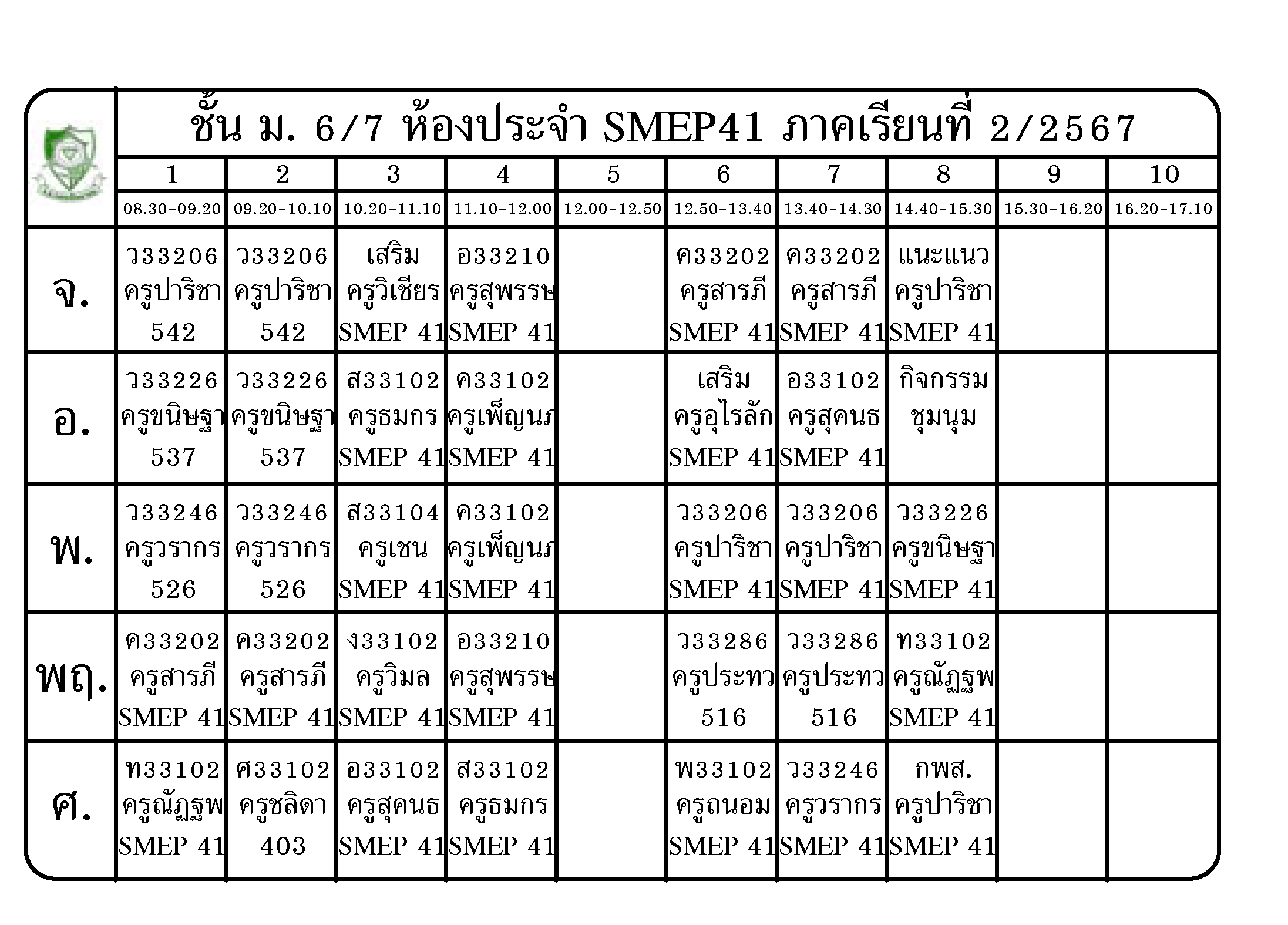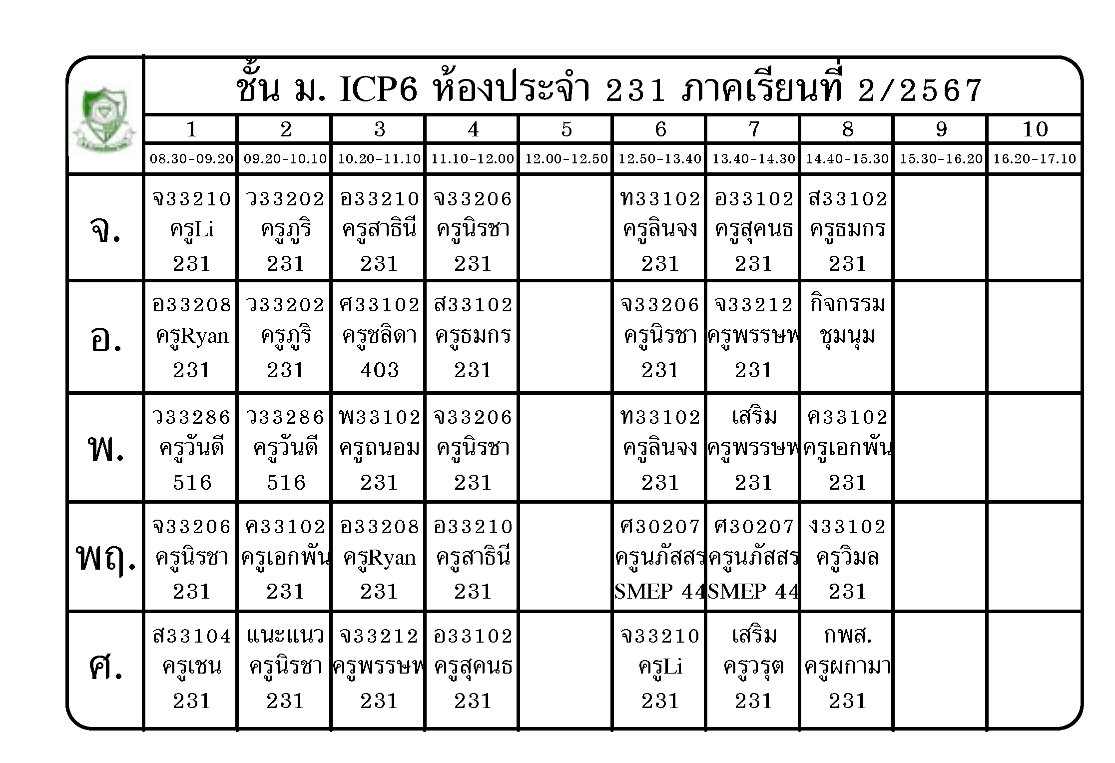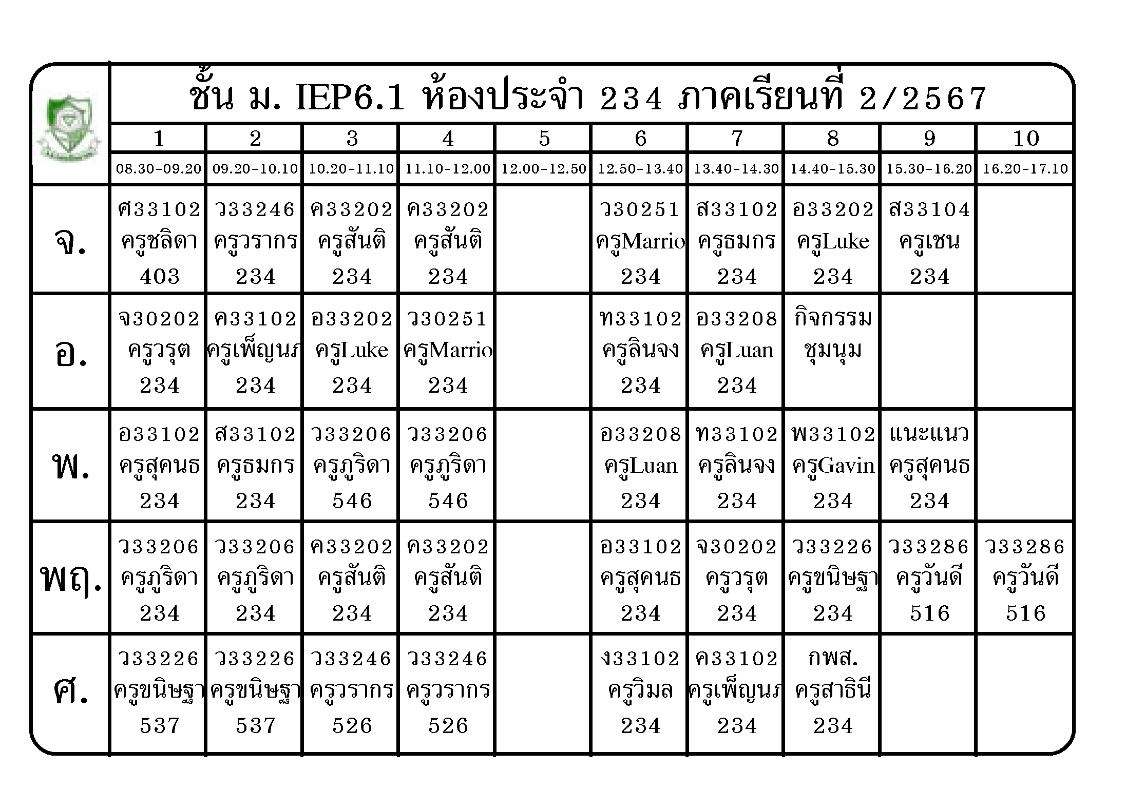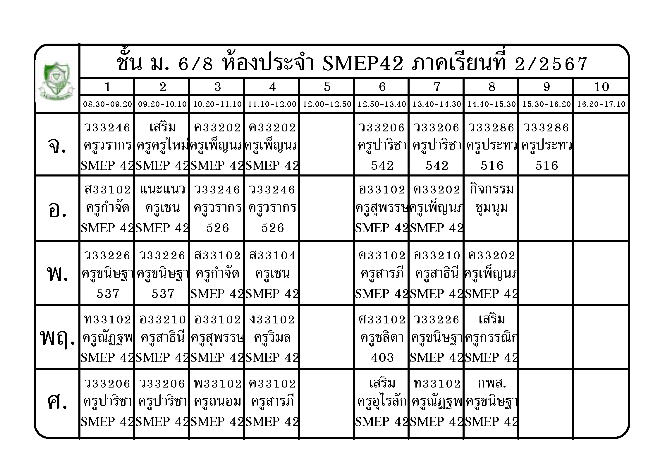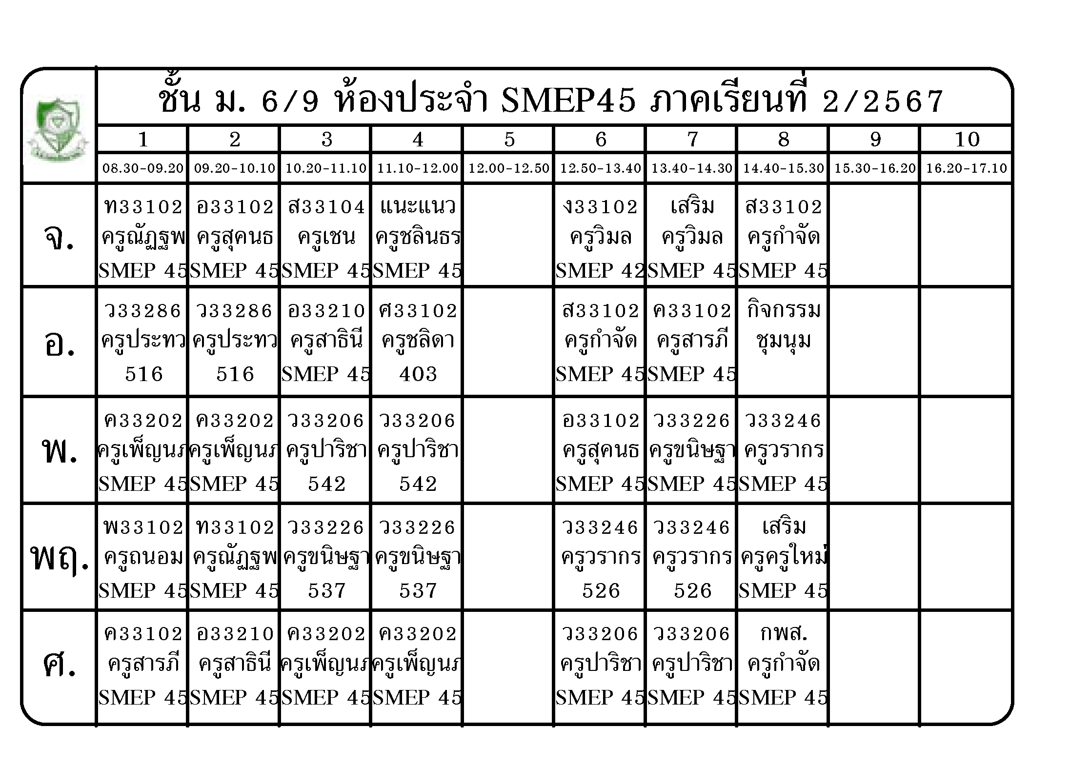 ตารางเรียน ภาคเรียนที่ 2 ปีการศึกษา 2567 ระดับชั้นมัธยมศึกษาปีที่ 6