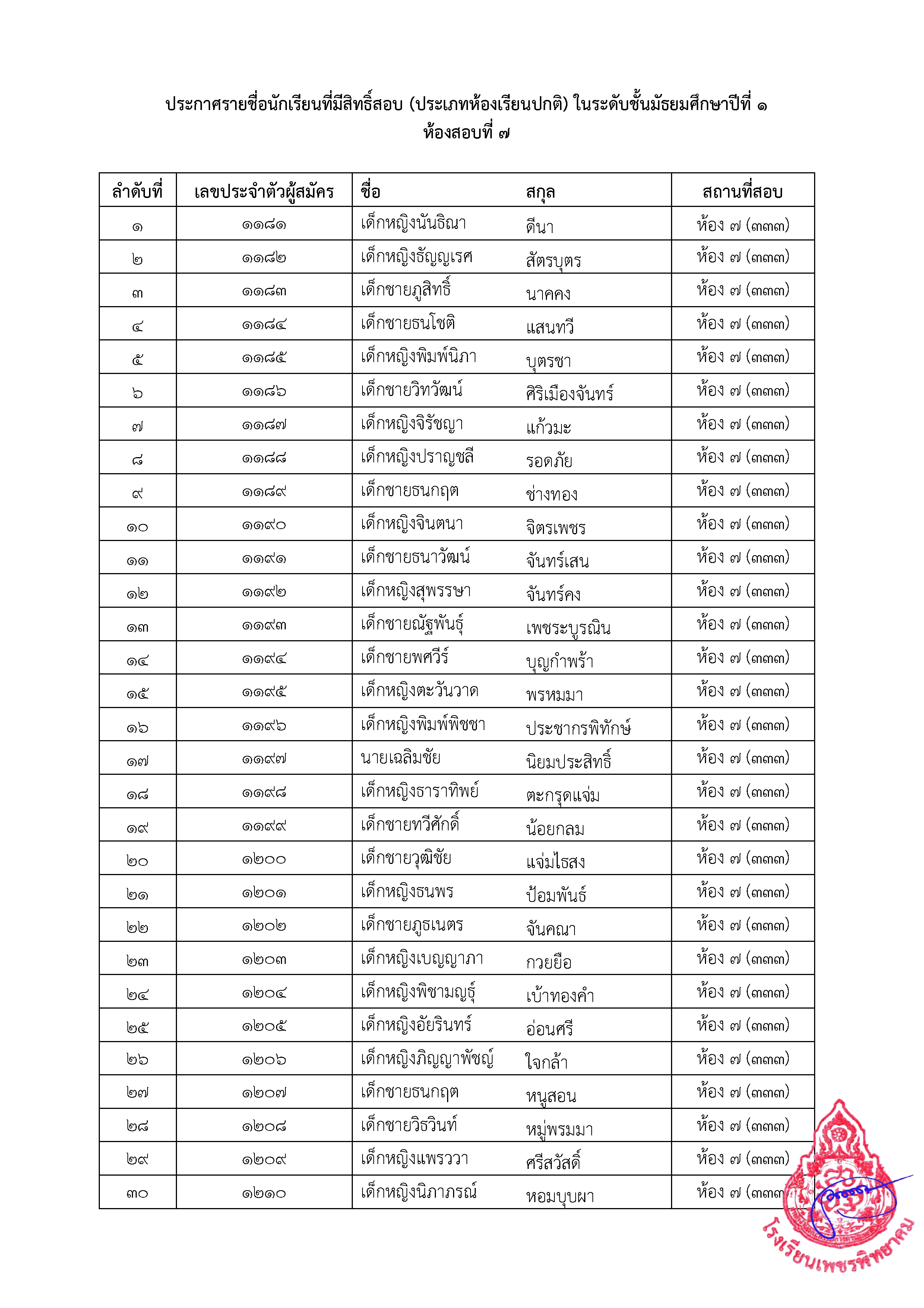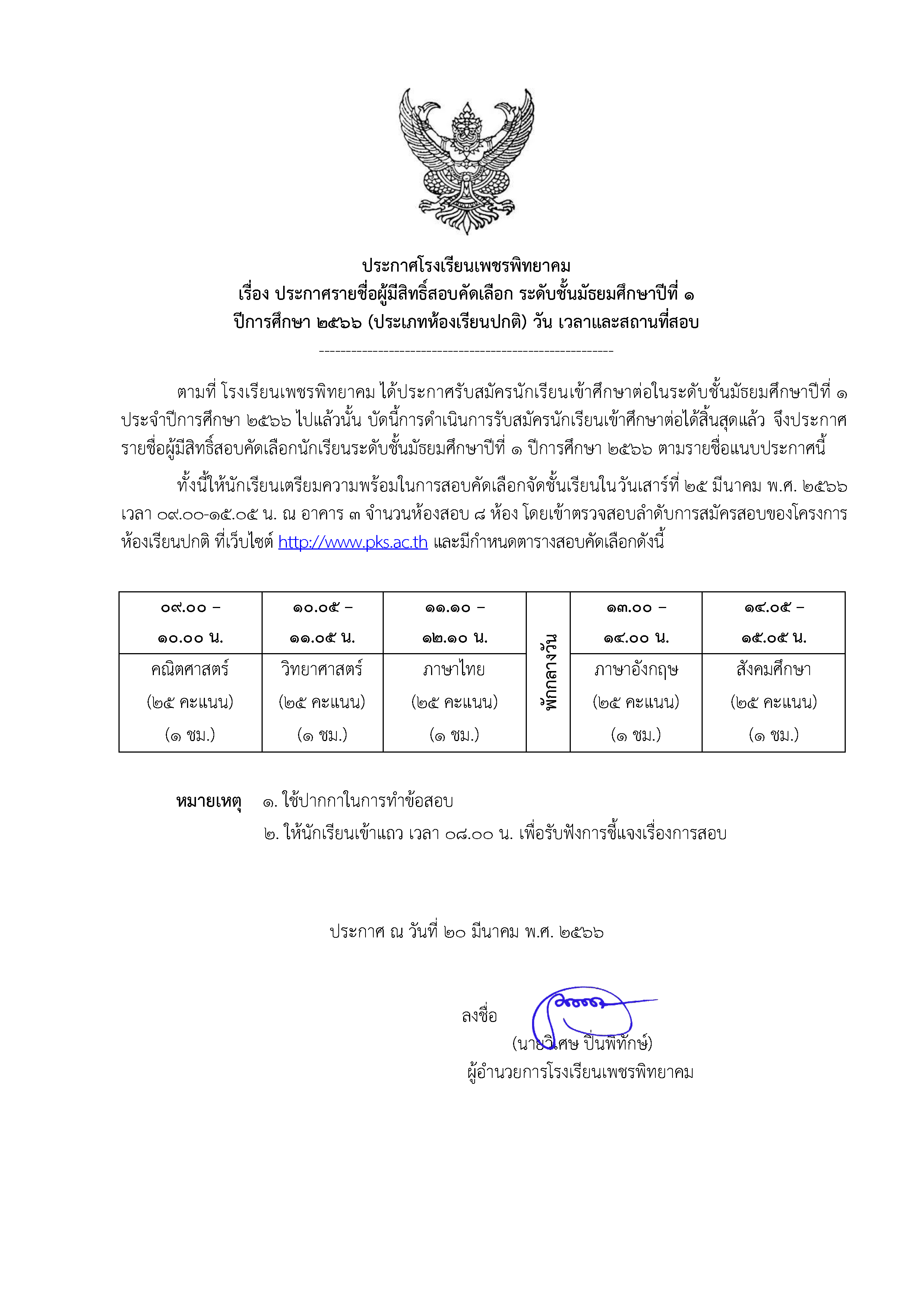 ประกาศโรงเรียนเพชรพิทยาคม เรื่อง ประกาศรายชื่อผู้มีสิทธิ์สอบคัดเลือก ระดับชั้นมัธยมศึกษาปีที่ 1 ปีการศึกษา 2566 (ประเภทห้องเรียนปกติ) วัน เวลาและสถานที่สอบ