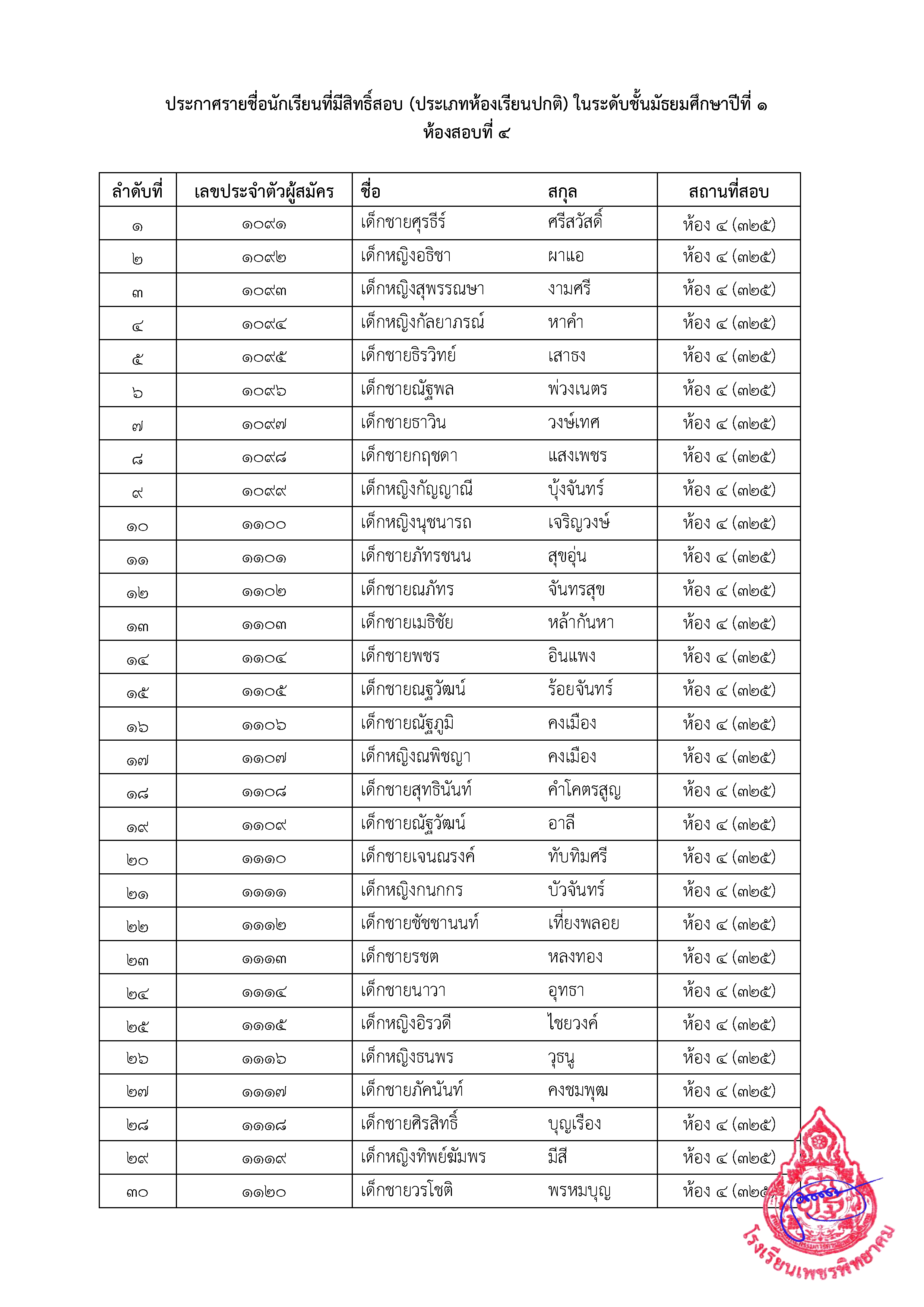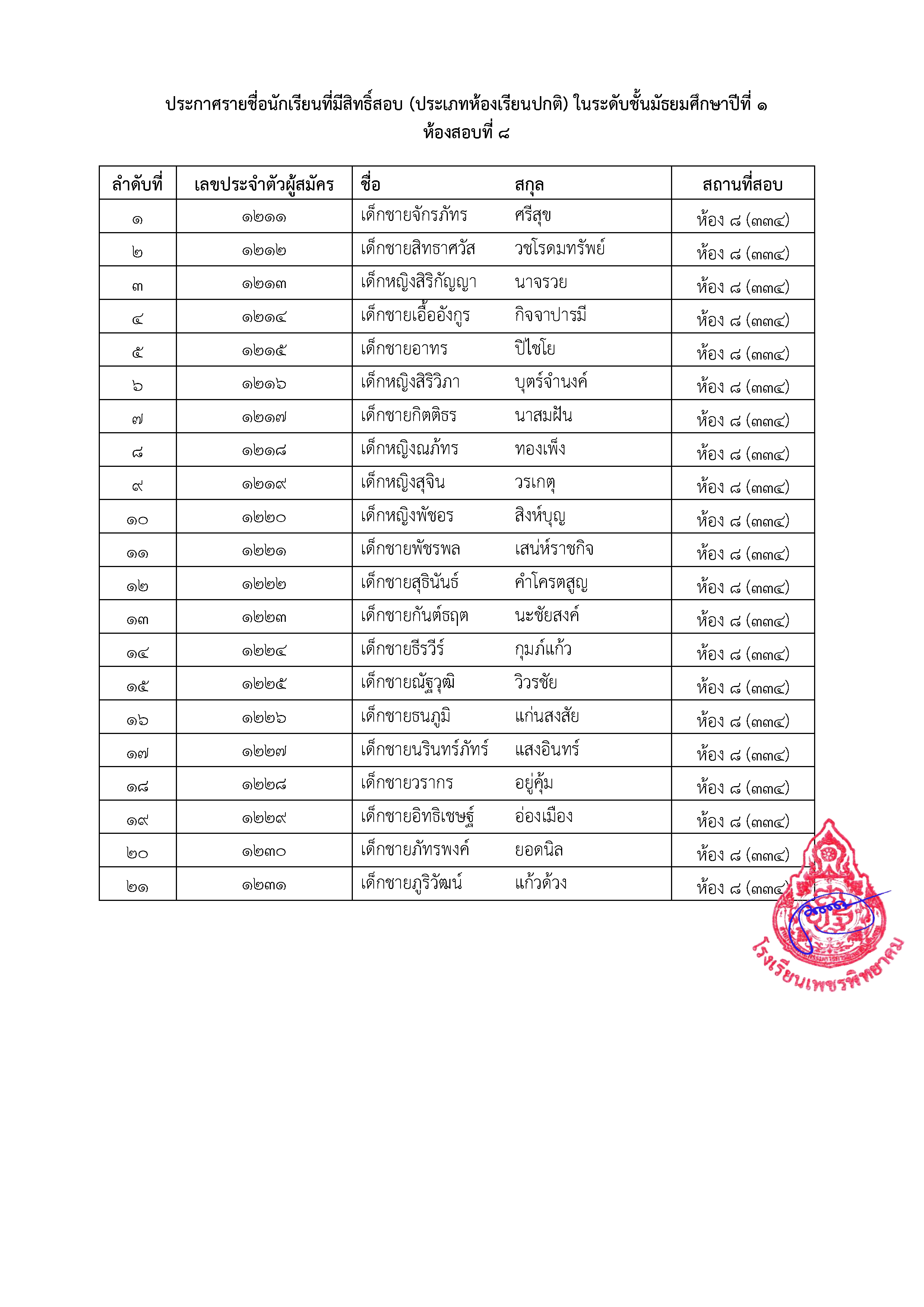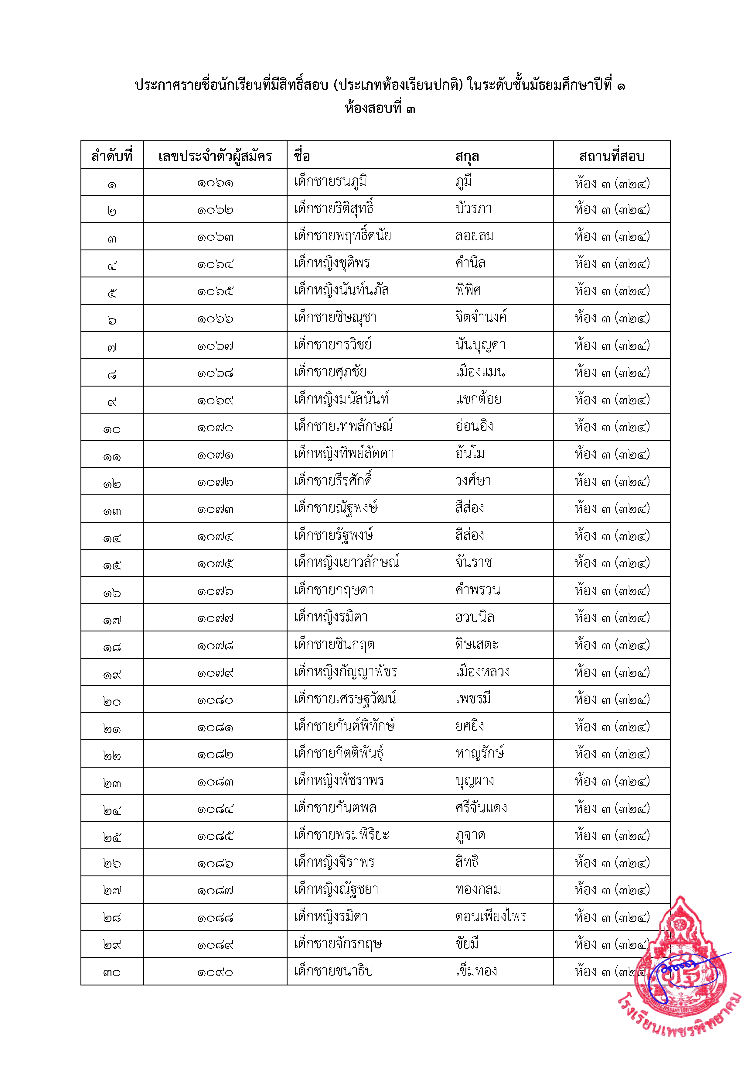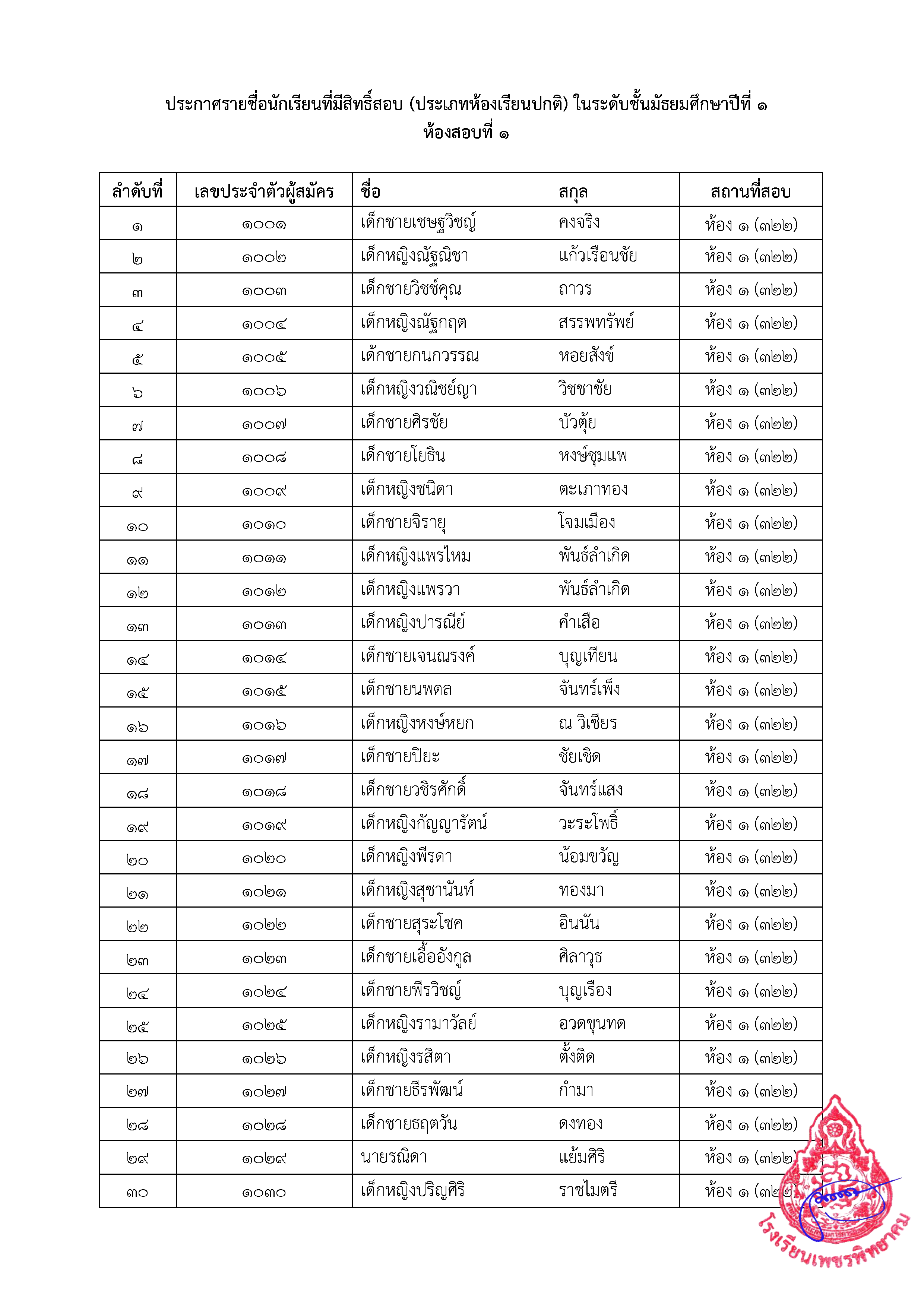 เรื่อง ประกาศรายชื่อผู้มีสิทธิ์สอบคัดเลือก ระดับชั้นมัธยมศึกษาปีที่ 1