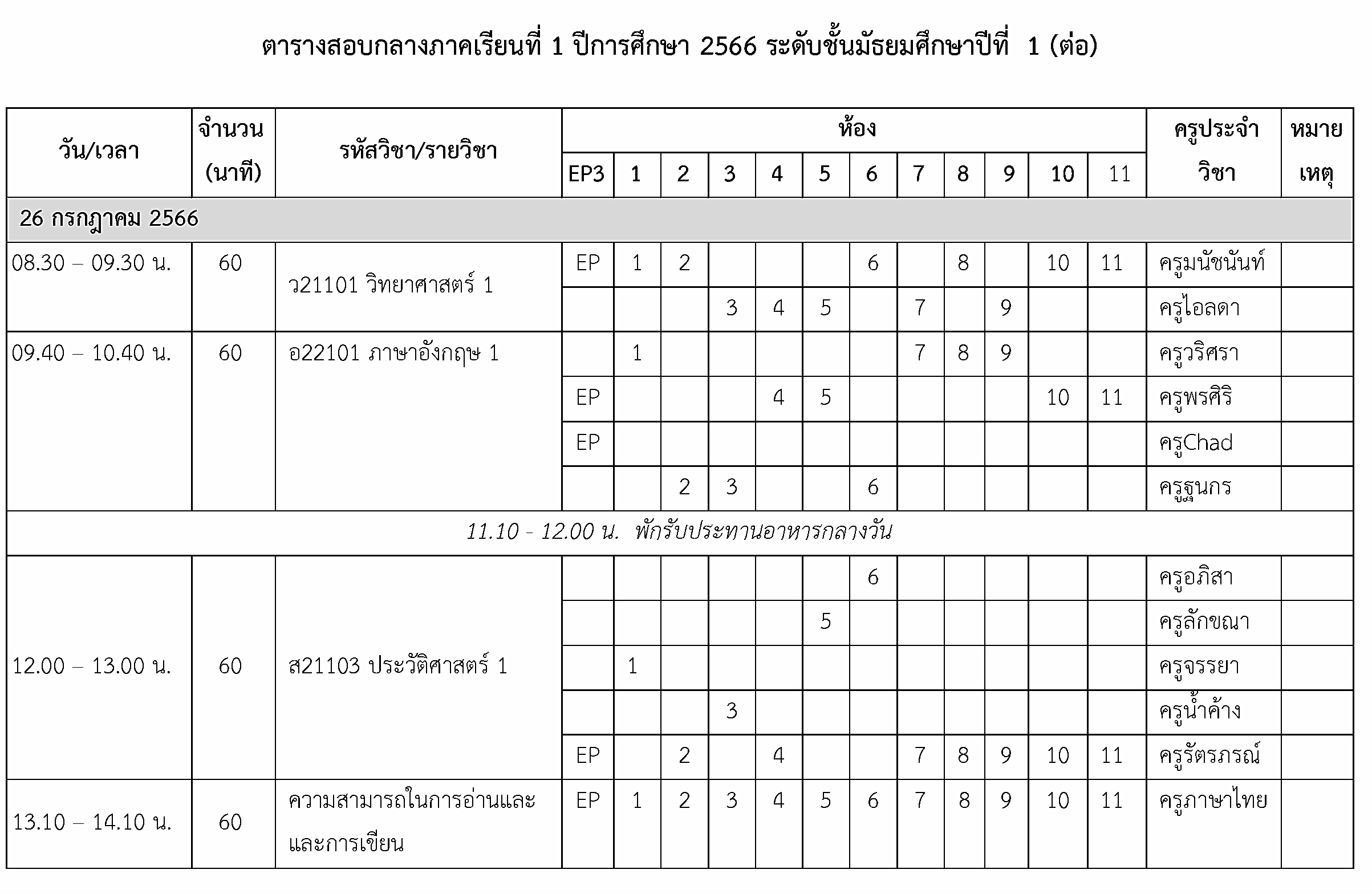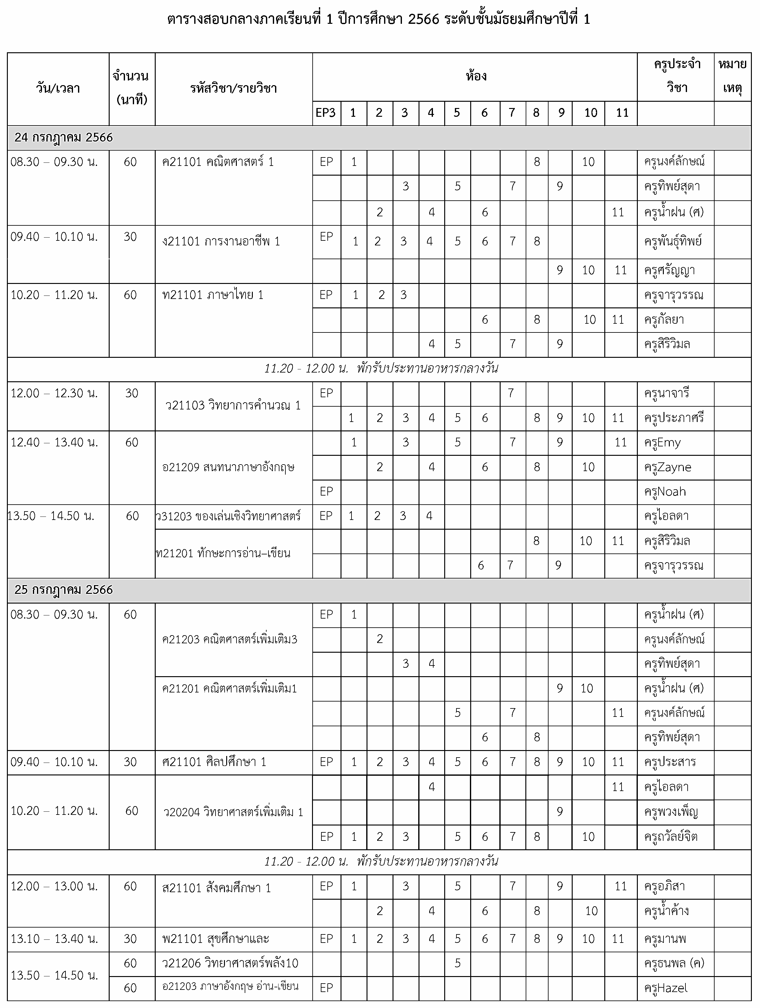 ตารางสอบกลางภาคเรียนที่ 1 ปีการศึกษา 2566 ระดับชั้น ม.1