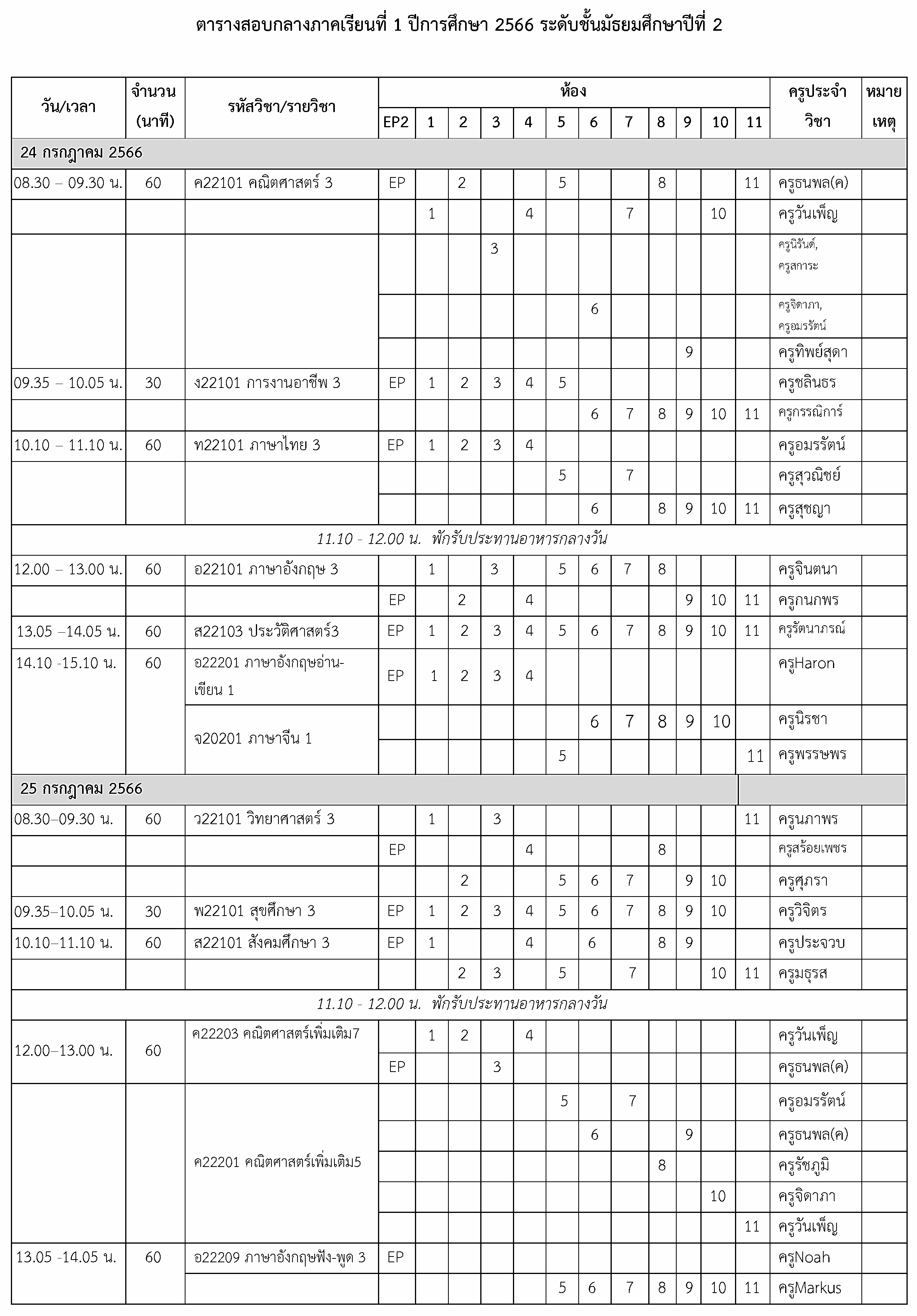 ตารางสอบกลางภาคเรียนที่ 1 ปีการศึกษา 2566 ระดับชั้น ม.2