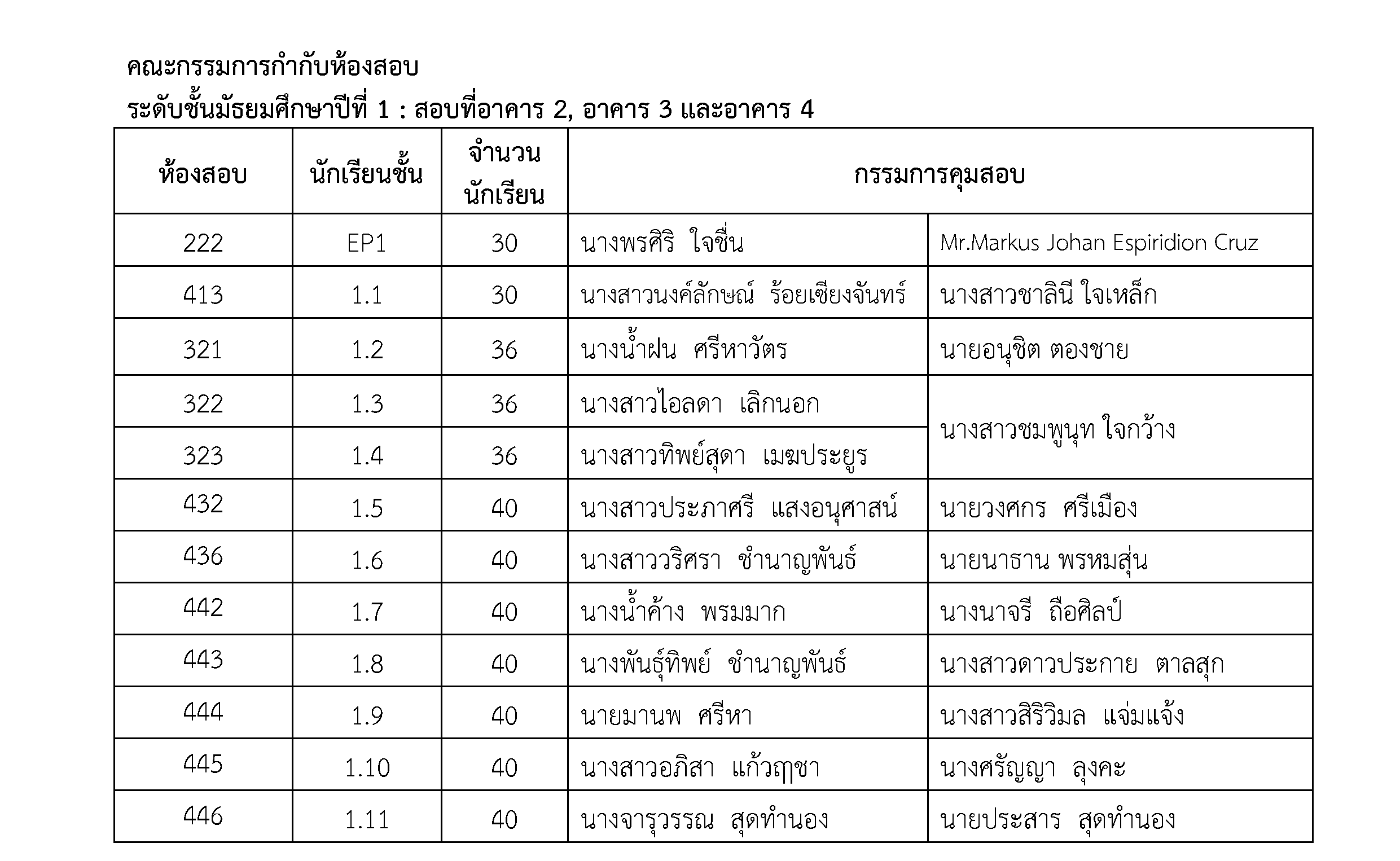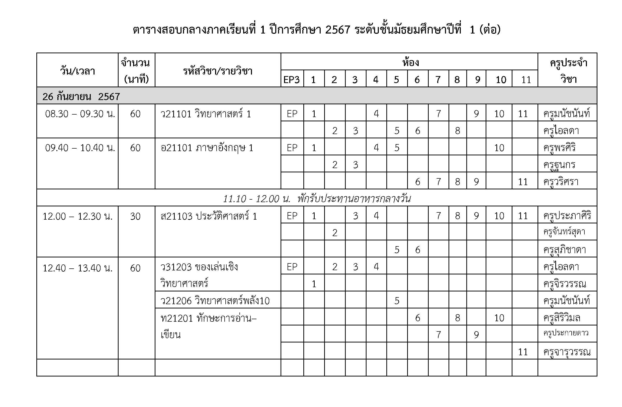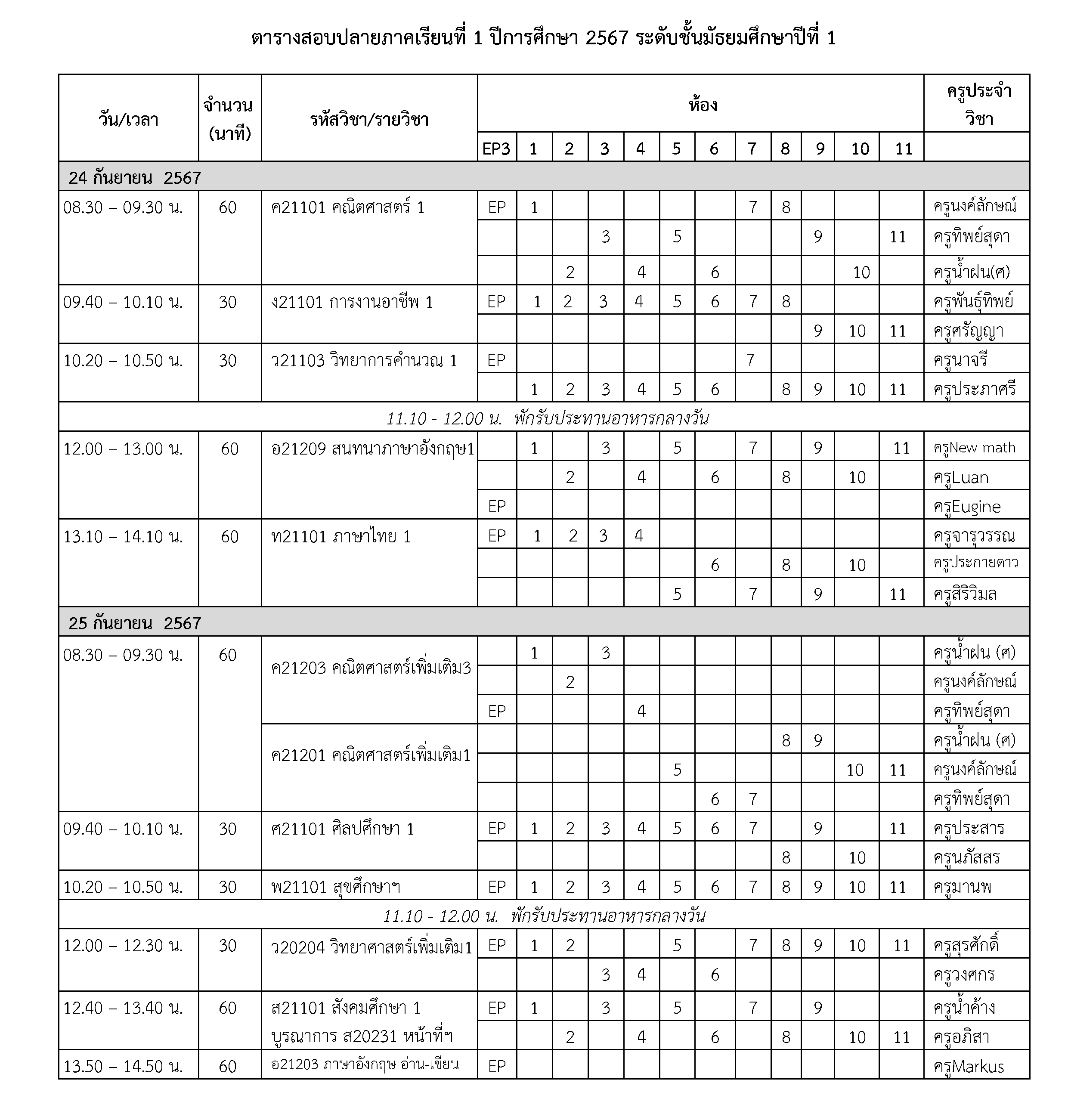 ตารางสอบปลายภาคเรียนที่ 1 ปีการศึกษา 2567 ระหว่างวันที่ 24-26 กันยายน 2567 ระดับชั้นมัธยมศึกษาปีที่ 1