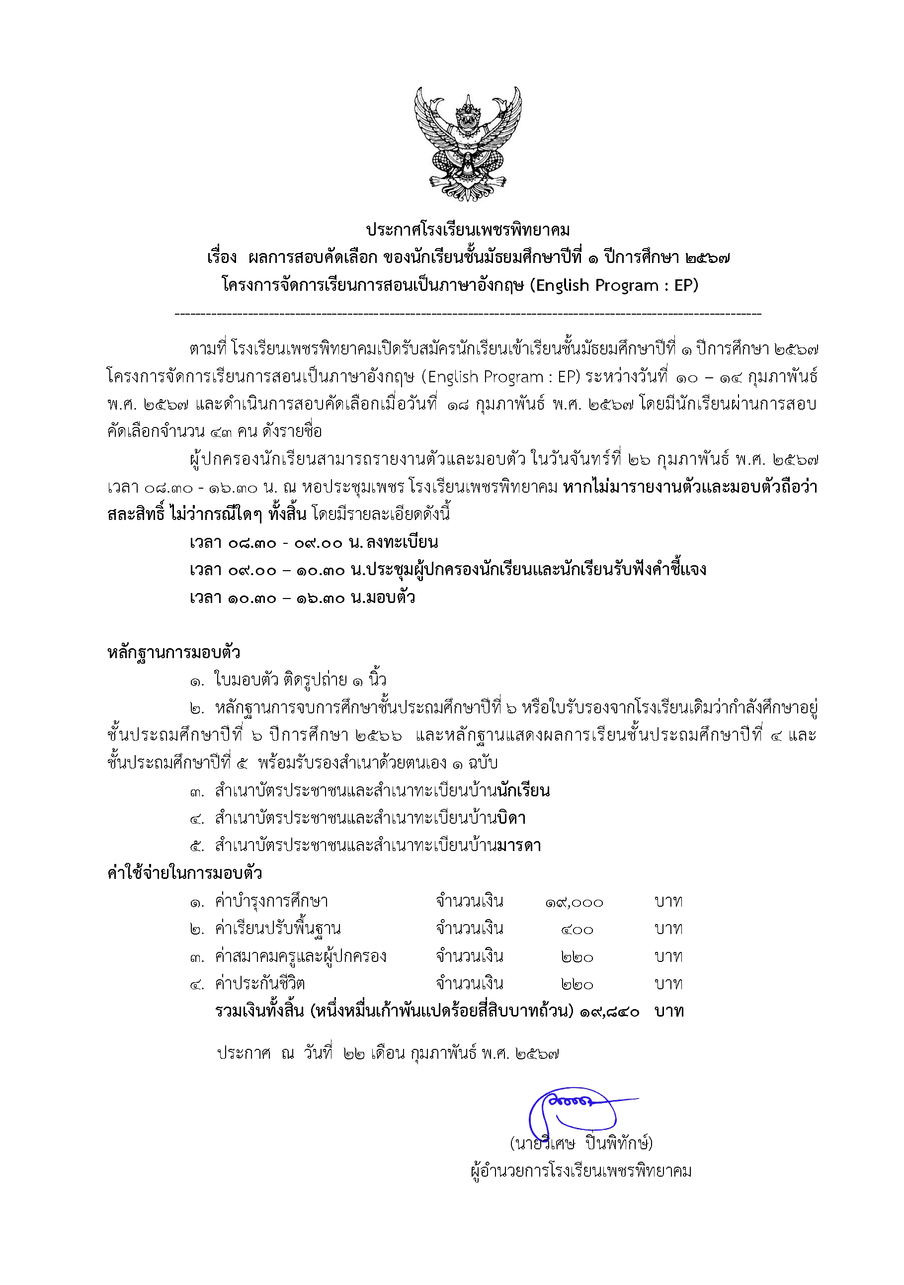 ประกาศโรงเรียนเพชรพิทยาคม เรื่อง ผลการสอบคัดเลือก ของนักเรียนชั้นมัธยมศึกษาปีที่ 1 ปีการศึกษา 2567 โครงการจัดการเรียนการสอนเป็นภาษาอังกฤษ (English Program : EP)