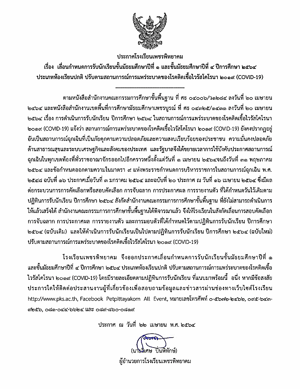 ประกาศโรงเรียนเพชรพิทยาคม เรื่อง เลื่อนกำหนดการรับนักเรียนชั้นมัธยมศึกษาปีที่ 1 และชั้นมัธยมศึกษาปีที่ 4 ปีการศึกษา 2564 ประเภทห้องเรียนปกติ ปรับตามสถานการณ์การแพร่ระบาดของโรคติดเชื้อไวรัสโคโรนา 2019 (COVID-19)