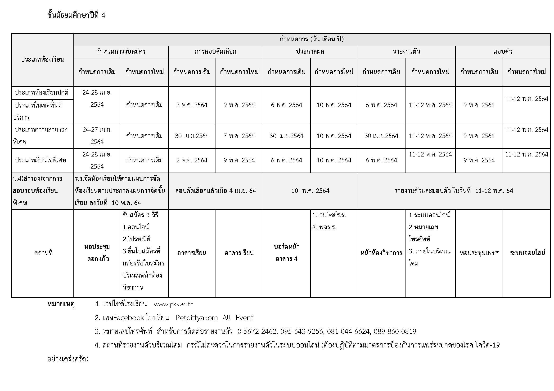 โรงเรียนเพชรพิทยาคม จึงออกประกาศเลื่อนกำหนดการรับนักเรียนชั้นมัธยมศึกษาปีที่ 1 และชั้นมัธยมศึกษาปีที่ 4 ปีการศึกษา 2564 ประเภทห้องเรียนปกติ ปรับตามสถานการณ์การแพร่ระบาดของโรคติดเชื้อไวรัสโคโรนา 2019 (COVID-19) โดยมีรายละเอียดตามปฏิทินการรับนักเรียน ที่แนบมาพร้อมนี้ อนึ่ง หากมีข้อสงสัยประการใดให้ติดต่อประสานงานผู้ที่เกี่ยวข้องเพื่อสอบถามข้อมูลและข่าวสารผ่านช่องทางเว็บไซต์โรงเรียน http://www.pks.ac.th, Facebook Petpittayakom All Event, หมายเลขโทรศัพท์ 0-5672-2562, 095-643-9256 , 081-044-6624 และ 089-860-0819